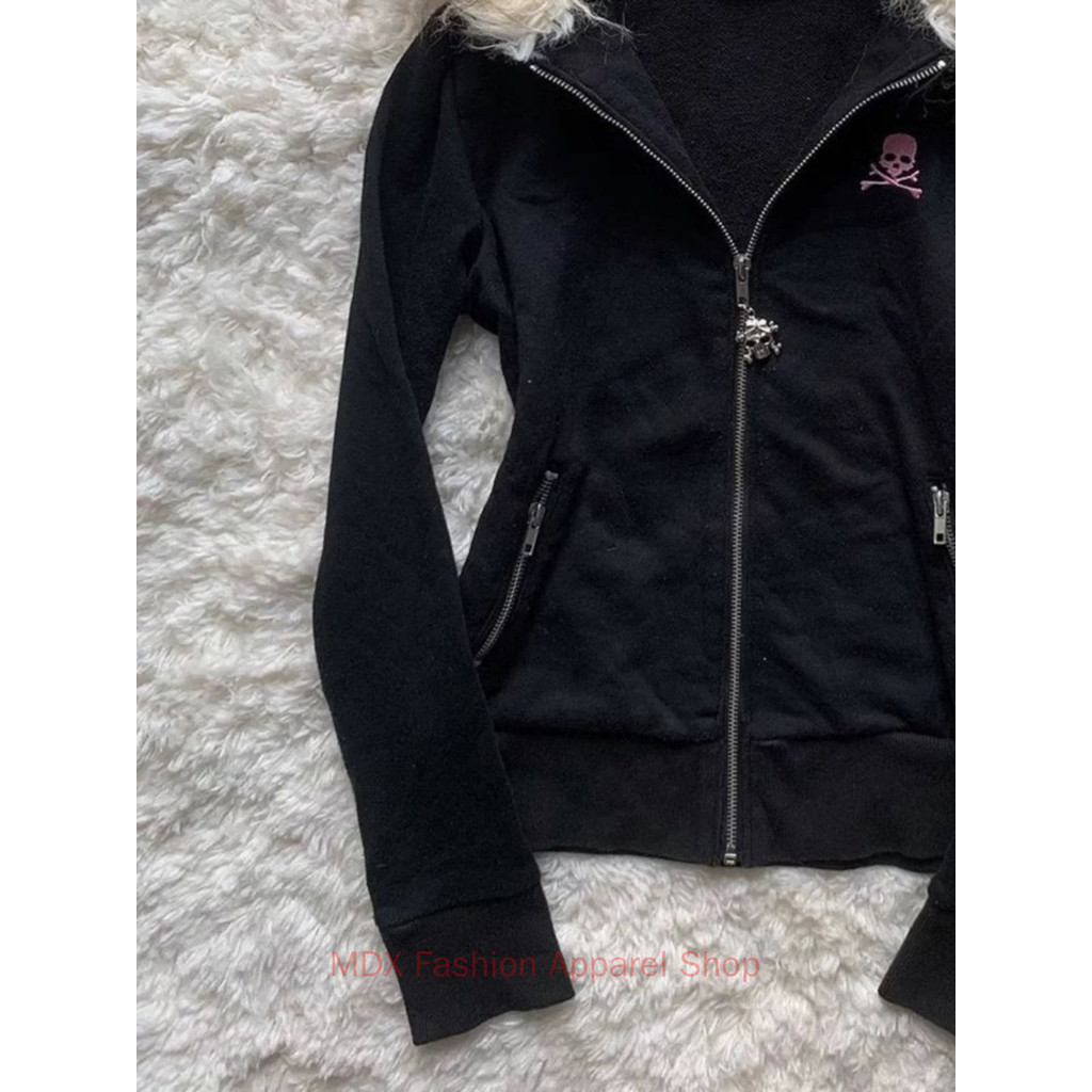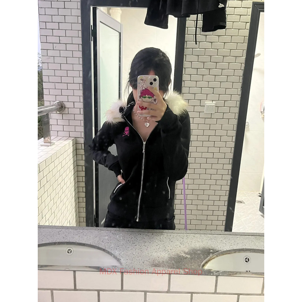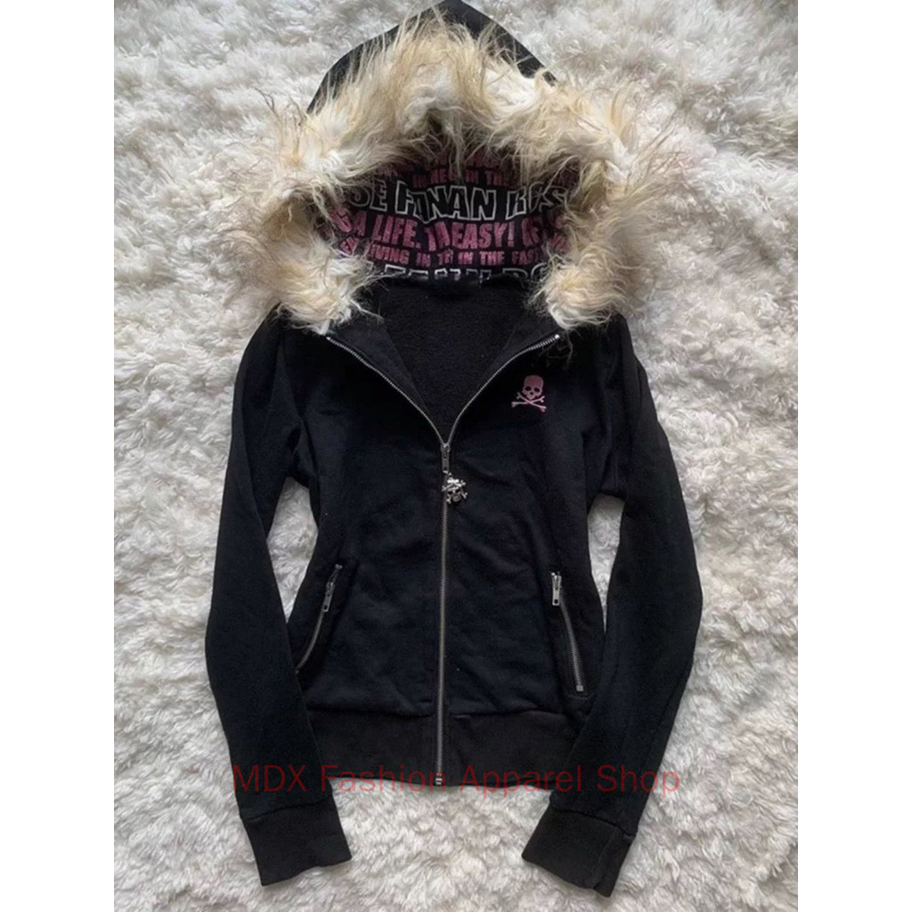 Marca Japonesa Preta Carta Impressa Jaqueta Com Zíper Capuz Para Mulheres Outono E Inverno Design De Pele Nicho Topo