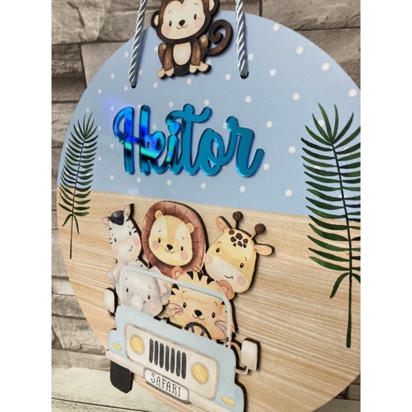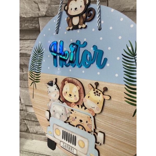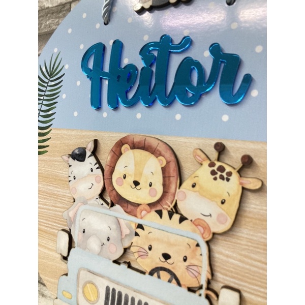 Guirlanda Enfeite de porta maternidade Safari azul nome em acrilico espelhado