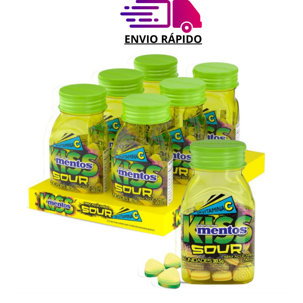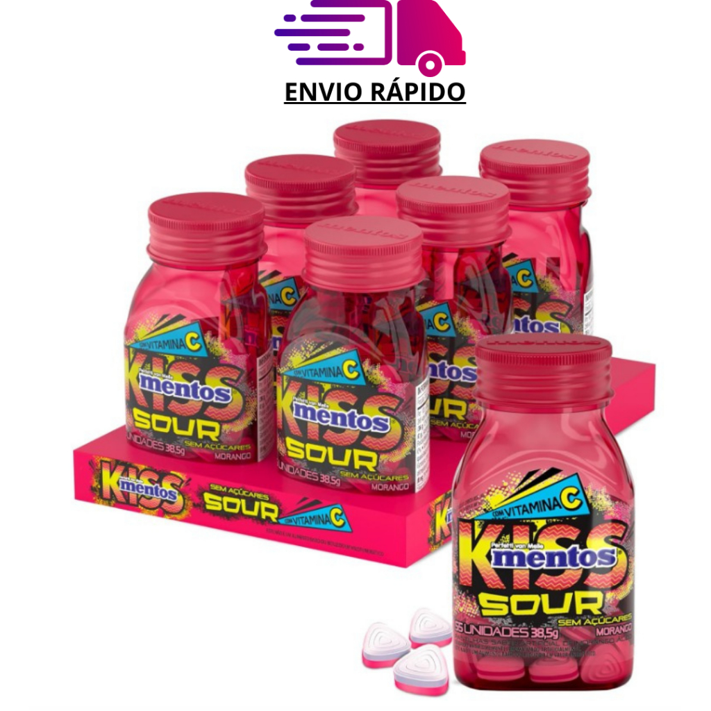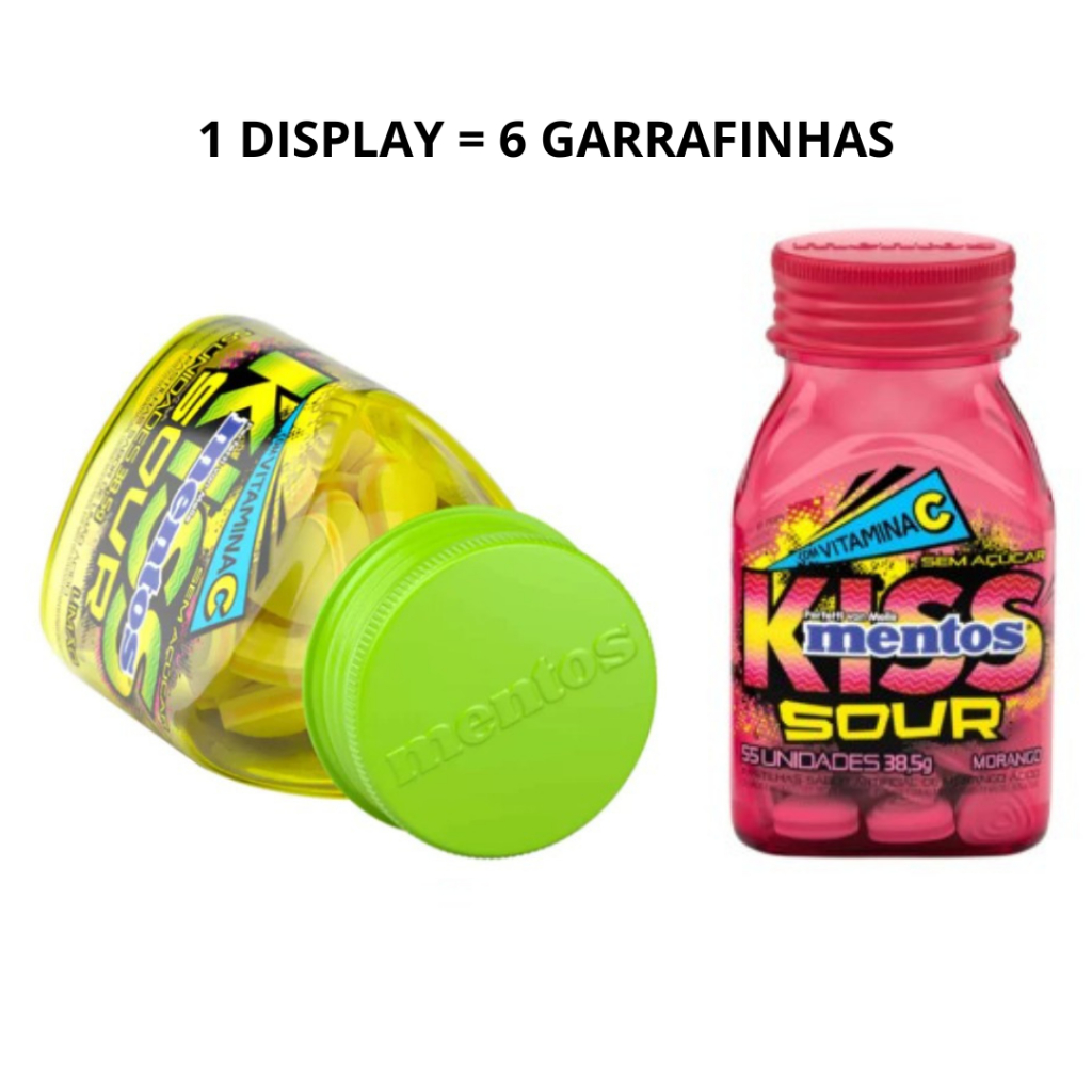 Display Bala Mentos Kiss Sour Limão Morango 38,5g Pastilha Drops Sem Açúcar Vitamina C