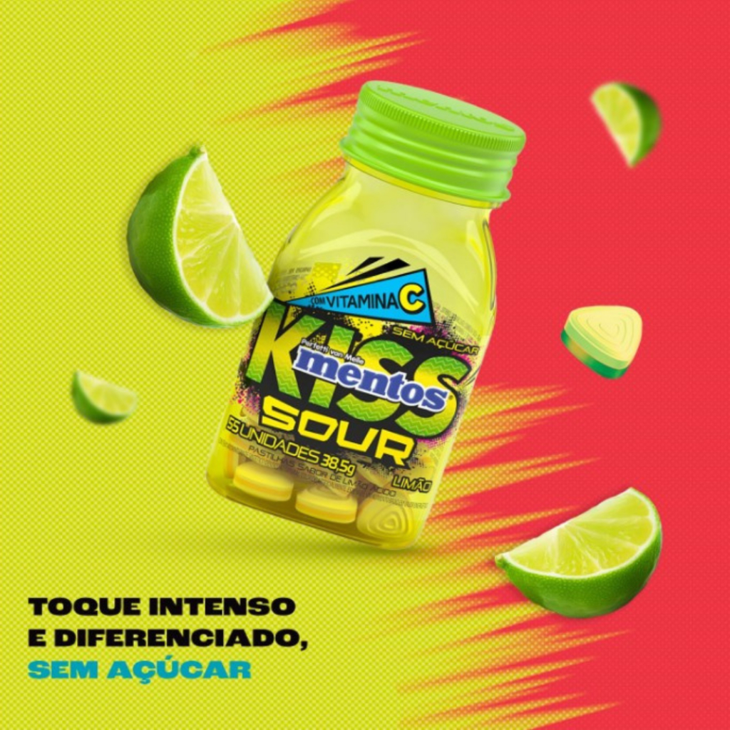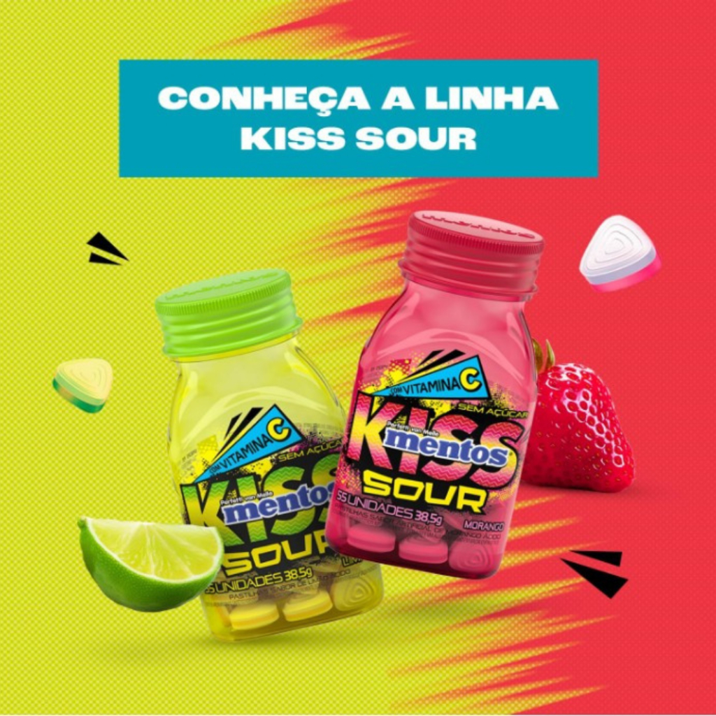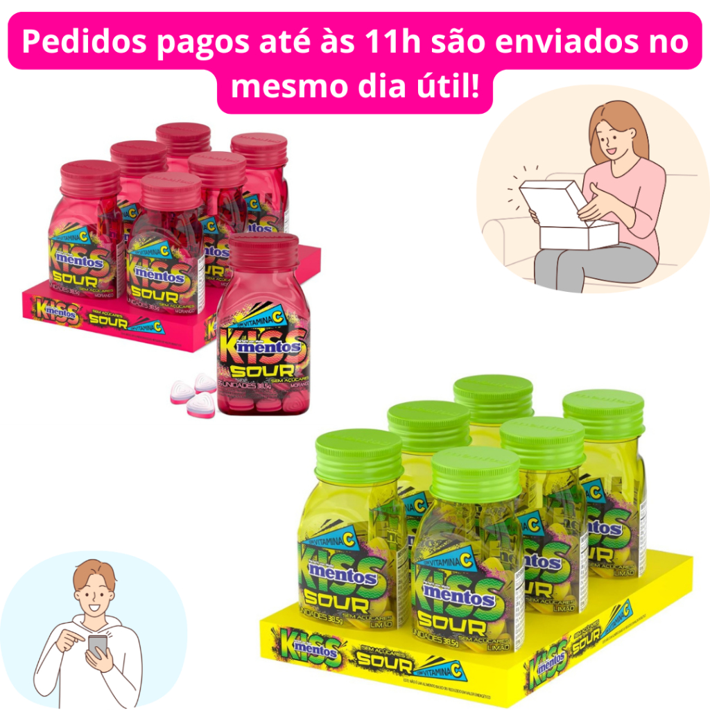 Display Bala Mentos Kiss Sour Limão Morango 38,5g Pastilha Drops Sem Açúcar Vitamina C