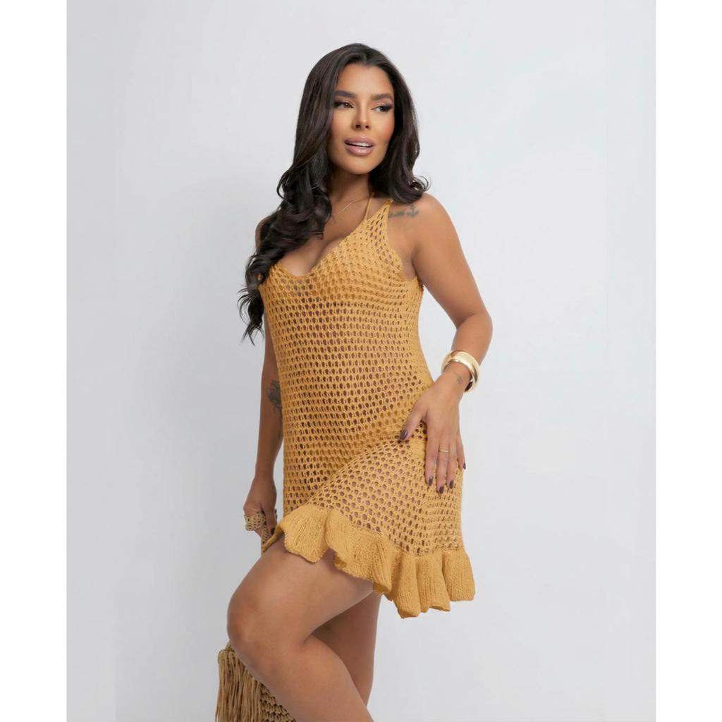 Vestido Saída Praia Tricot Curto Babado Saia rodada Furos Chique Elegante Alça fina Médio