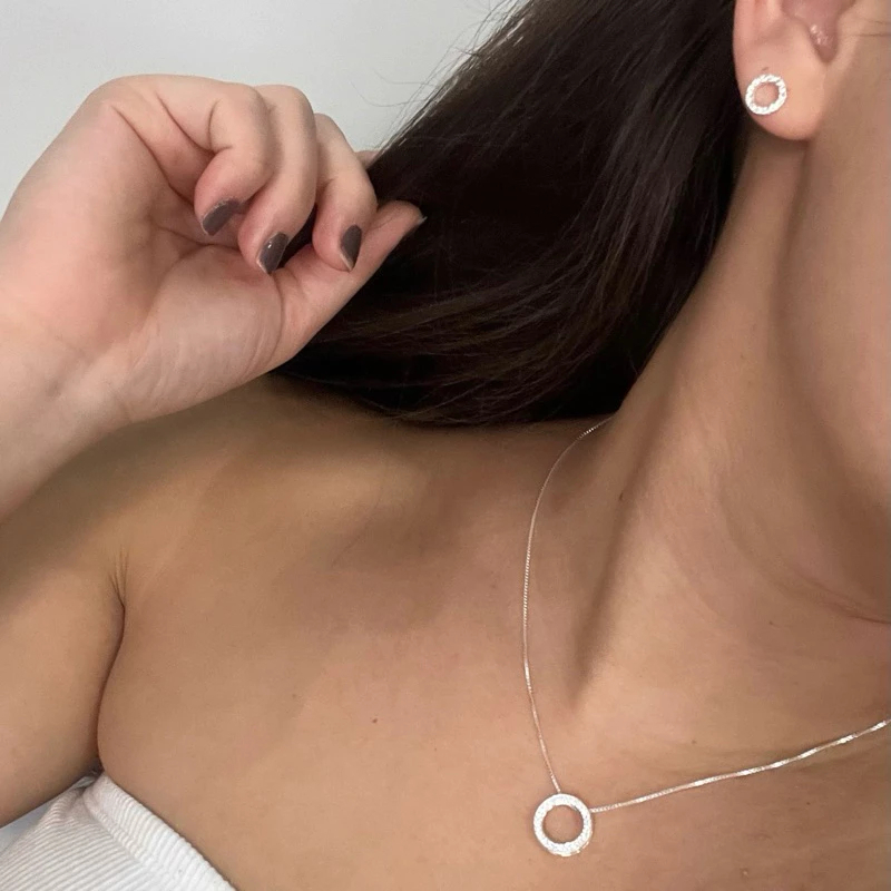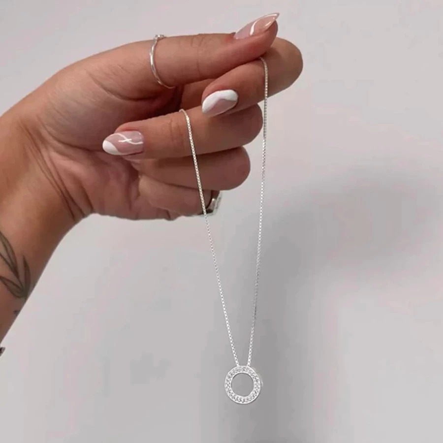 Colar em Prata Cravejado Pingente Redondo Corrente Banhado A Prata 925