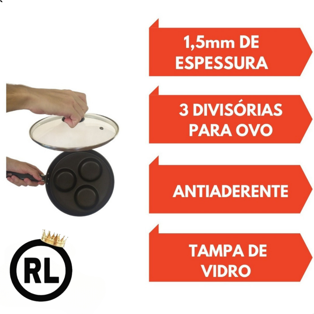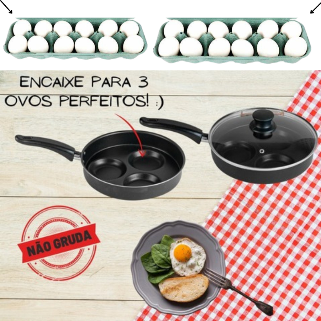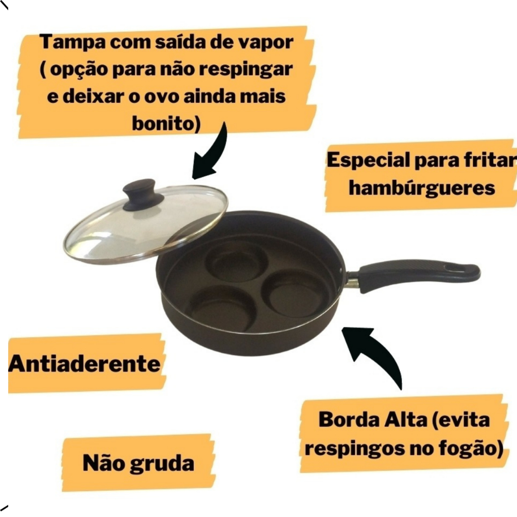 Frigideira que Frita 3 Ovos Hamburg Mini Pizza Antiaderente com Tampa Vidro de Luxo.