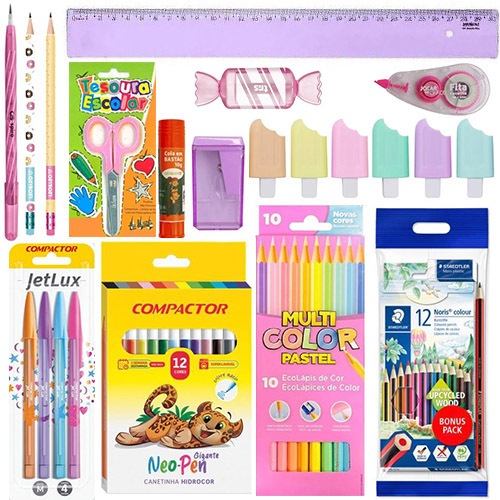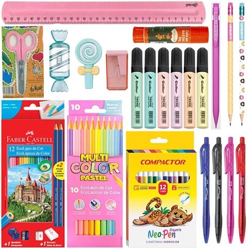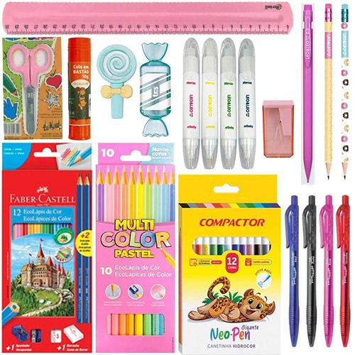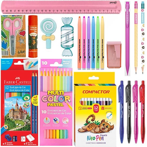 Kit 57 Peças Escolar Infantil Juvenil Lapis De Cor Pastel Faber Castell Staedtler Caneta Cola Femini