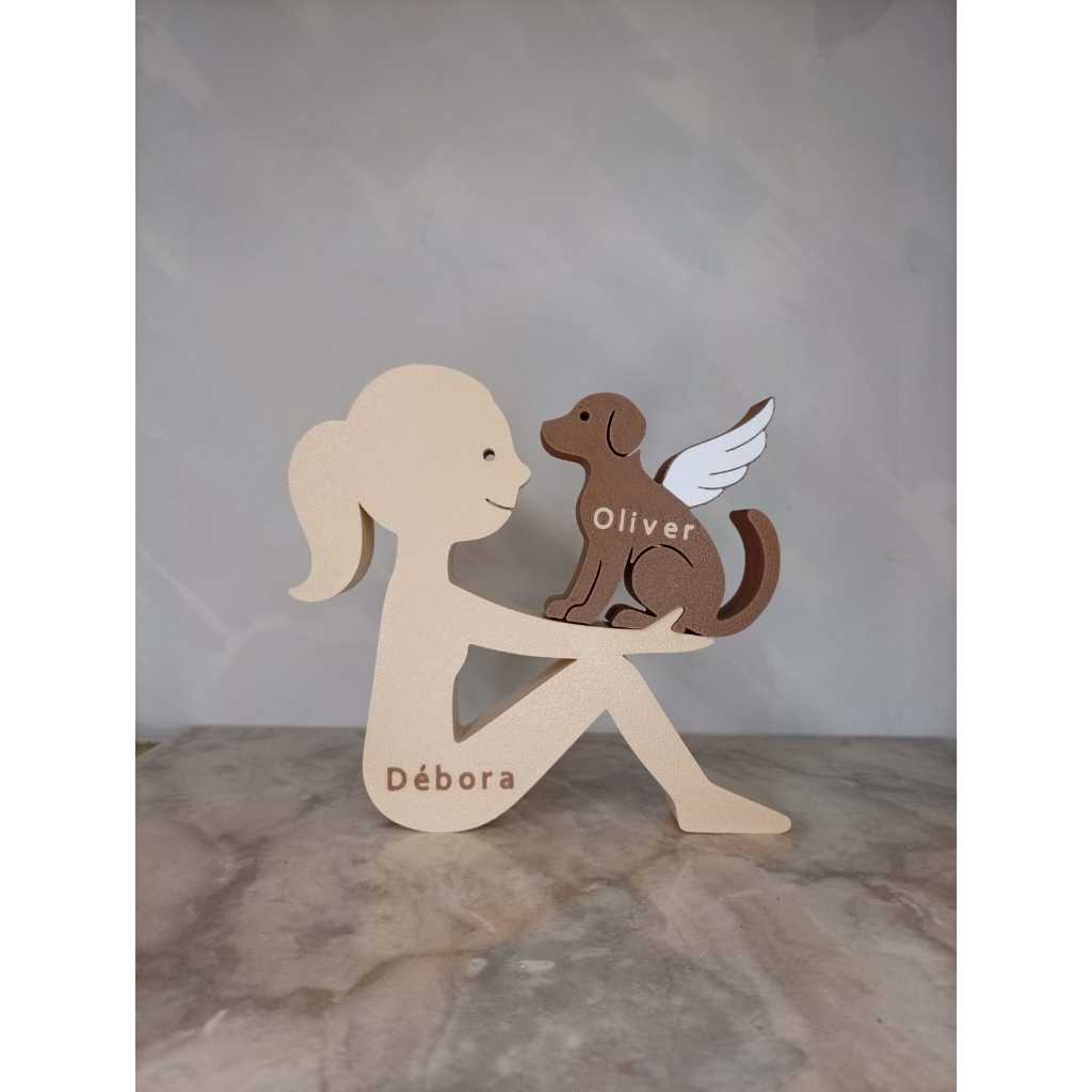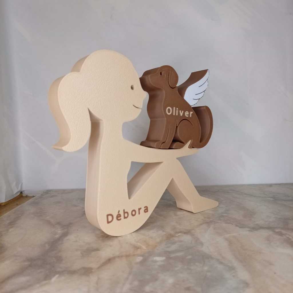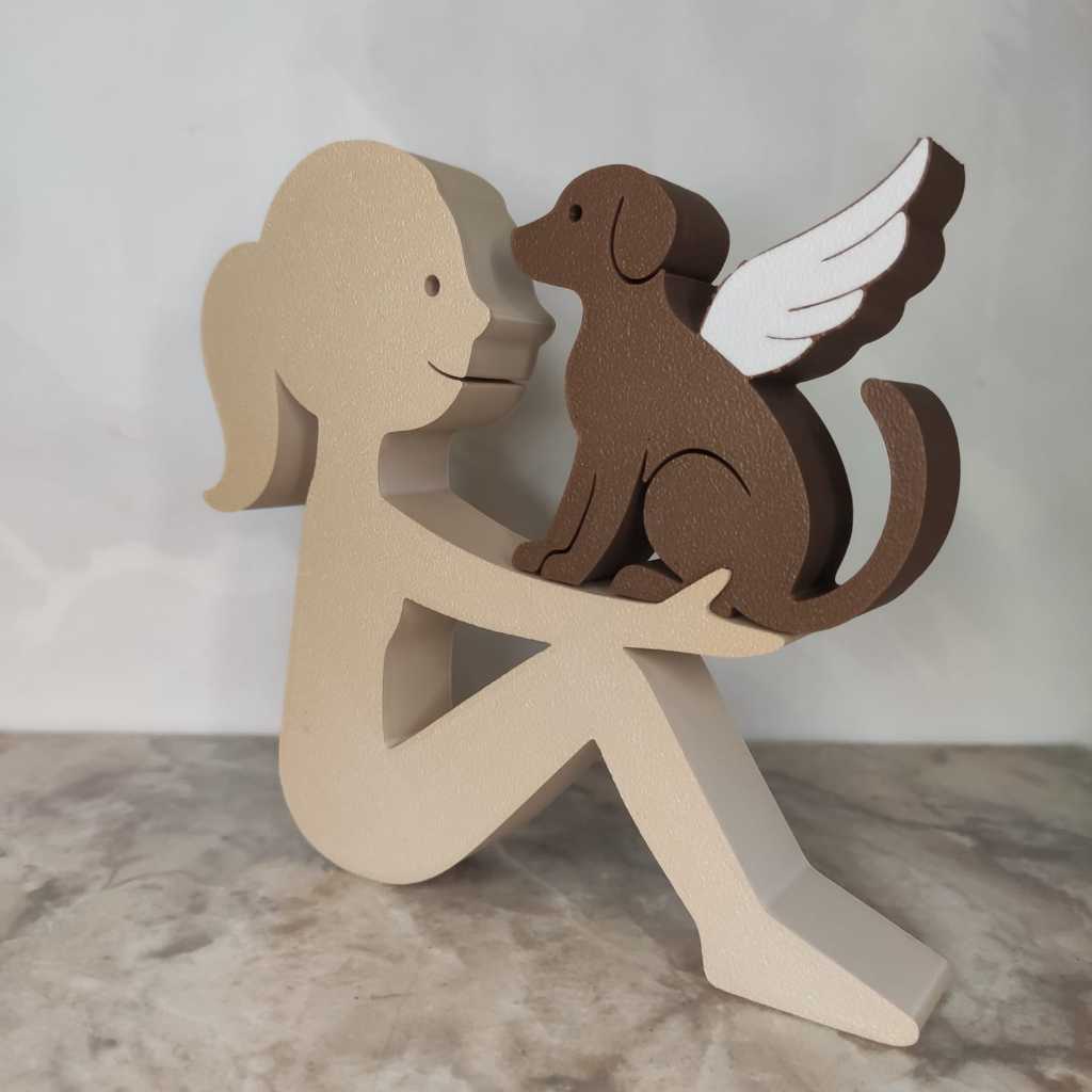 Escultura Decorativa Menina com Cachorro de Asas ou Normal – Cachorro Anjo - Impressão 3D