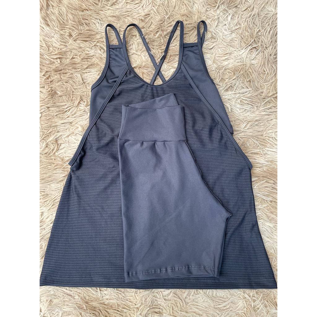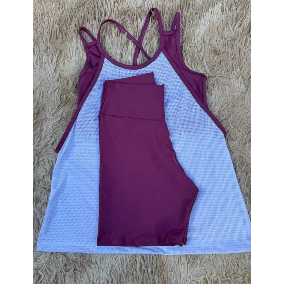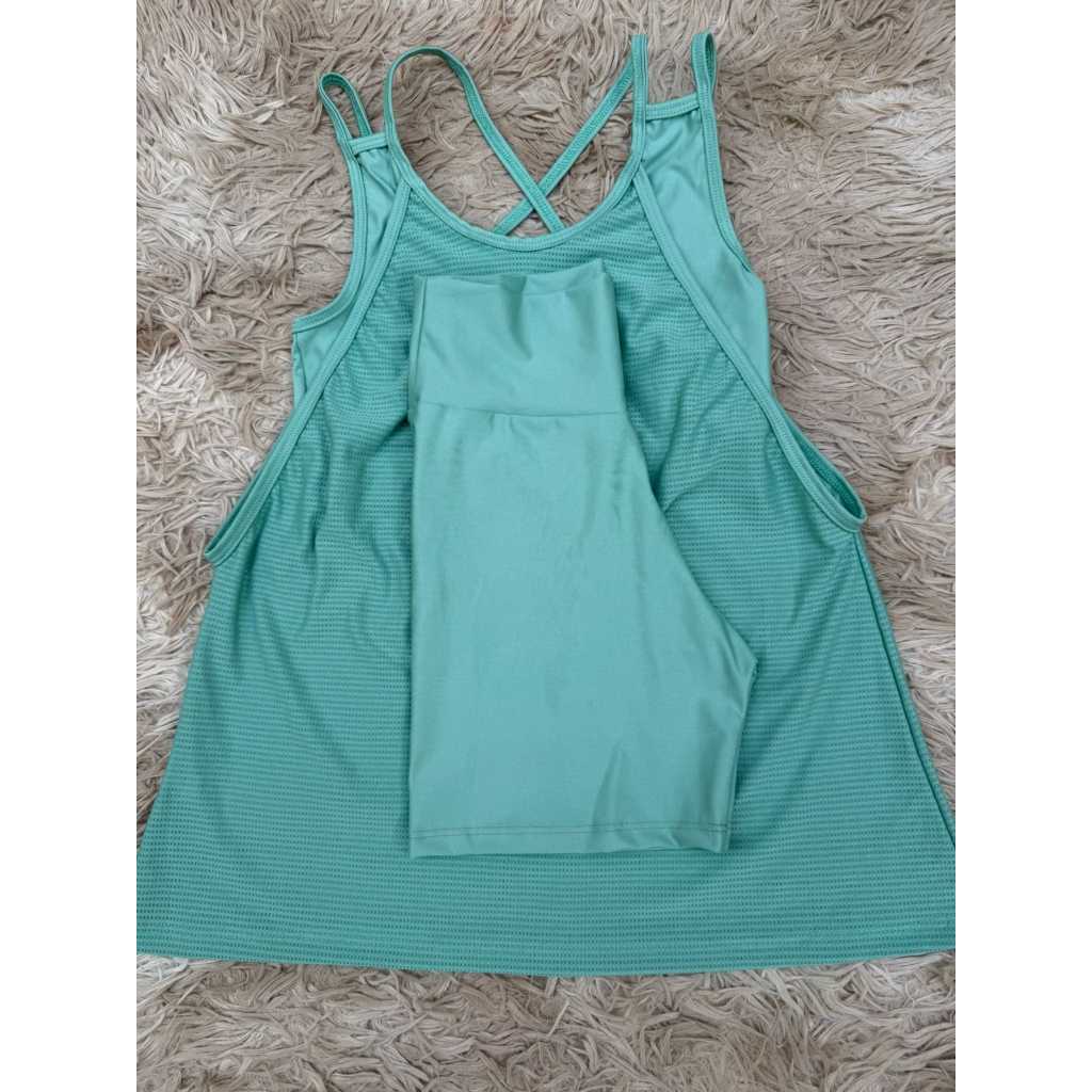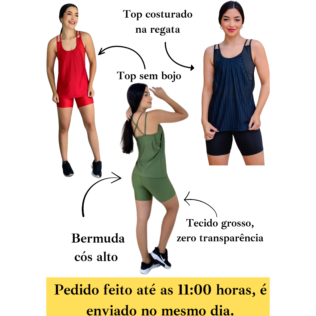 Kit academia conjunto fitness trio bermuda short regata e top sem bojo academia zero transparência