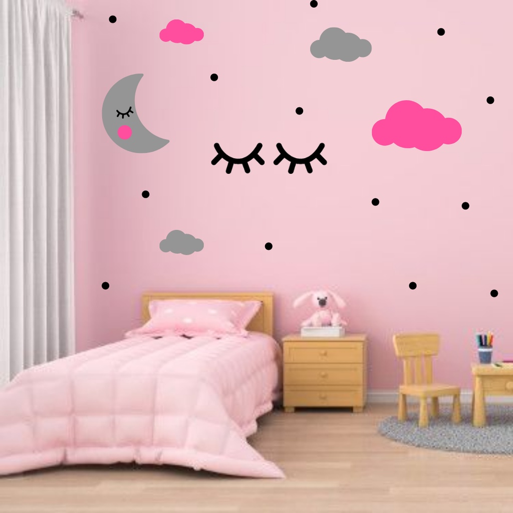 57 Adesivos parede nuvens lua e bolinhas par de cílios olhinhos menina quarto infantil feminino