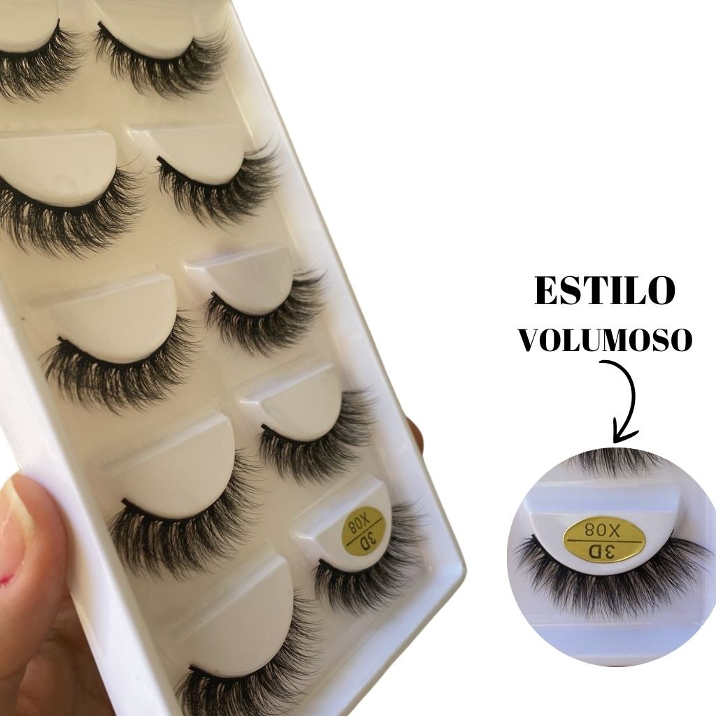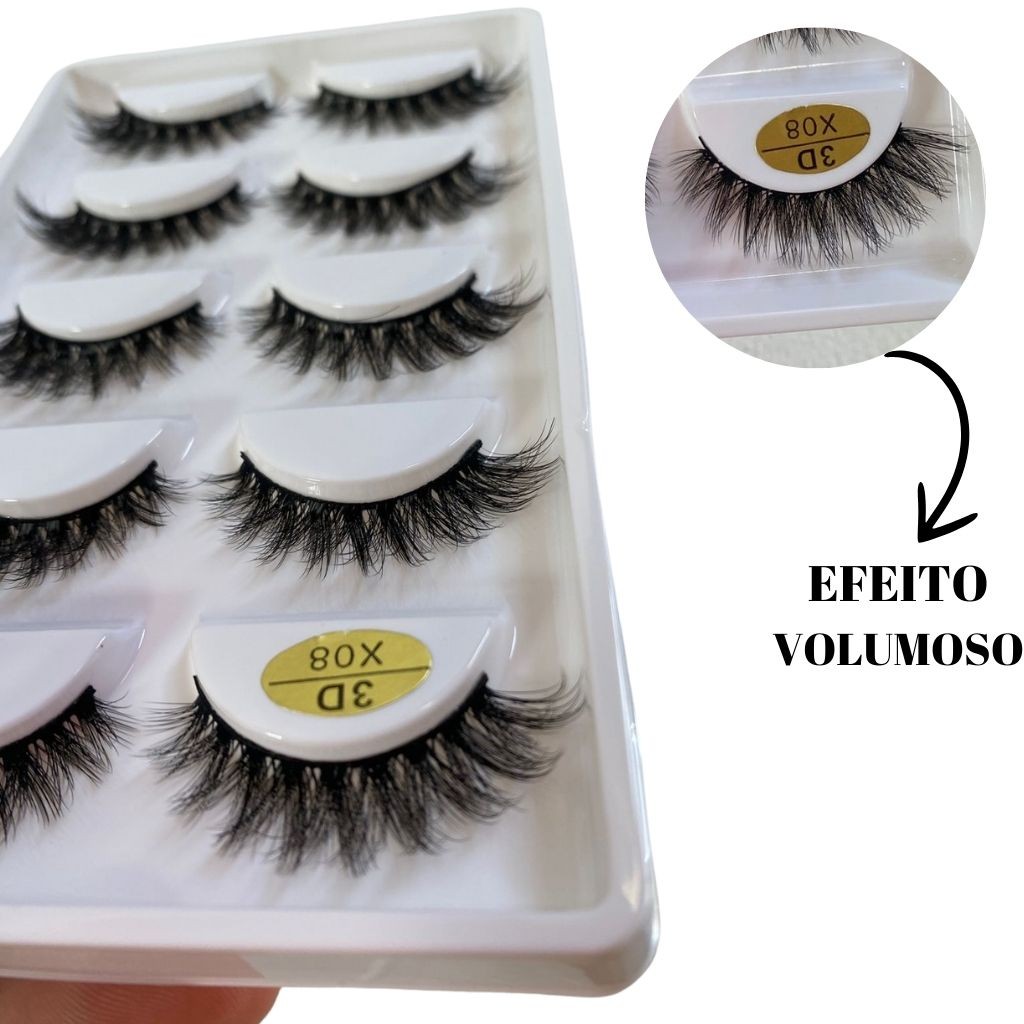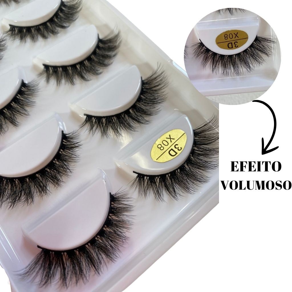 Cartela com 5 Pares de Cílios Postiços 3D X08 efeito volumoso