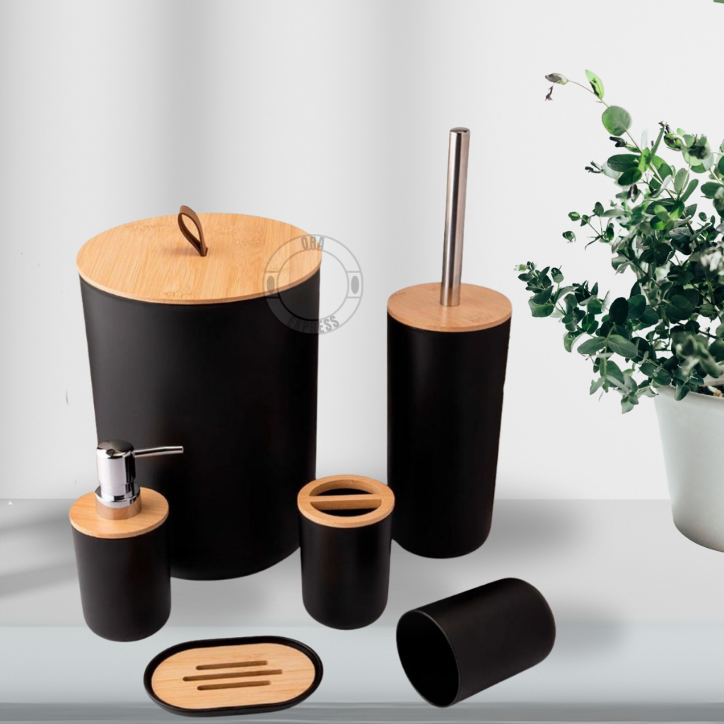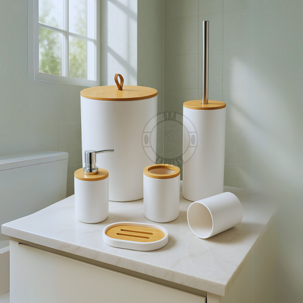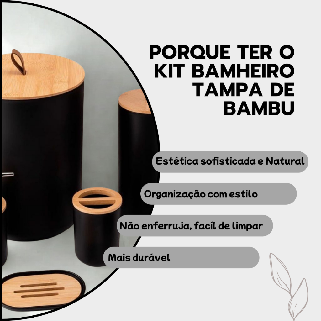Kit Banheiro Conjunto Acessórios Higiene Lixeira Lavabo 6 Luxo Peças Tampa Bambu Escova Sanitária