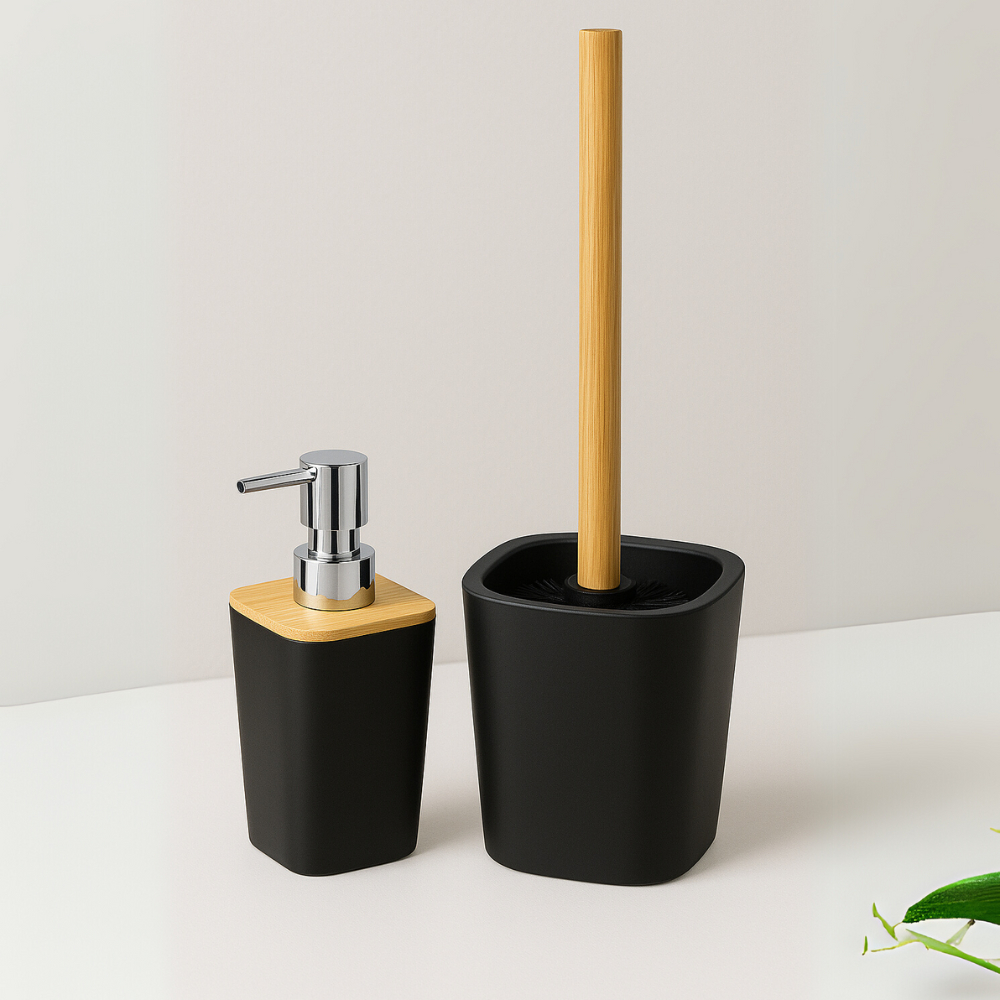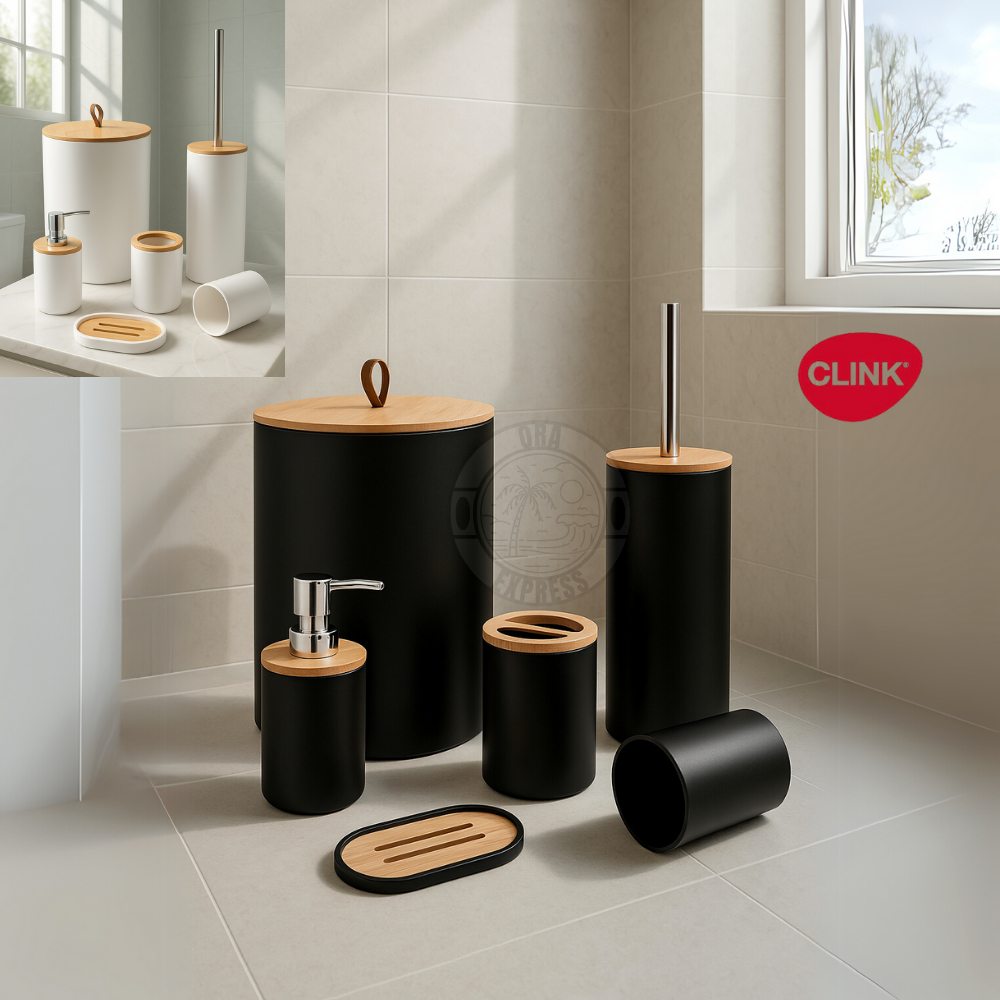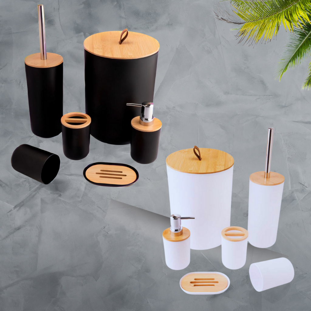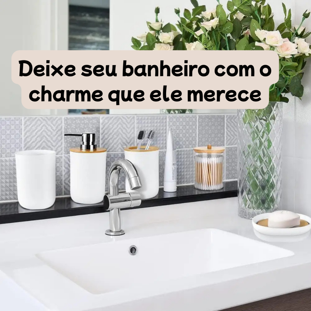 Kit Banheiro Conjunto Acessórios Higiene Lixeira Lavabo 6 Luxo Peças Tampa Bambu Escova Sanitária
