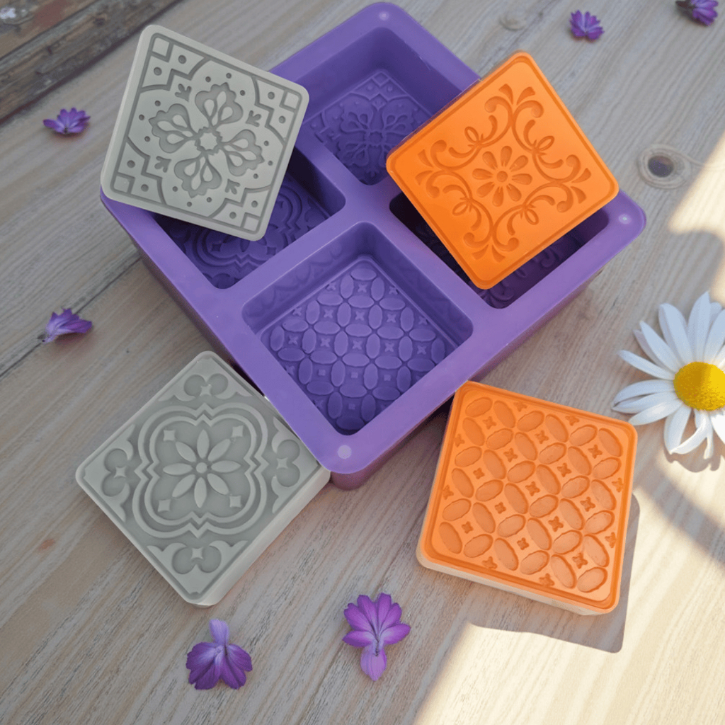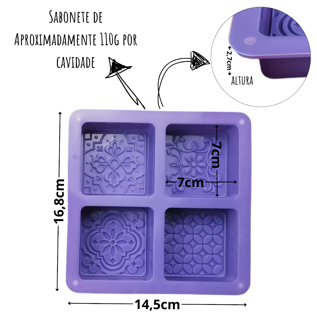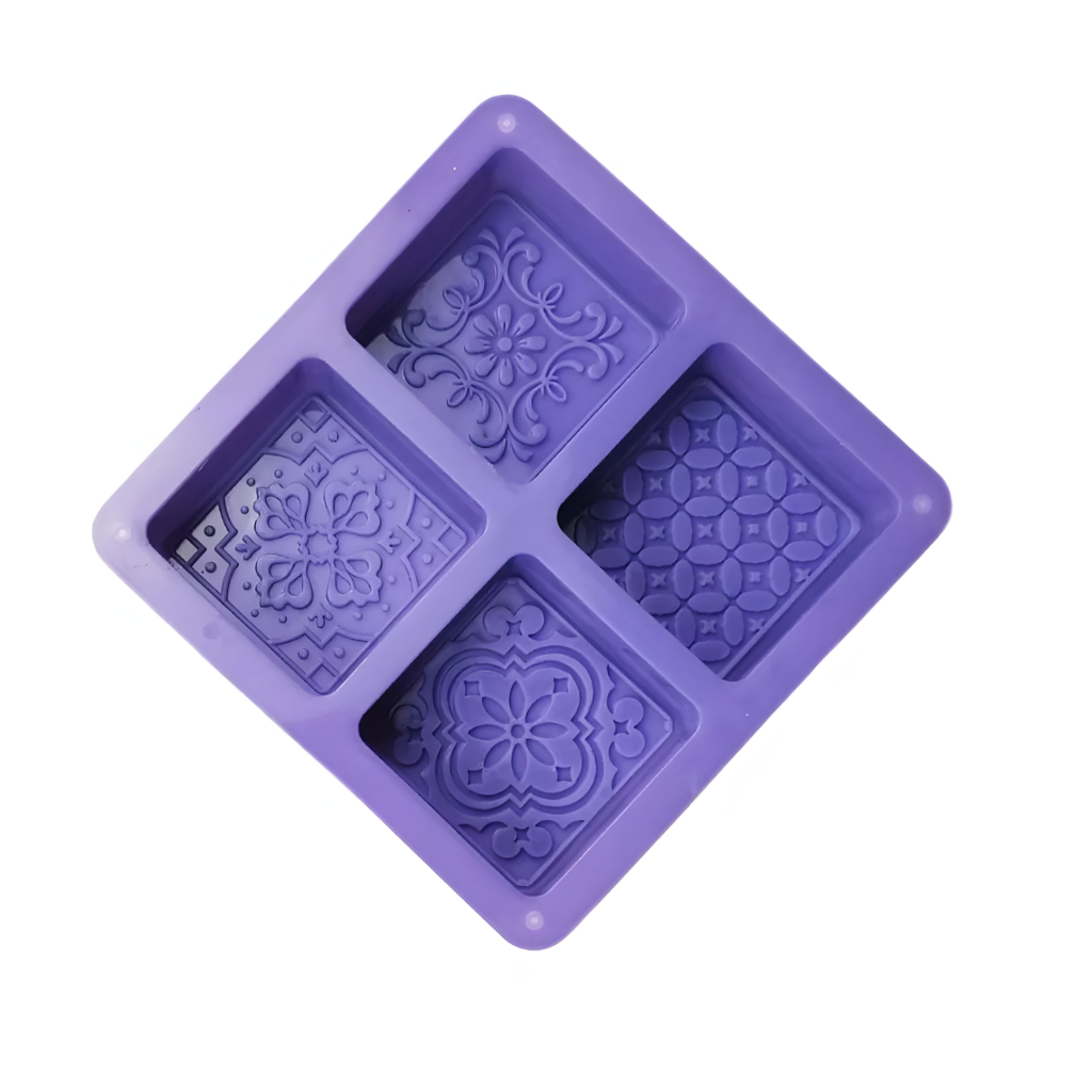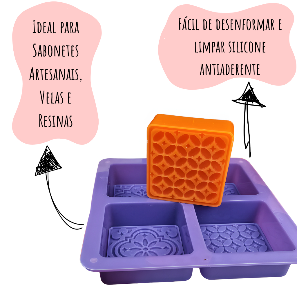 Molde De Silicone Sabonete Artesanal 110g Forma Desenhada Texturizada Arabesco 4 Cavidades Quadrado