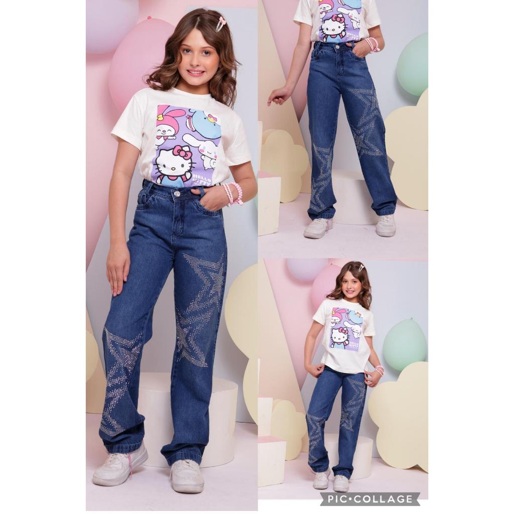 Calça Jeans Strass Boiadeira Wide Leg Infantil Juvenil