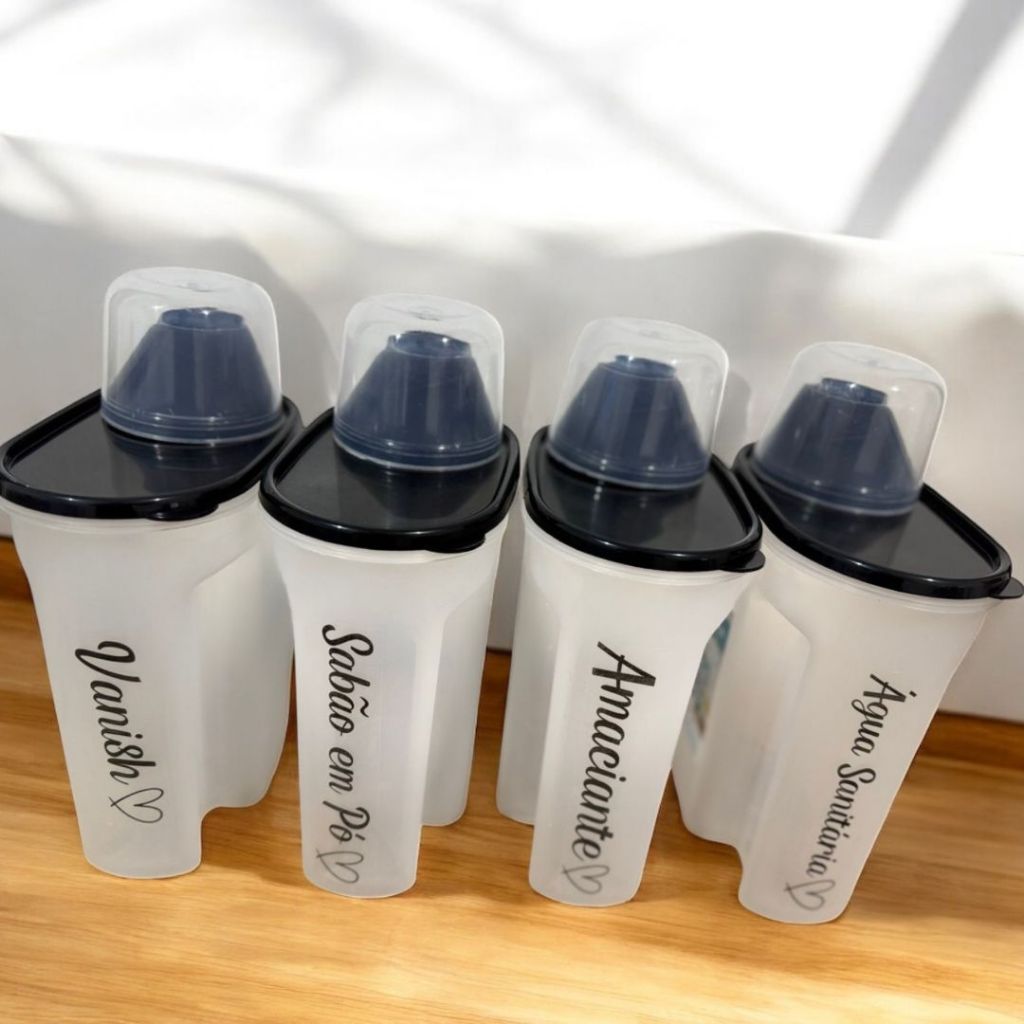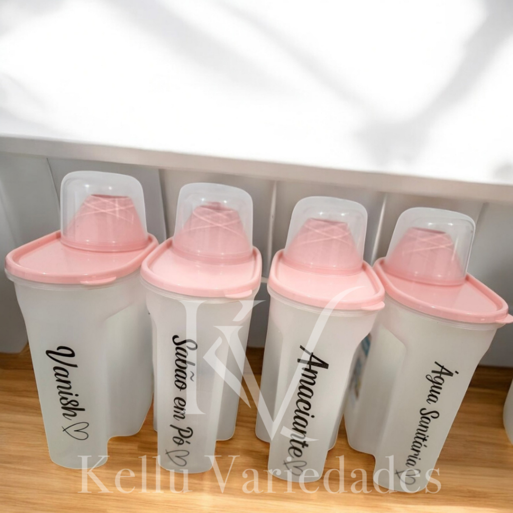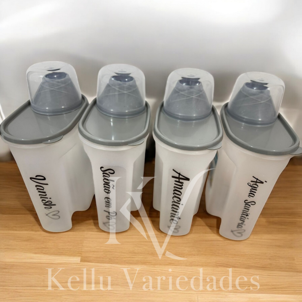 Kit Lavanderia 4 Peças – Porta Sabão 1700ml com Adesivo Vanish + Sabão em Pó + Amaciante + Água Sanitária
