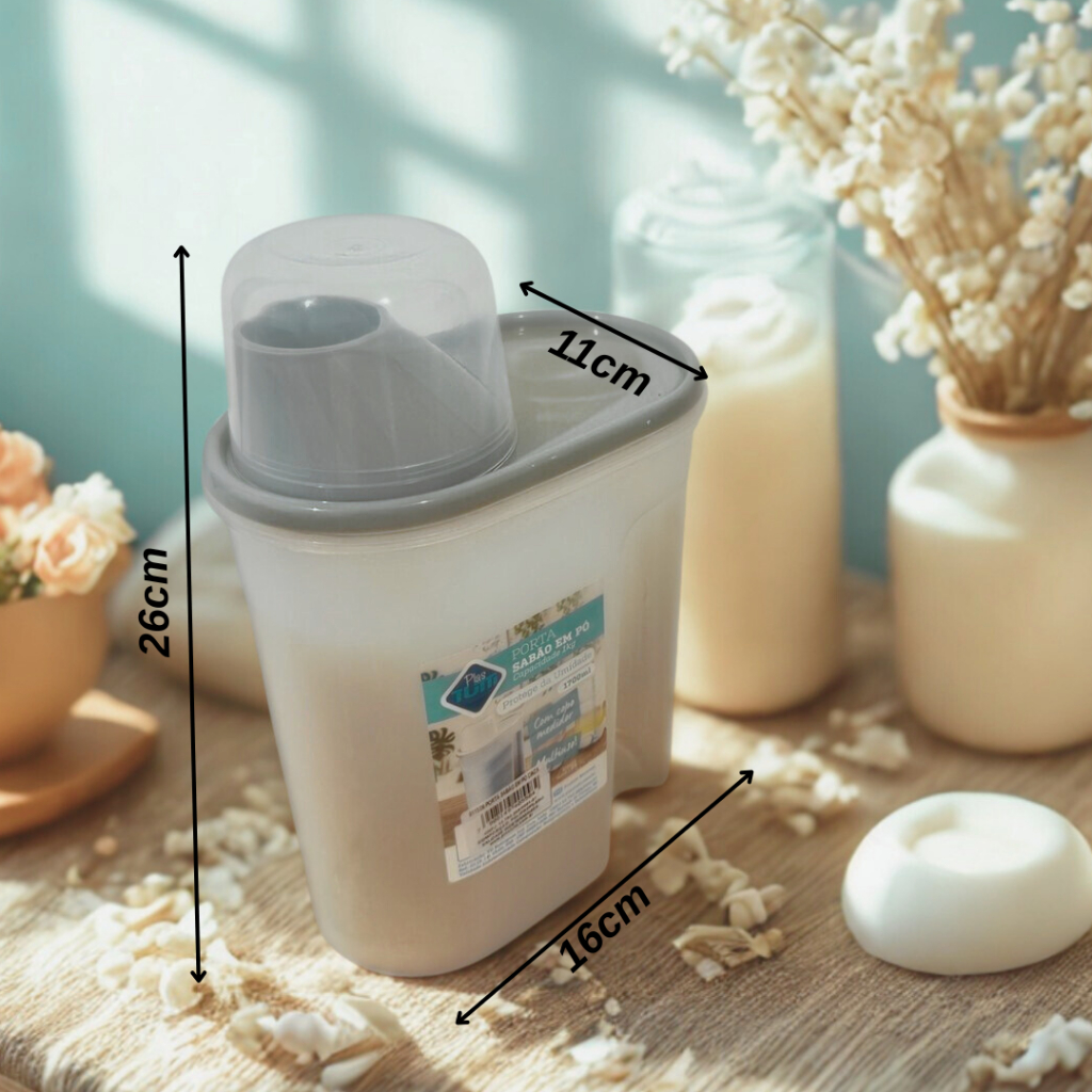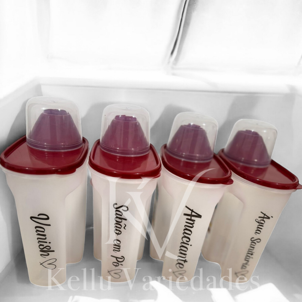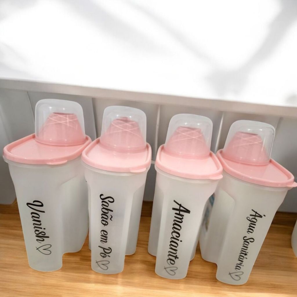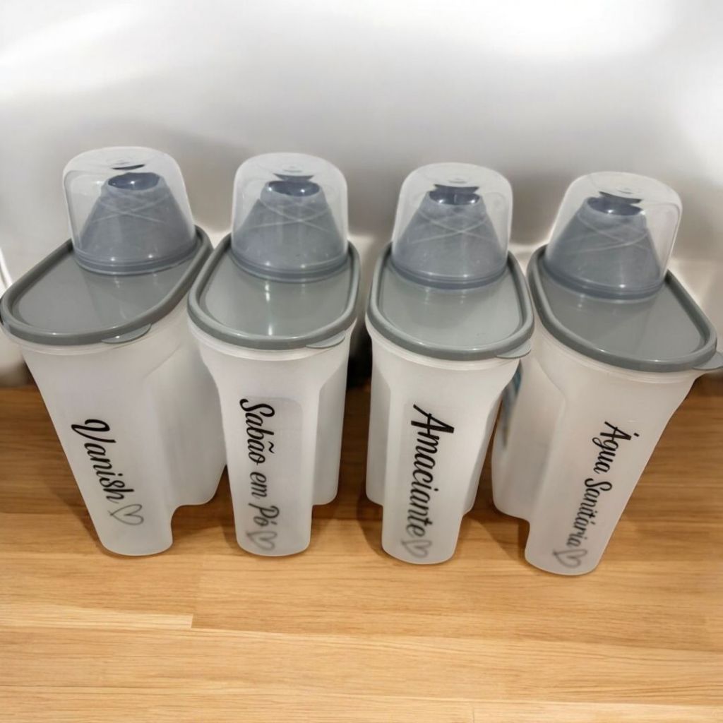 Kit Lavanderia 4 Peças – Porta Sabão 1700ml com Adesivo Vanish + Sabão em Pó + Amaciante + Água Sanitária