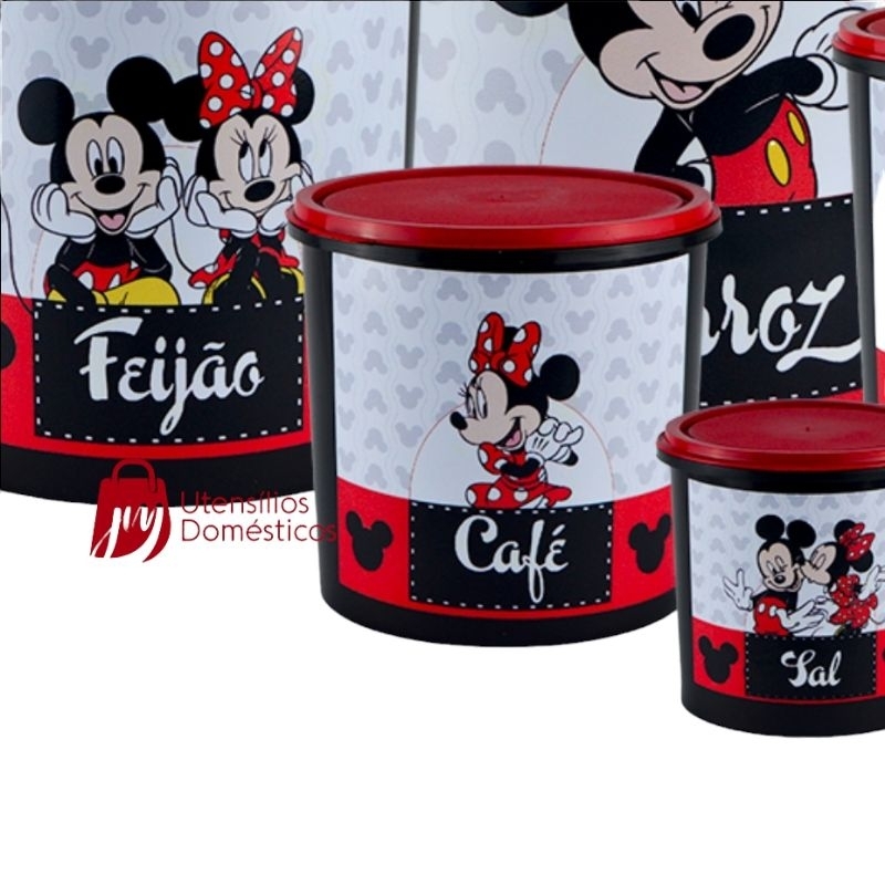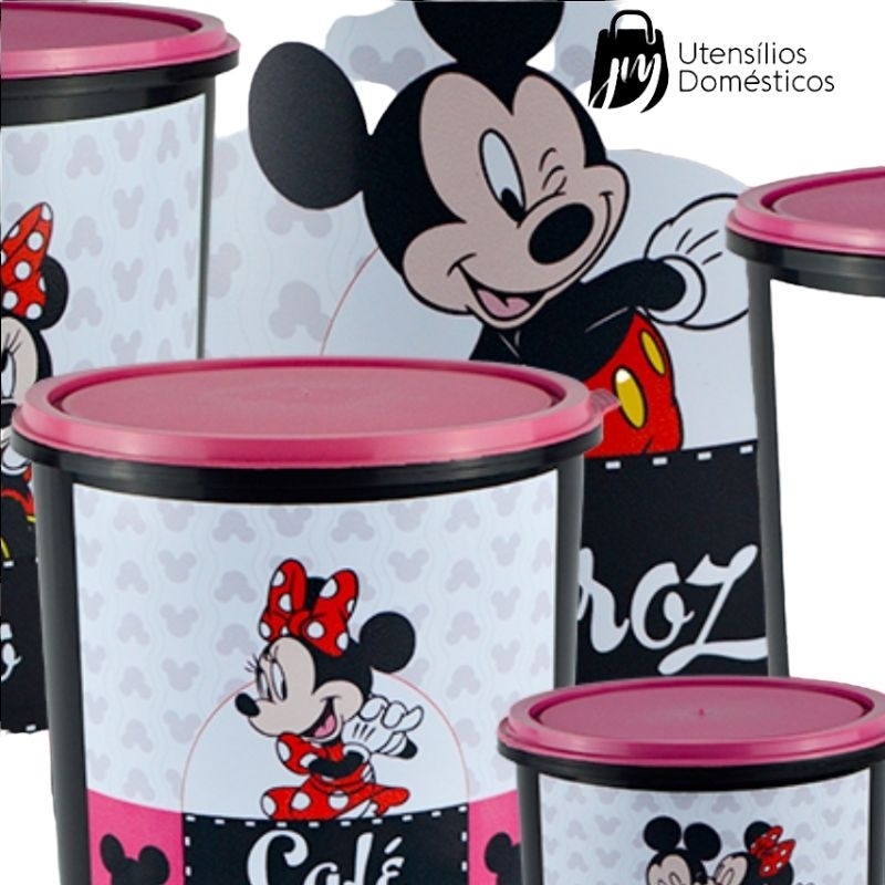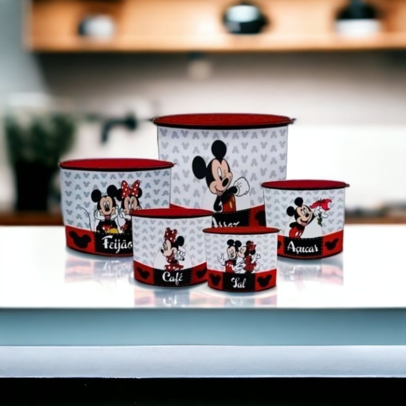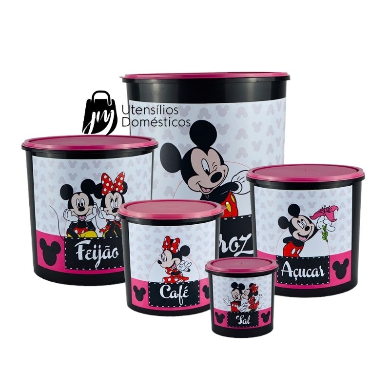 Kit Conjunto Porta Mantimento 5 peças decorado Lançamento tampas rosa e vermelha.