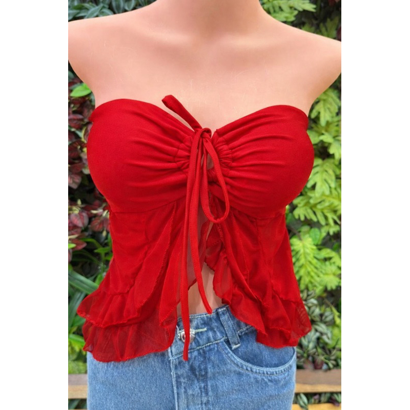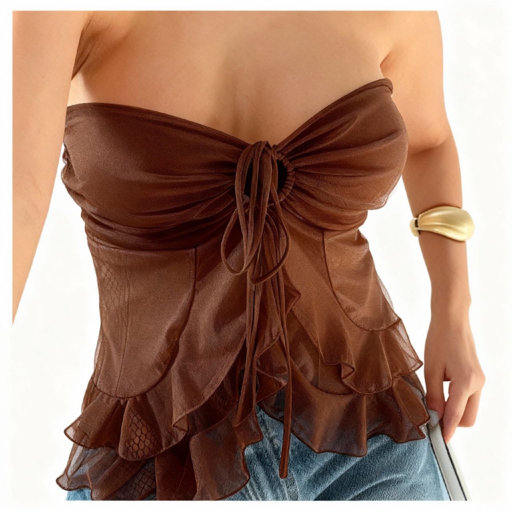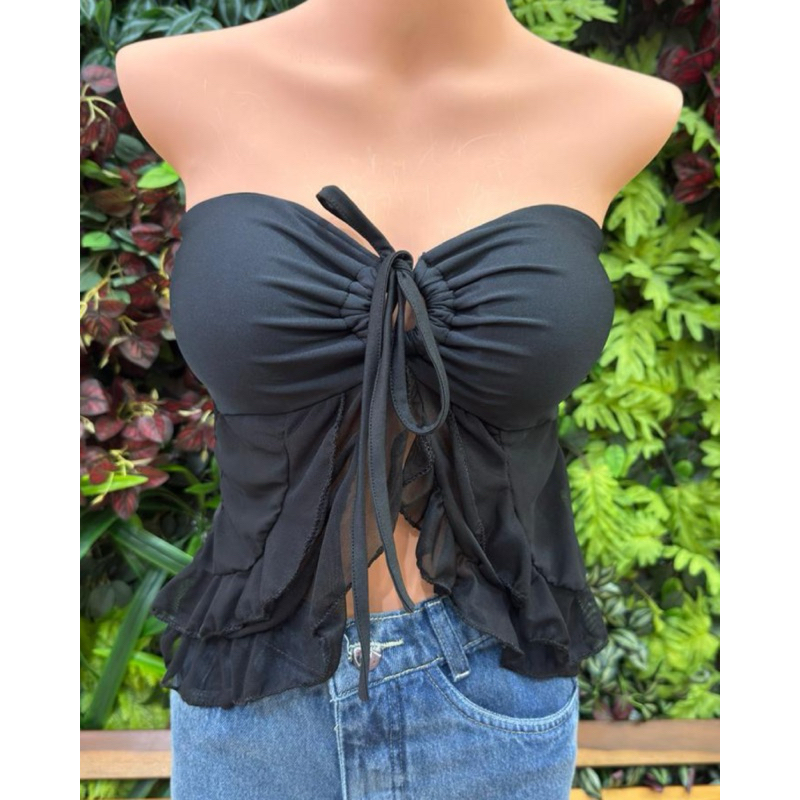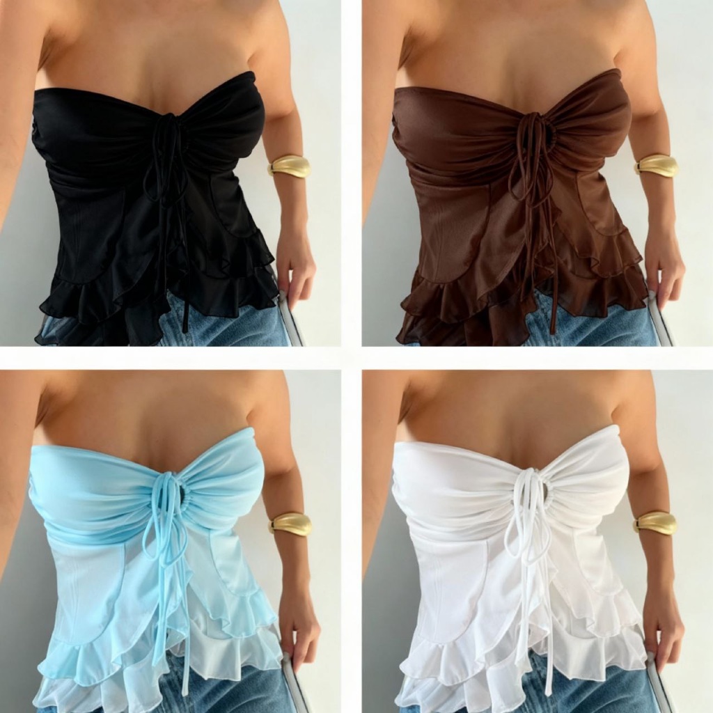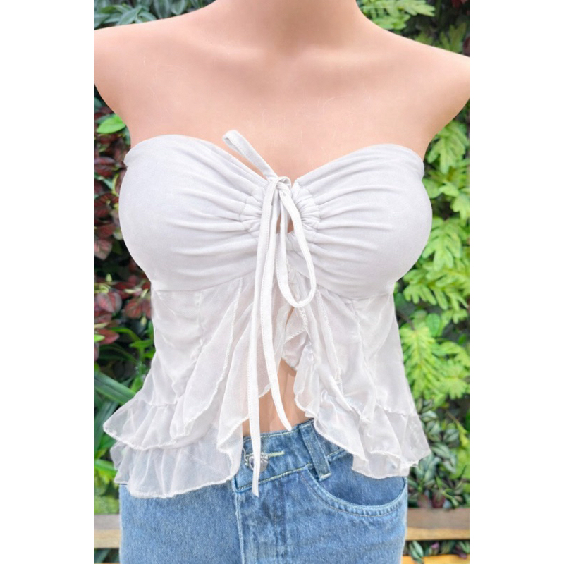 Bata de Tule Feminina com Babados Franzido Frente Moda Verão Europeu Look Romântico Leve e Chic