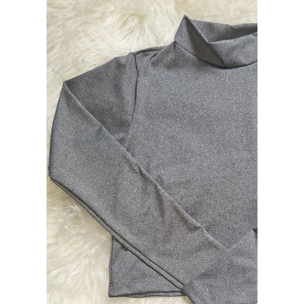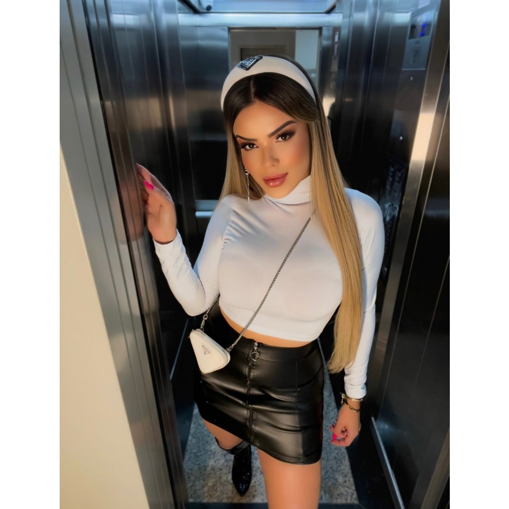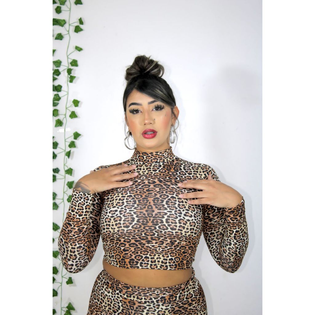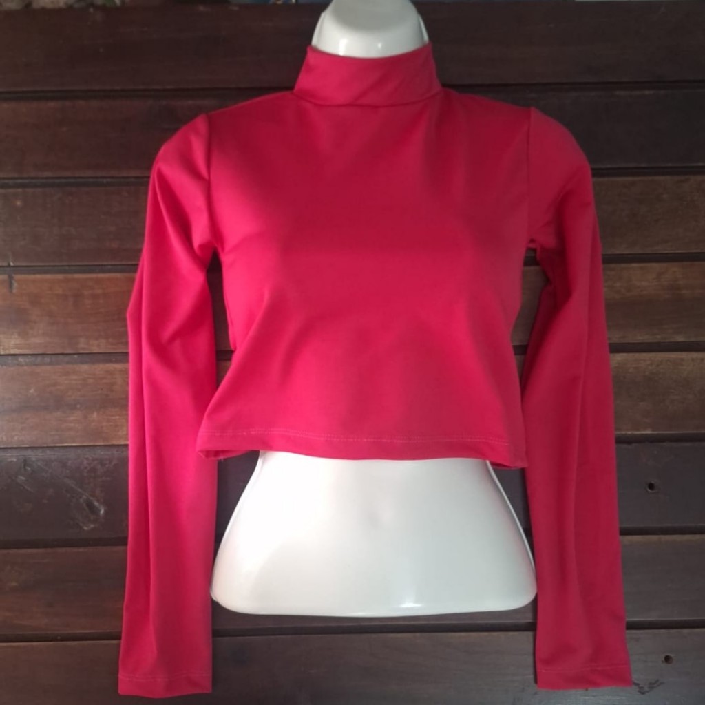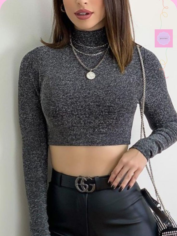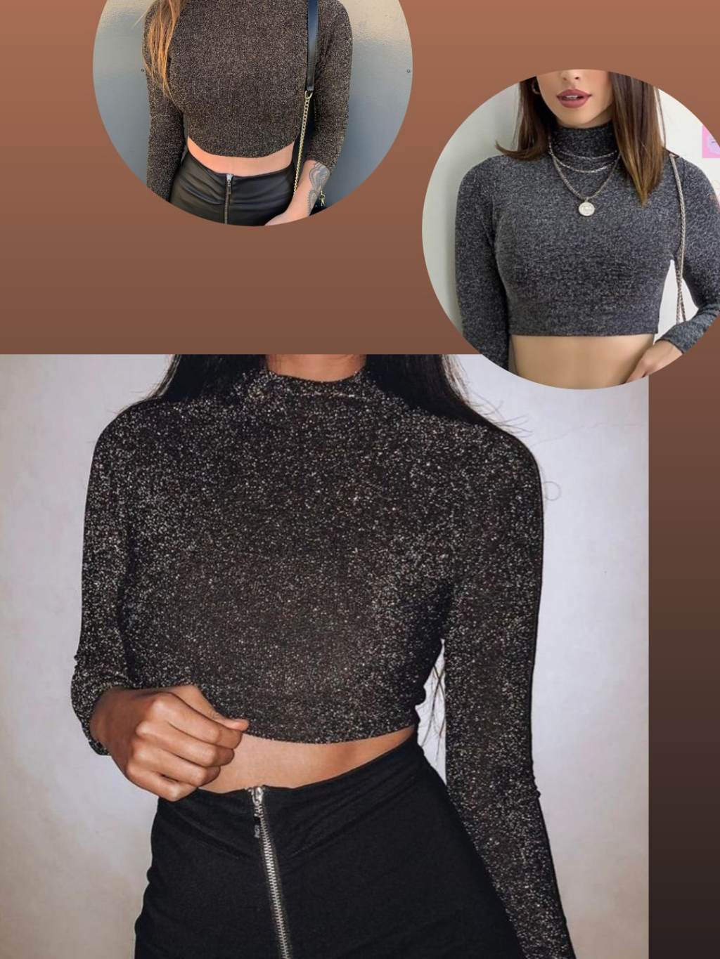 Cropped Manga Longa Com Gola Alta Tecido Lurex Brilhoso.