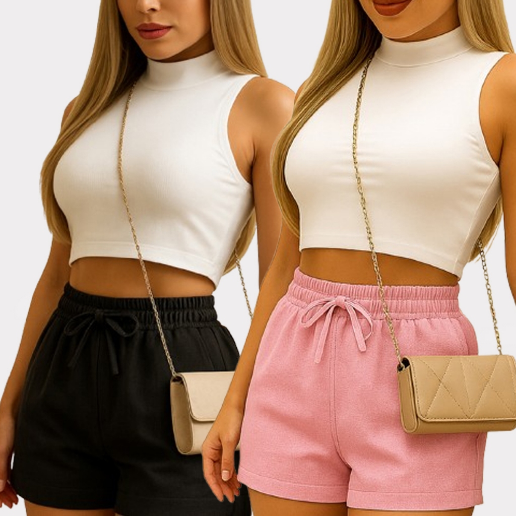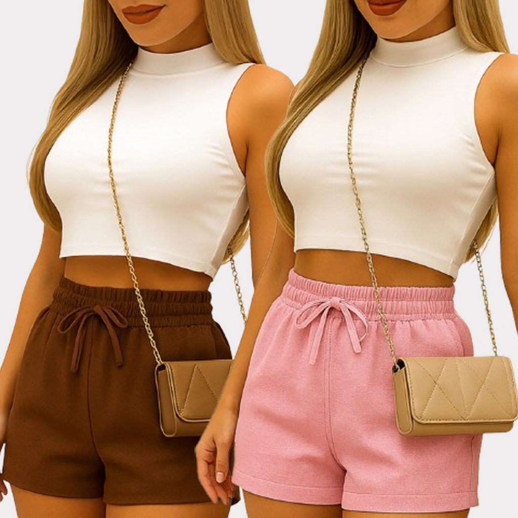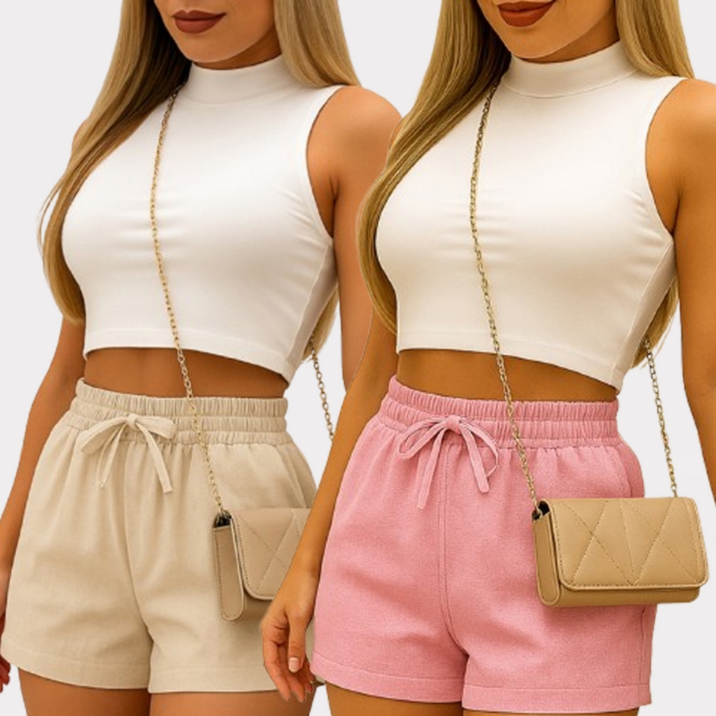 Shorts Curto Feminino De Linho Com Elástico Na Cintura E Com Bolso