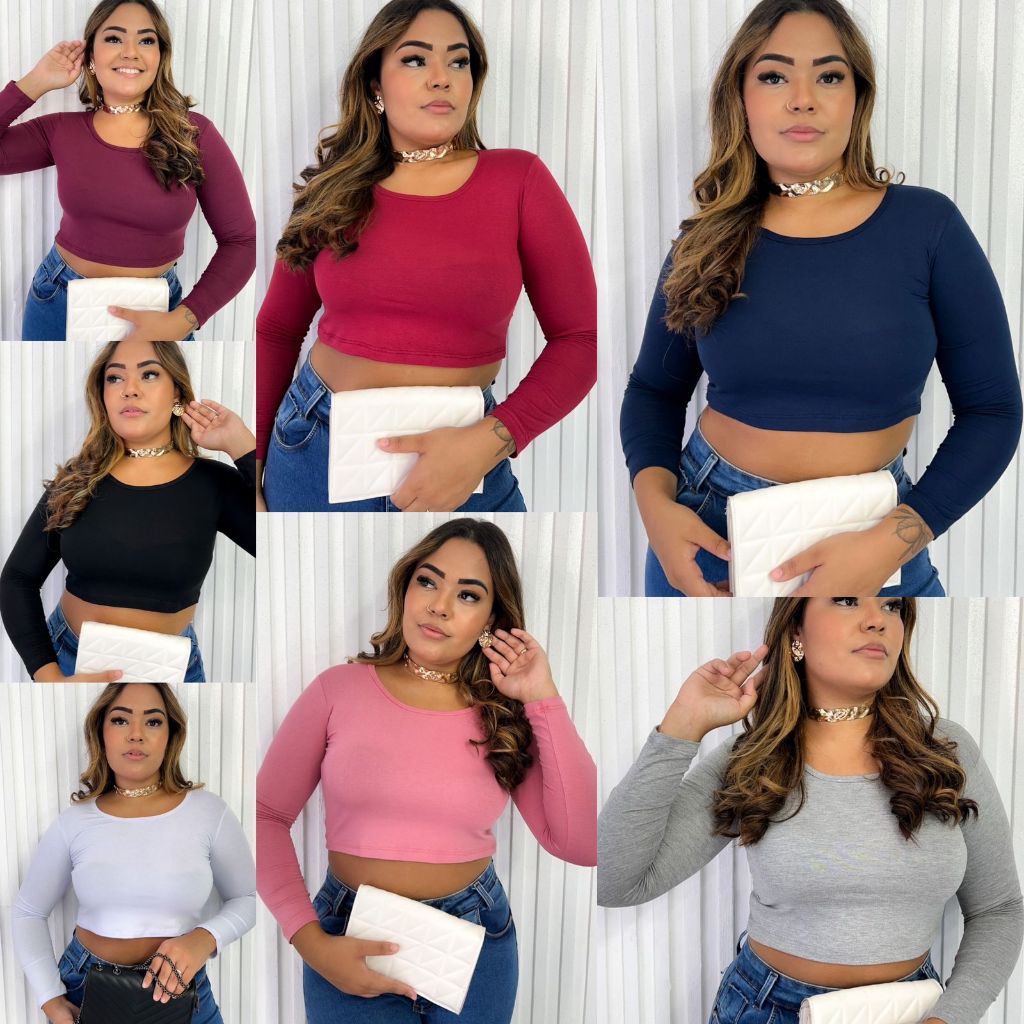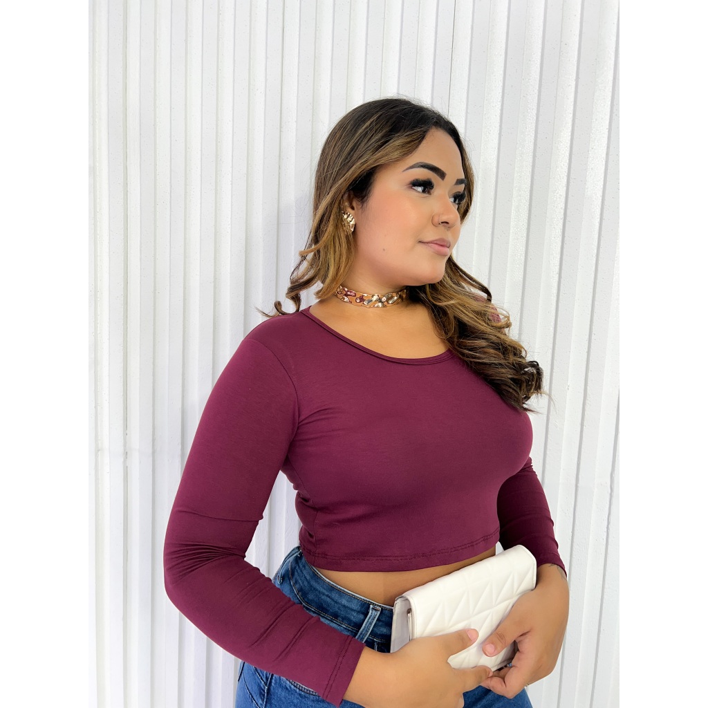 KIT 3 blusinhas Croppeds feminina básica gola careca redonda manga longa