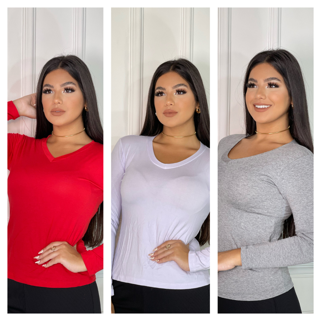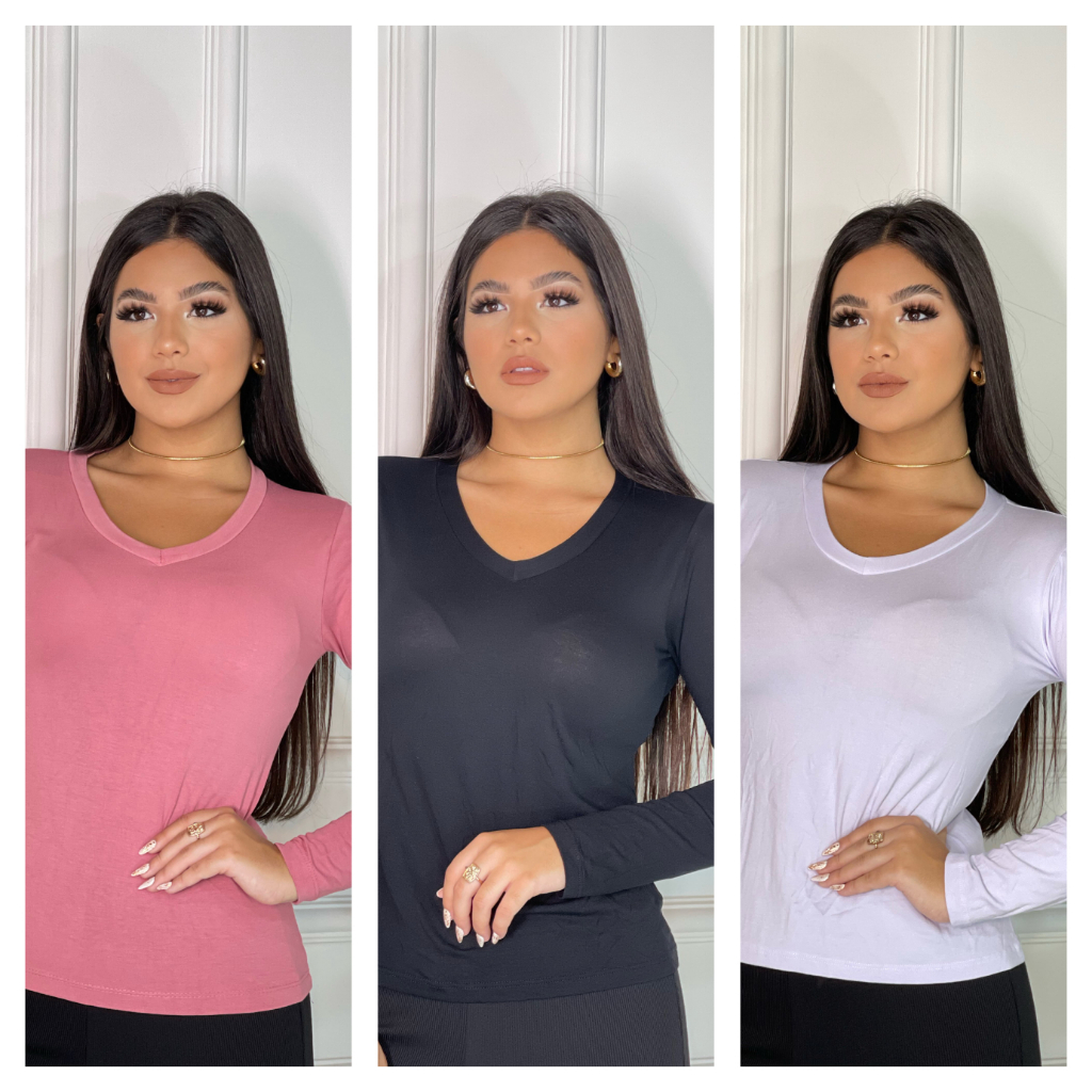 Kit 3 Blusas Femininas Gola V Manga Longa Básica