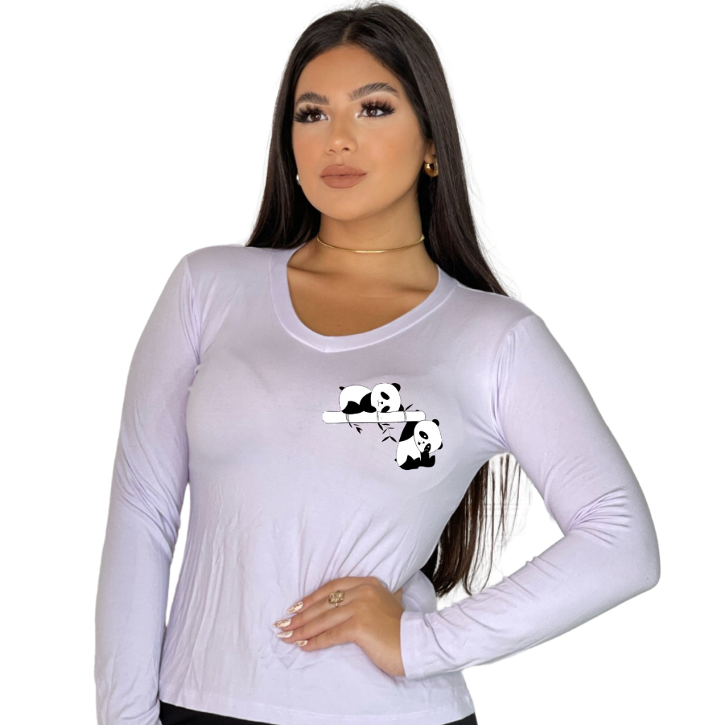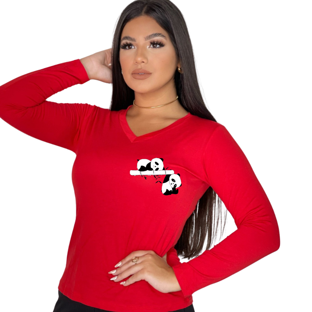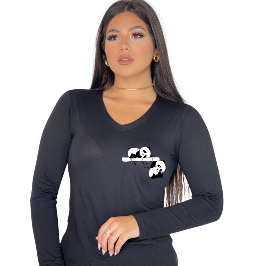 Blusa de Frio Feminina Estampada Dois Pandinhas Gola V Manga Longa Casual, Inverno