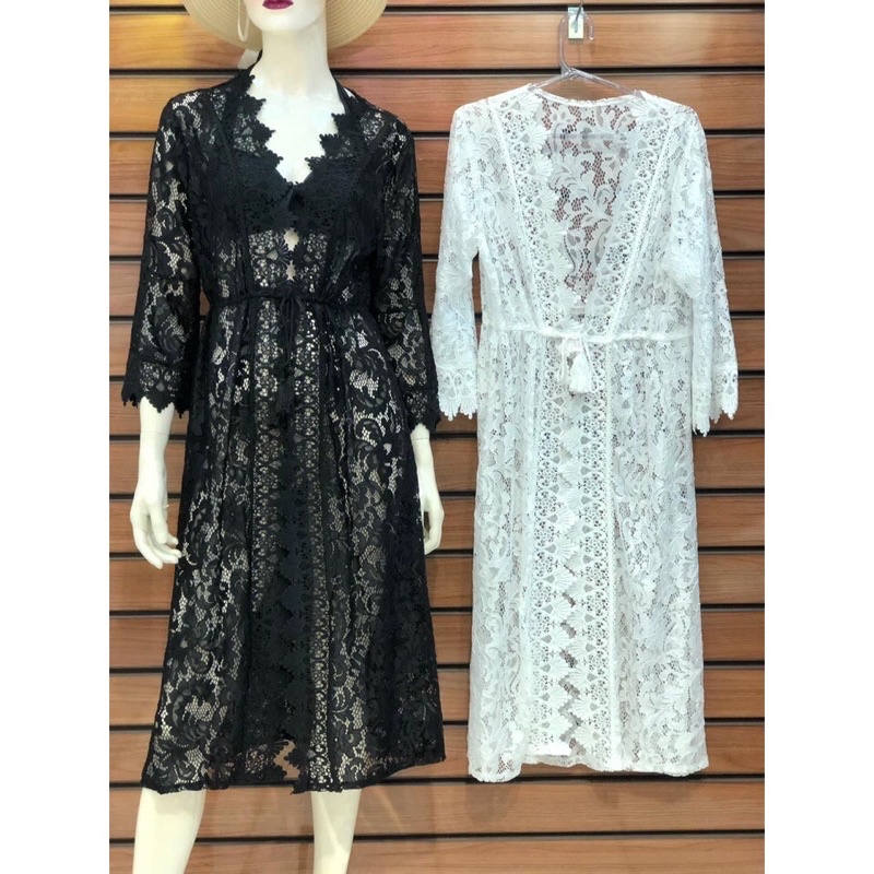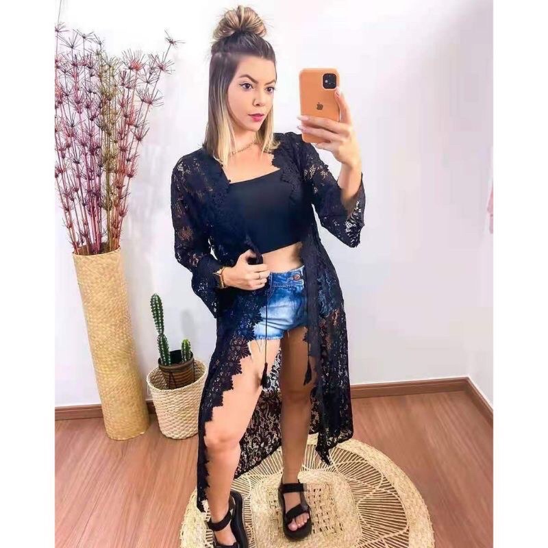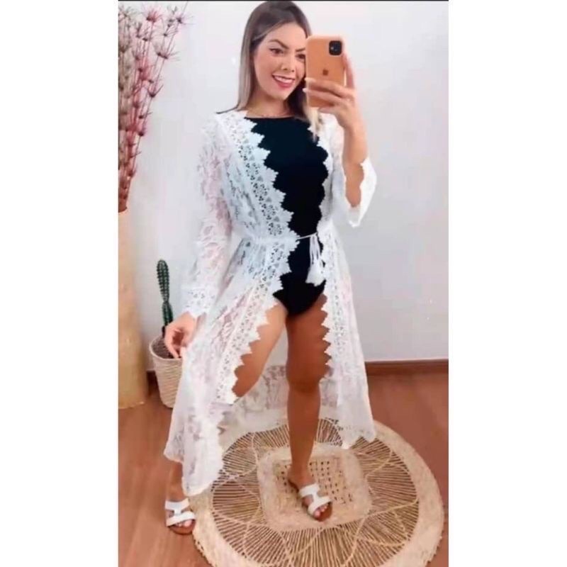 Saida De Praia longa Kimono Com Renda Feminina Verao