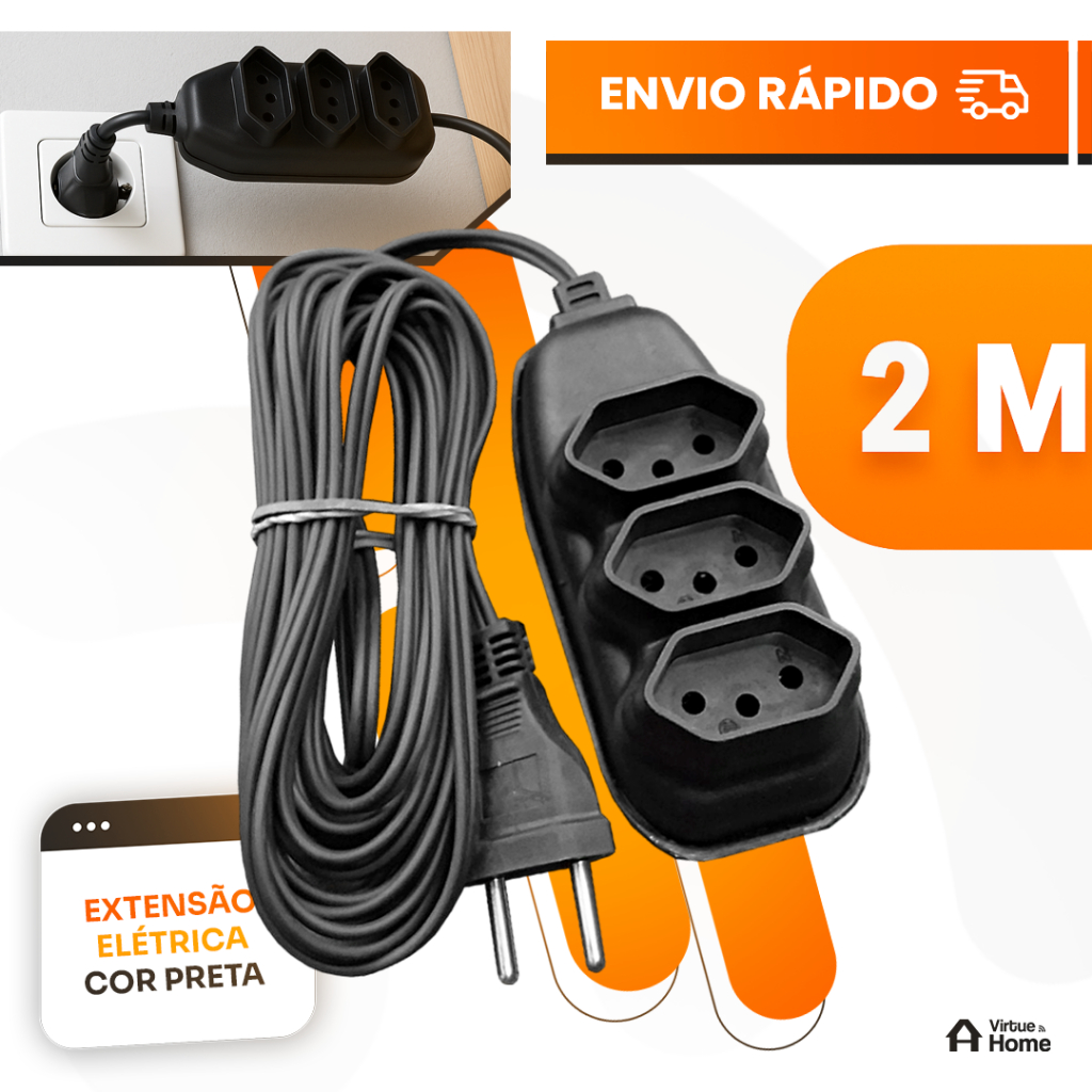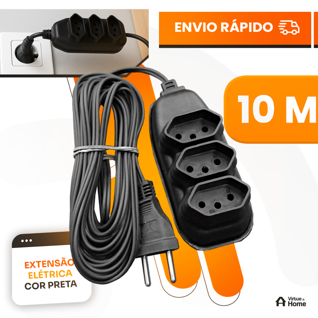 Extensão Elétrica 10, 5, 3, 2 Metros - BIVOLT 110/220V 10A Tomada Tripolares Resistente Preta