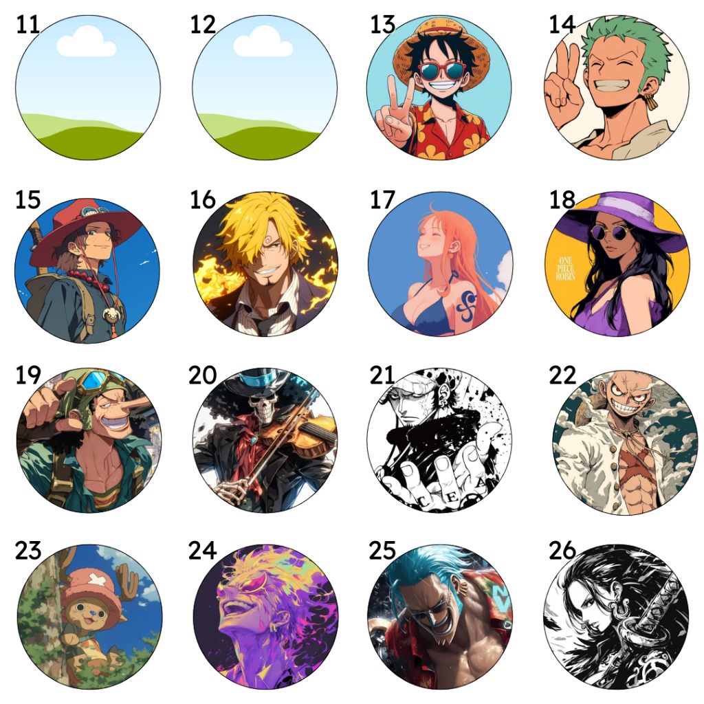 Bottons anime One Piece - tamanhos 2,5 cm 3,5 cm e 4,5 cm