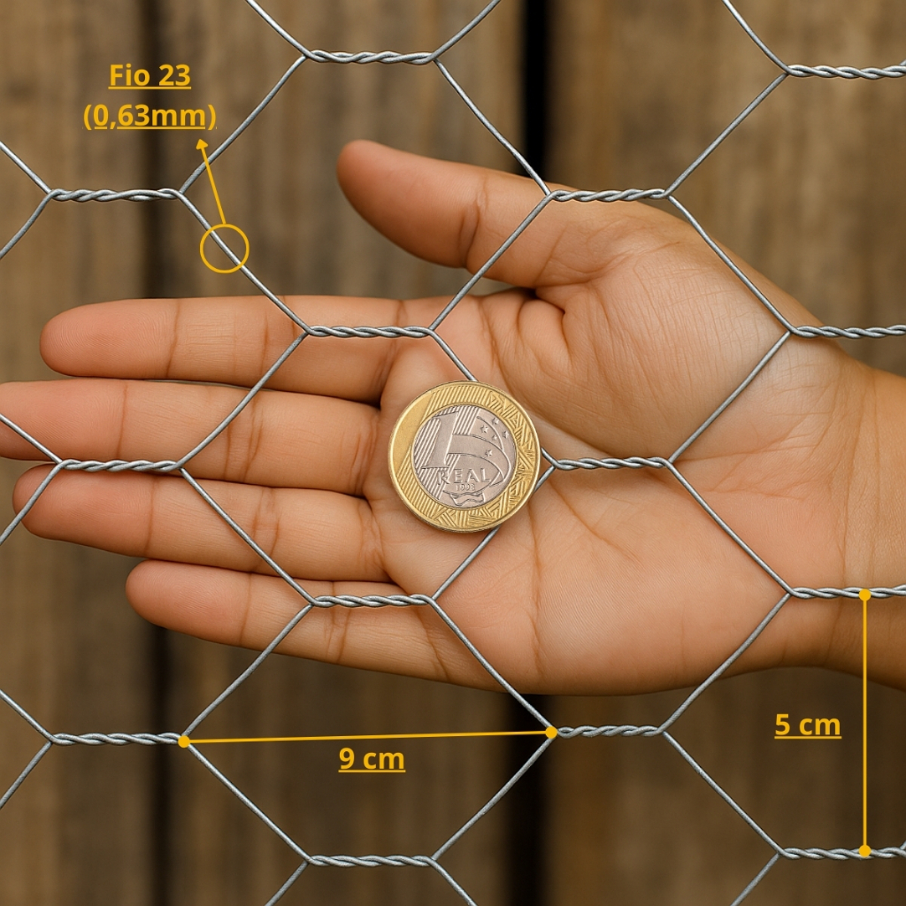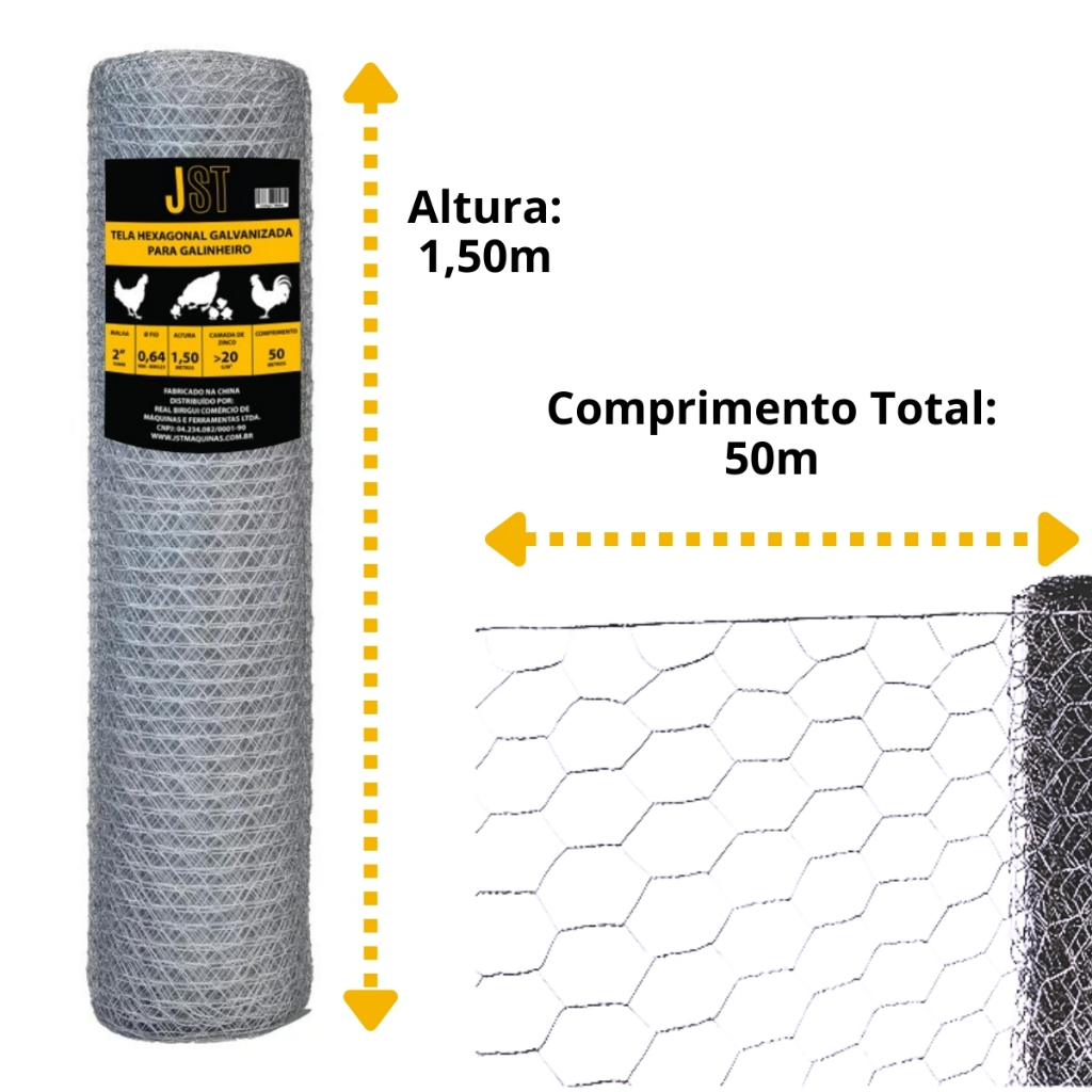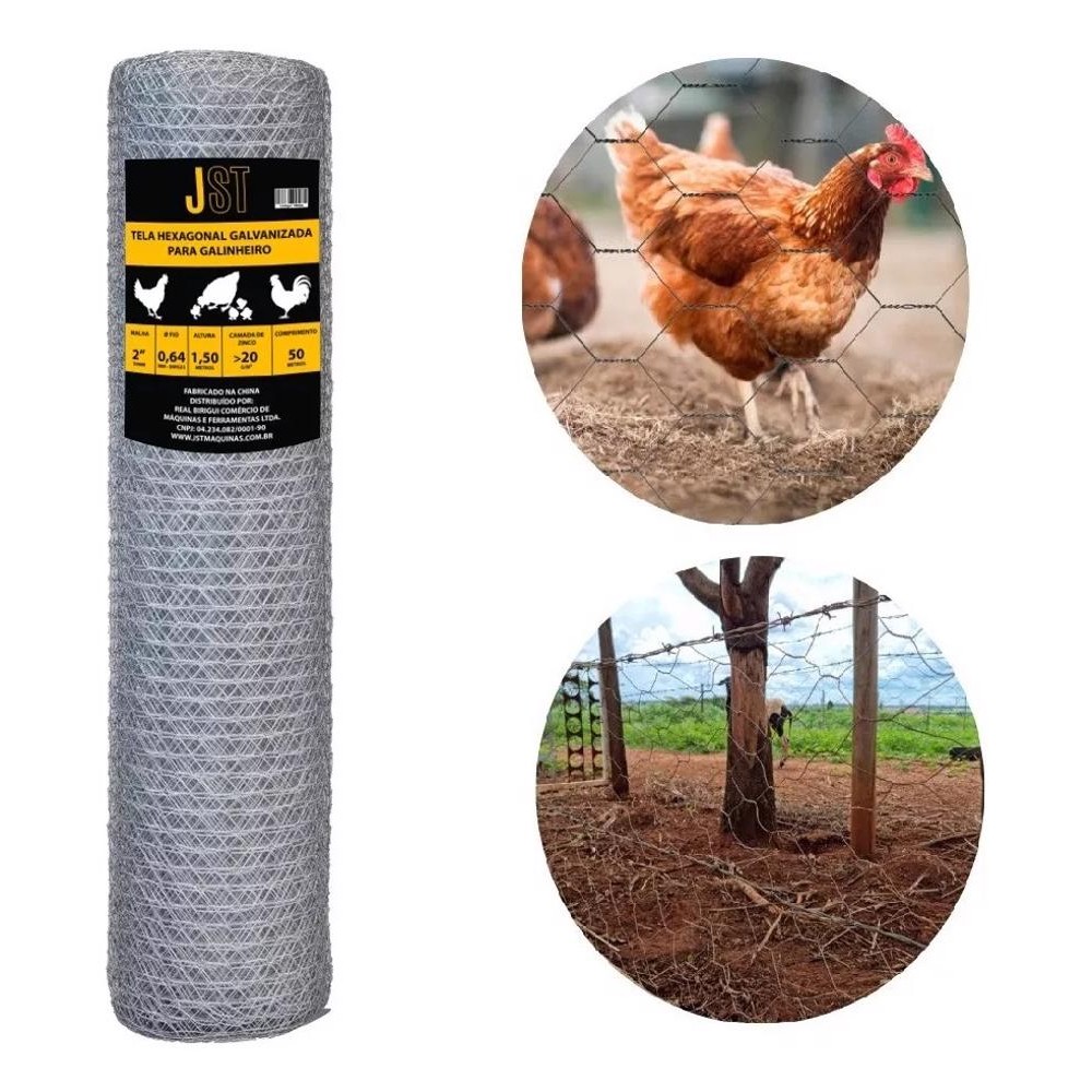 Tela Galinheiro Galvanizada JST 1,50x50m Fio 23 Malha 2 Pol para Cercamento Rural, Horta