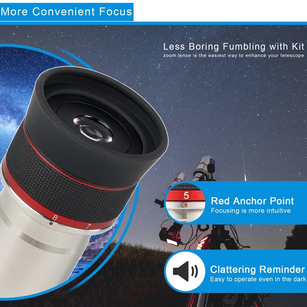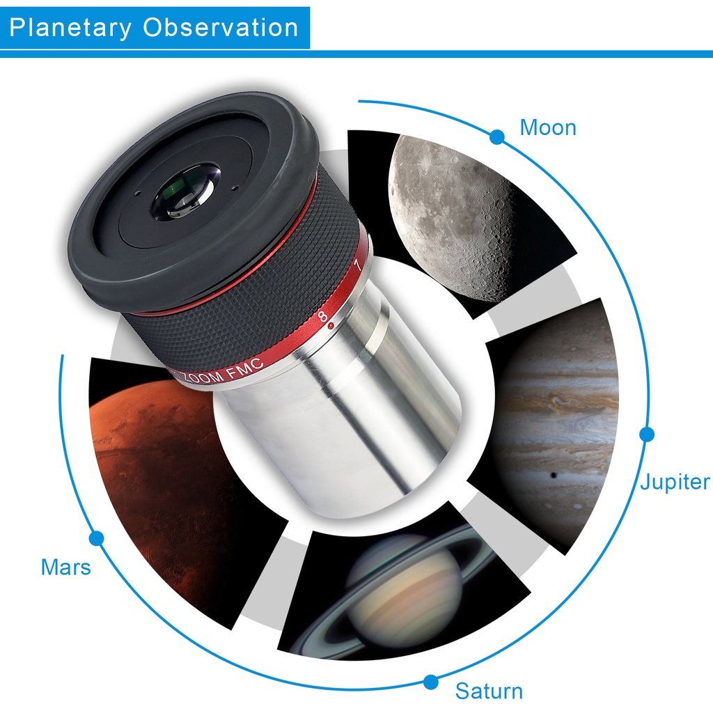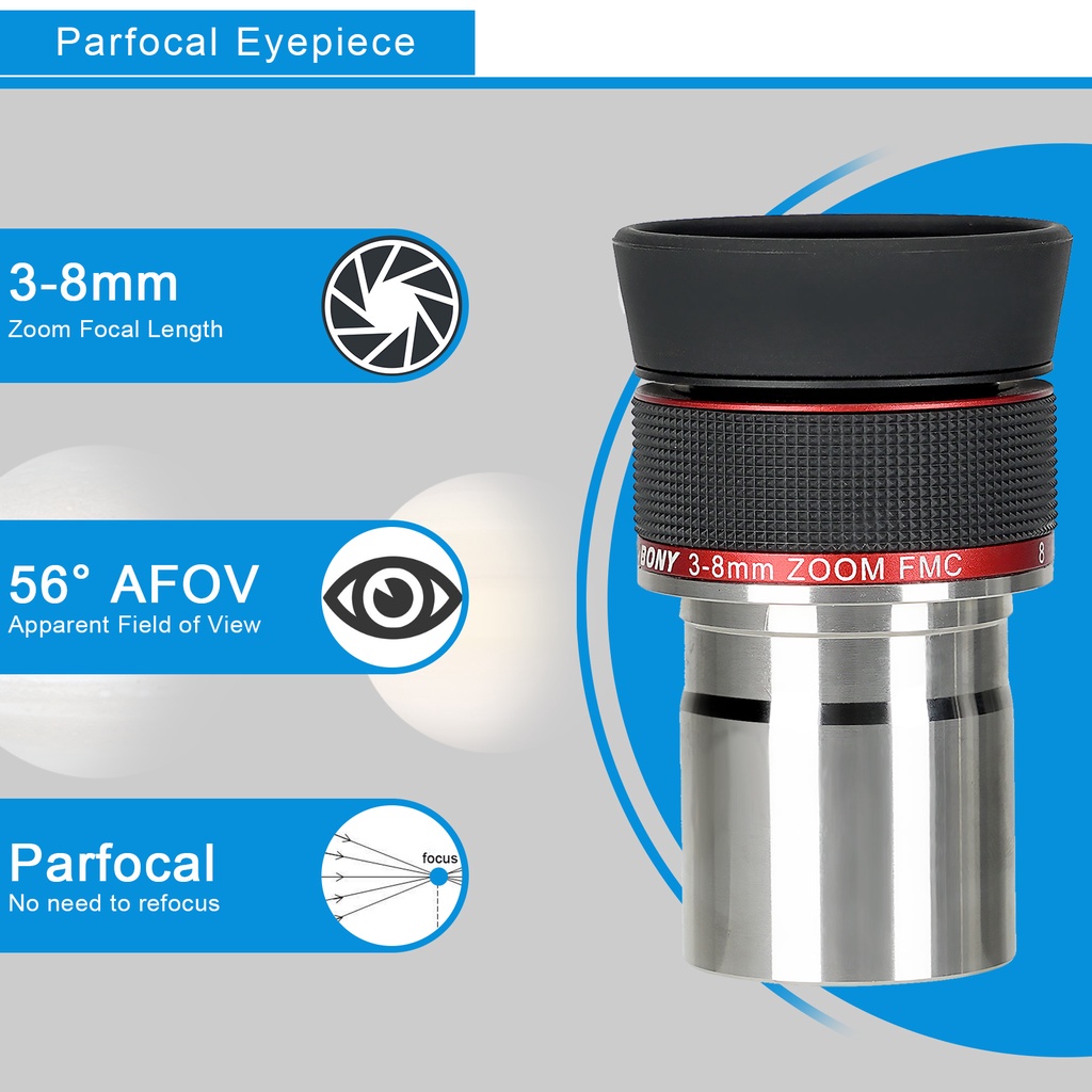 SVBONY SV215 Ocular zoom planetário 3–8 mm, 1,25", parfocal, AFOV constante 56°, para Lua