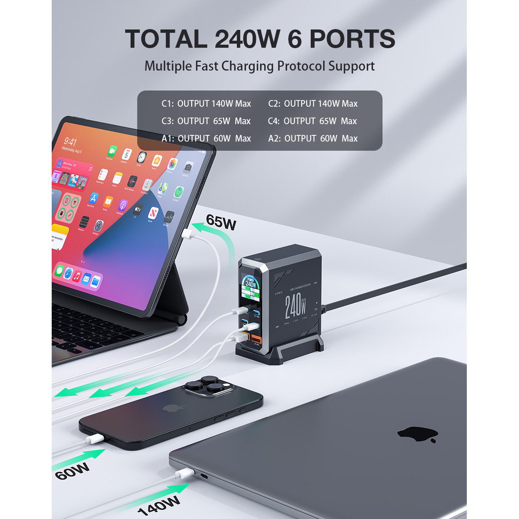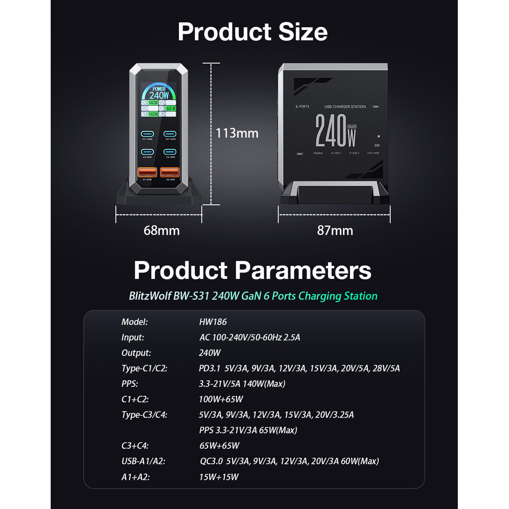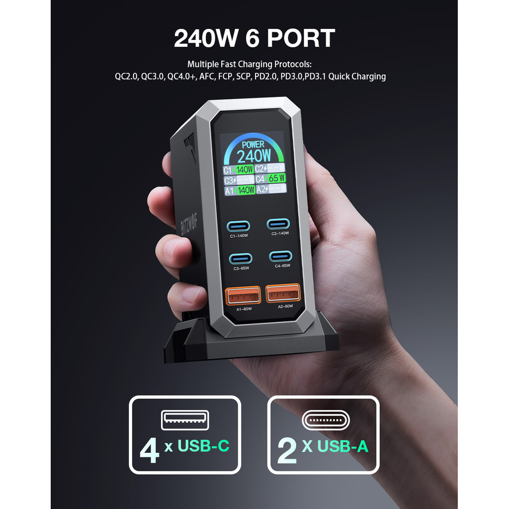[Tecnologia GaN] Blitzwolf ® BW-S31 240W Carregador USB PD De 6 Portas 4USB-C + 2USB-A QC Display Digital Estação De Car