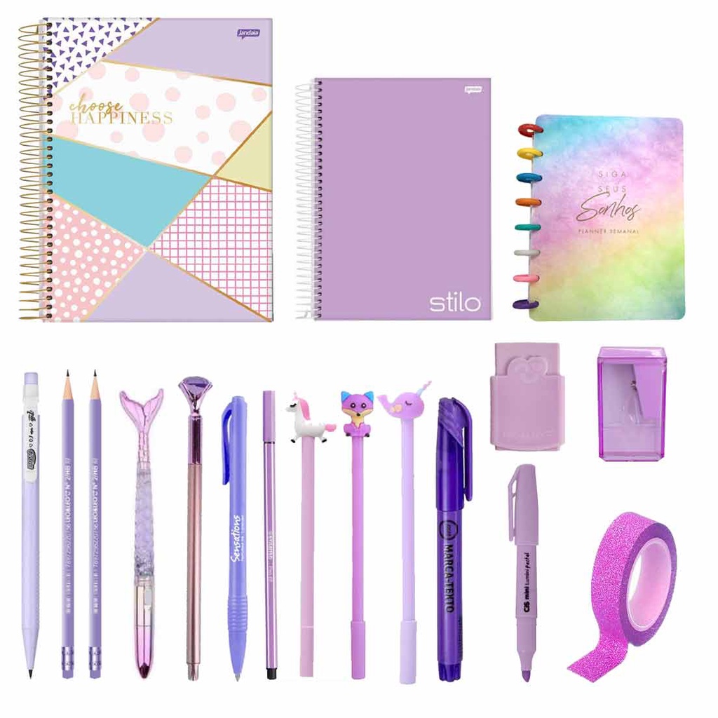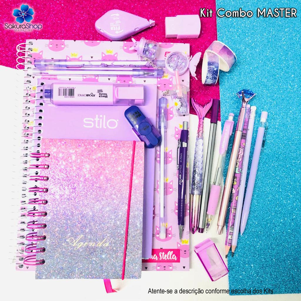 Kit Papelaria COMBO MASTER Tons de Roxo Lilás Studygram Caneta Caderno