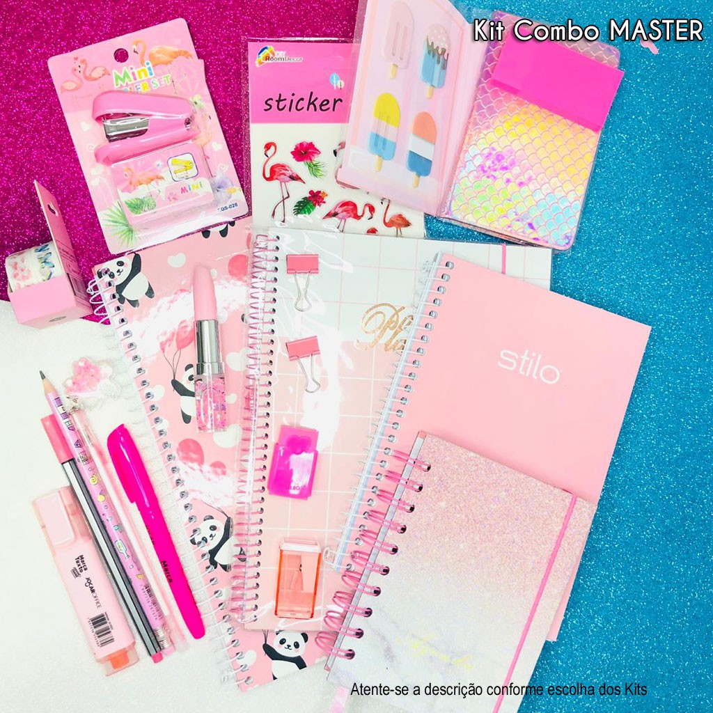 Kit Papelaria COMBO MASTER Tons Rosa Studygram Caneta Caderno