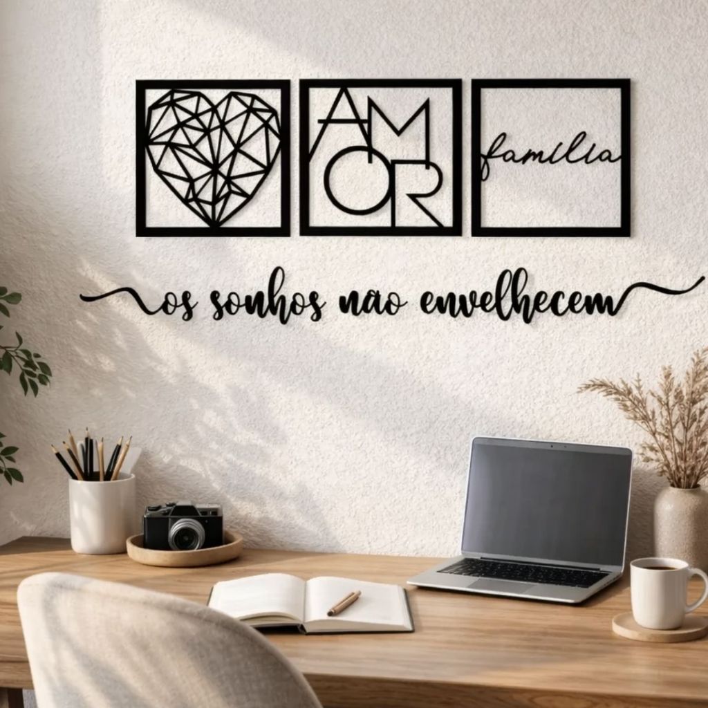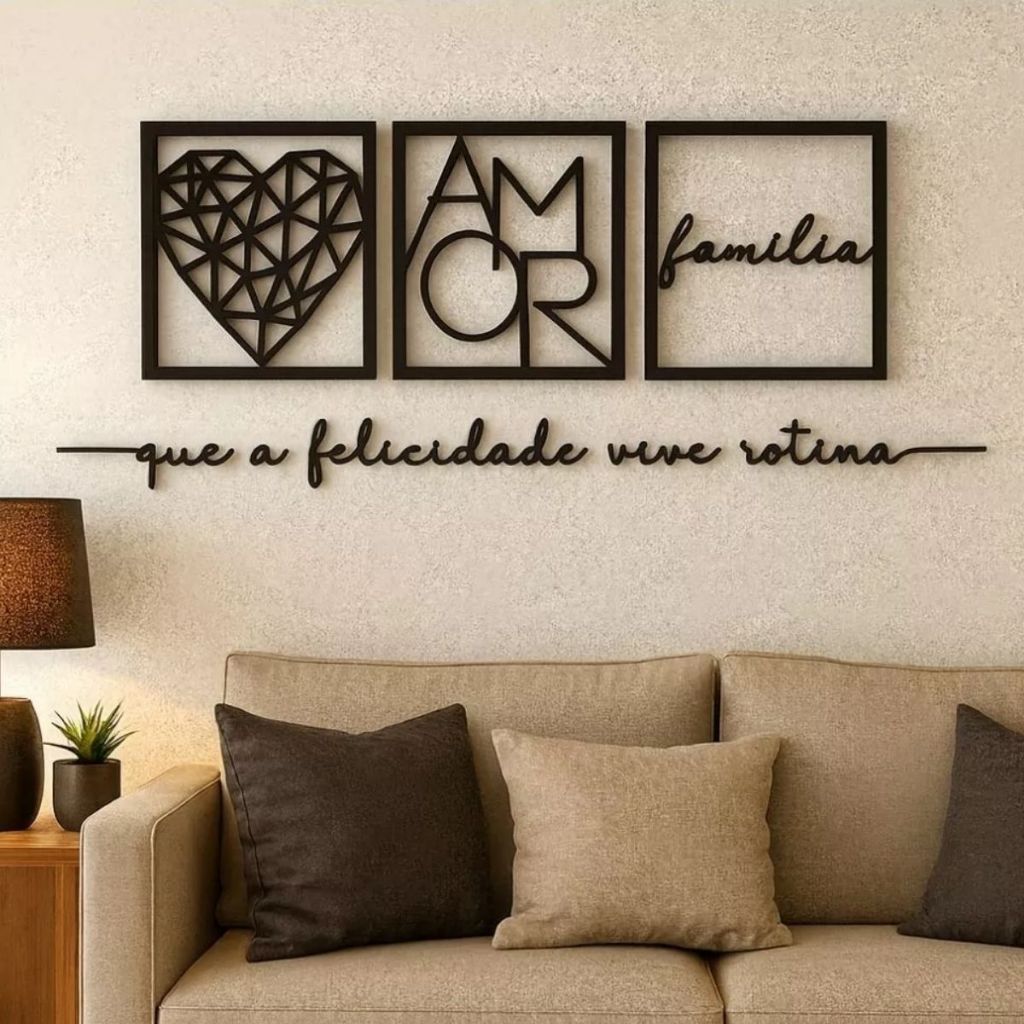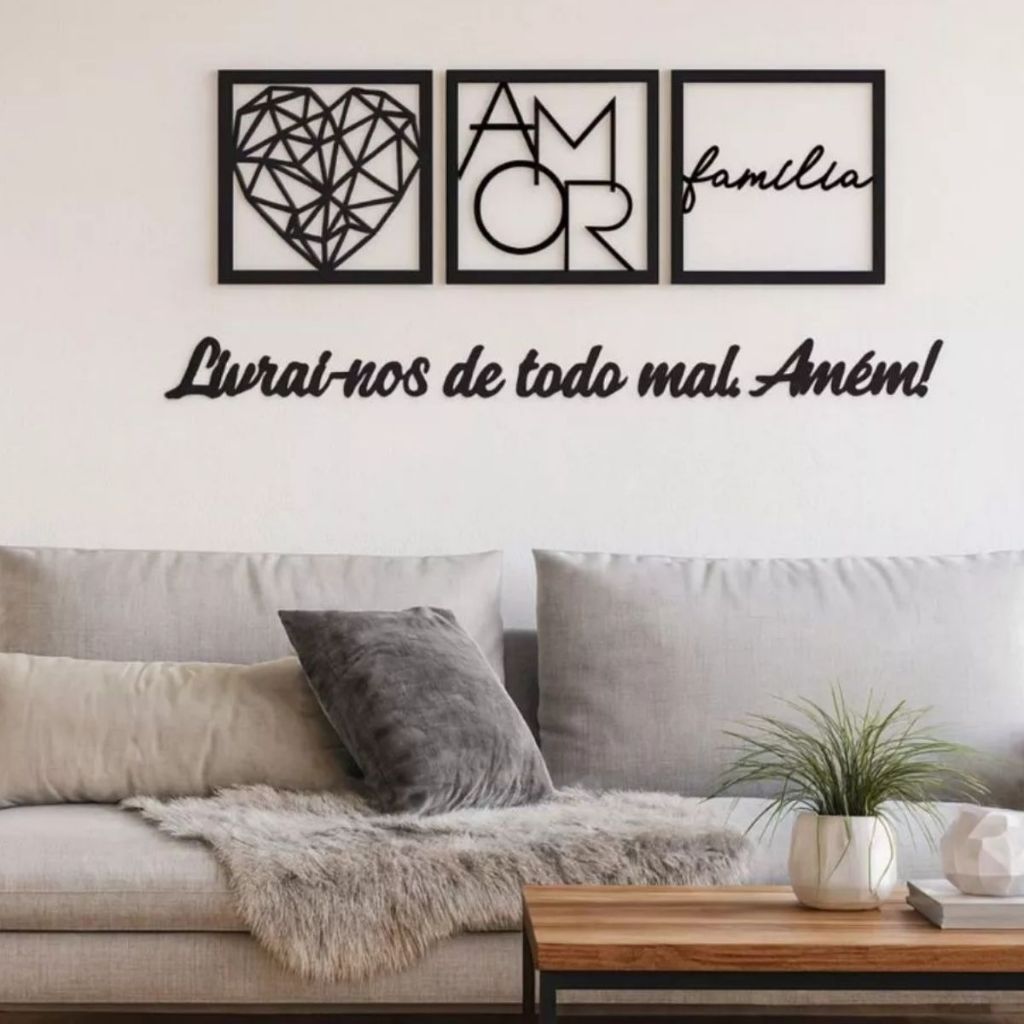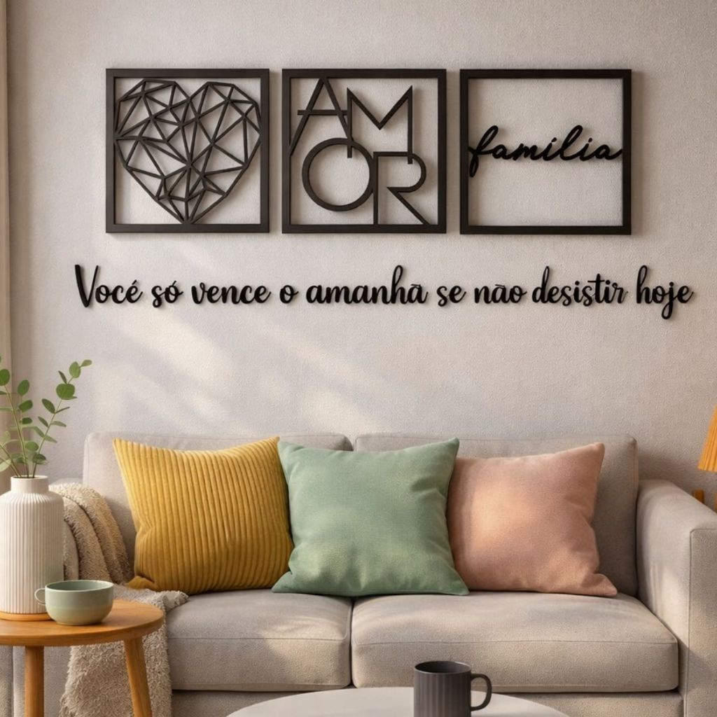 Kit 3 Quadros Cabeceira Familia Coração Geométrico Amor + Frase de Parede Variados Sala Mini coração