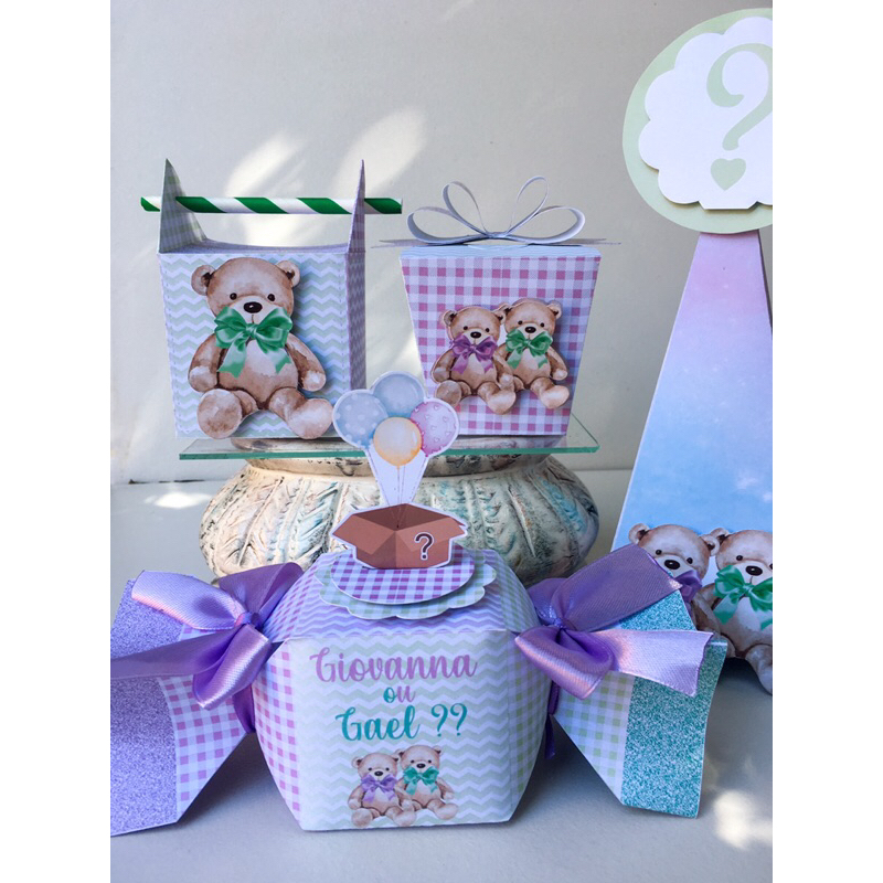 Kit Personalizados Chá revelação Ursinhos lilás e verde - 20 unidades.