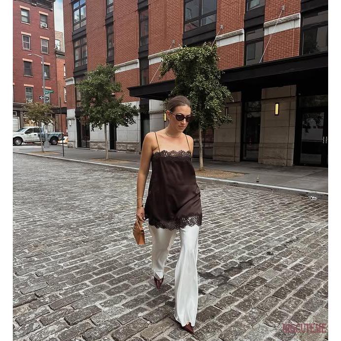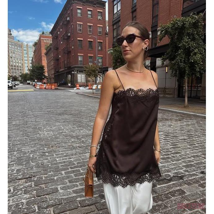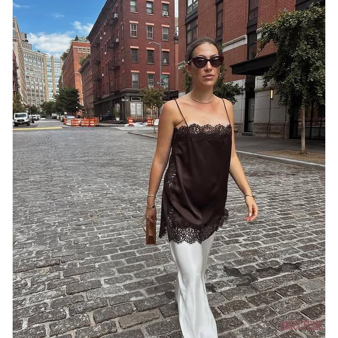 [] – Camisola Feminina De Renda Patchwork Cetim Longa Alça Espaguete Corte Baixo Y2K Verão