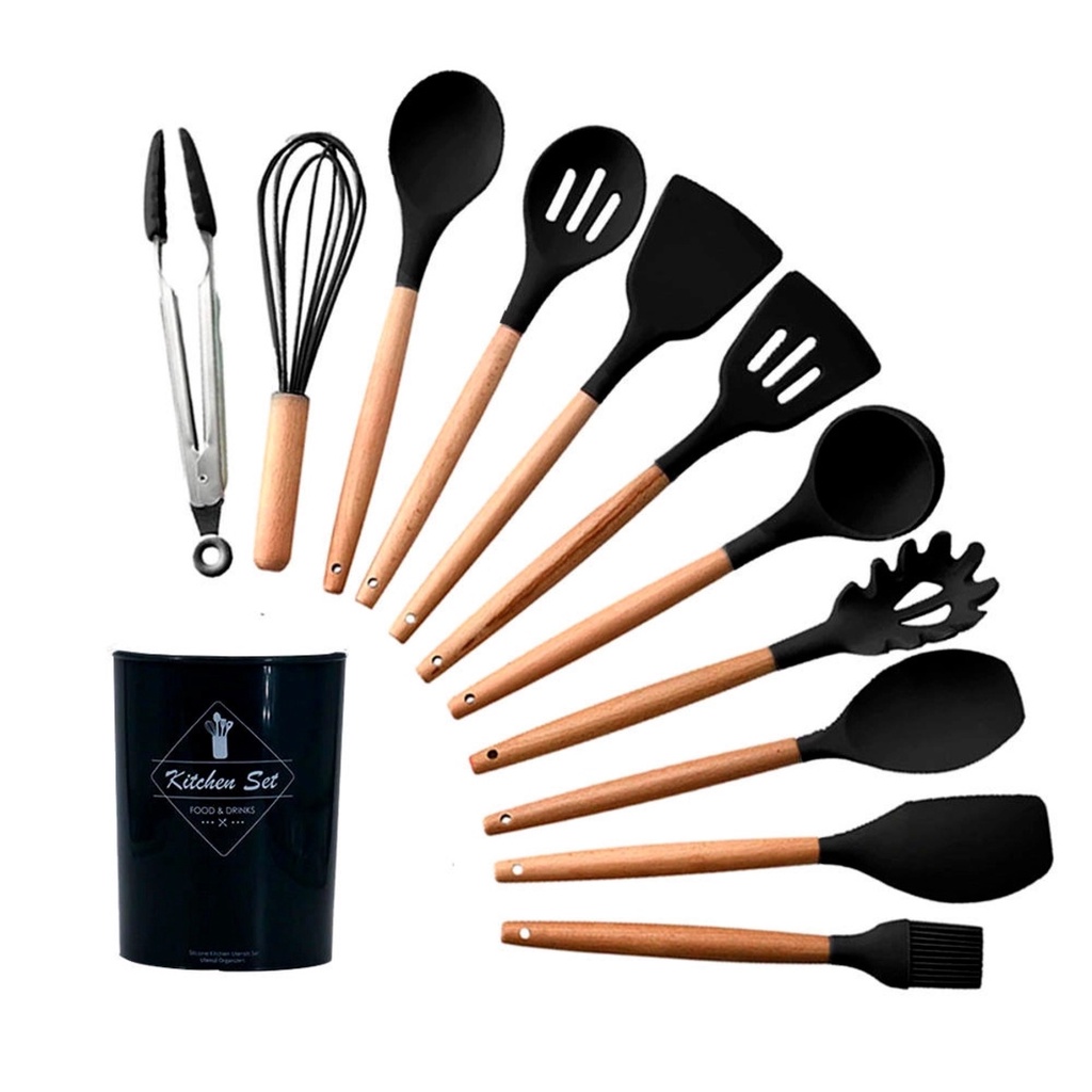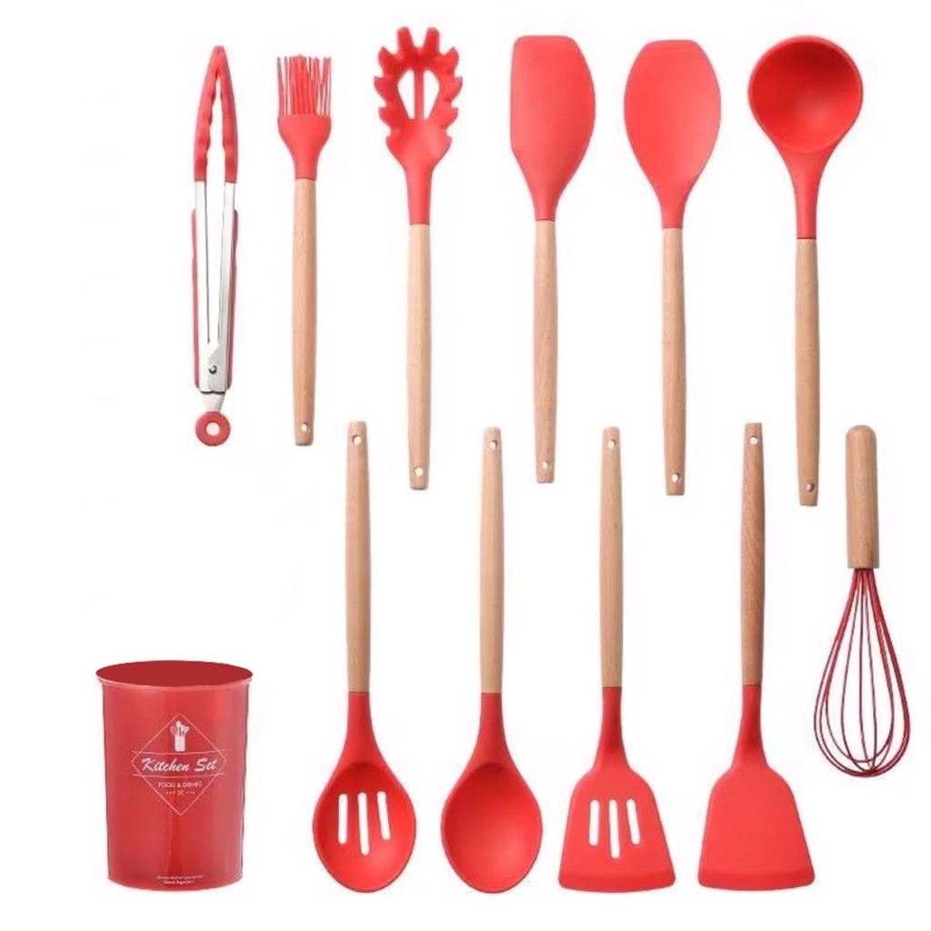 Kit C/12 Utensilios De Cozinha Silicone Cabo Madeira