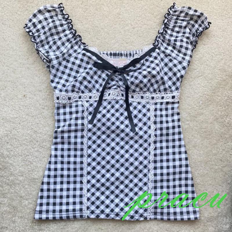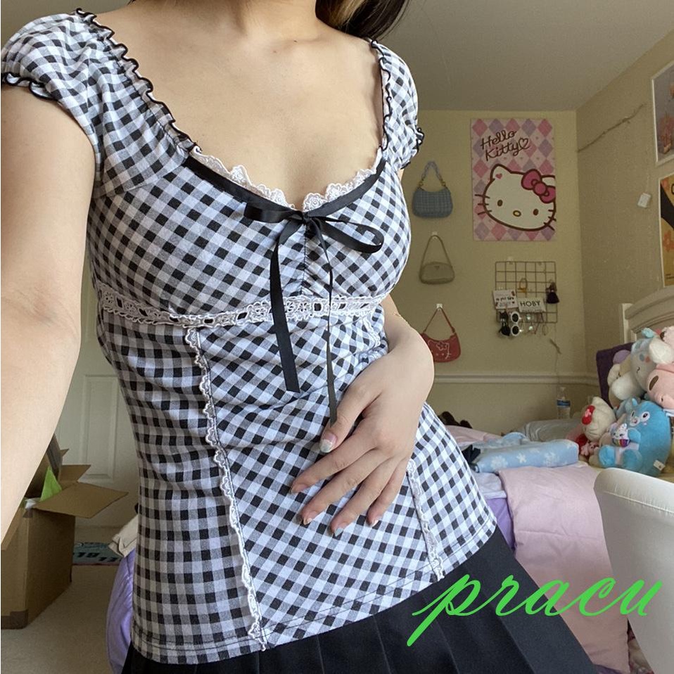 AU Casaco/Pulôver Feminino Vintage De Renda Xadrez Com Gola Quadrada Y2K
