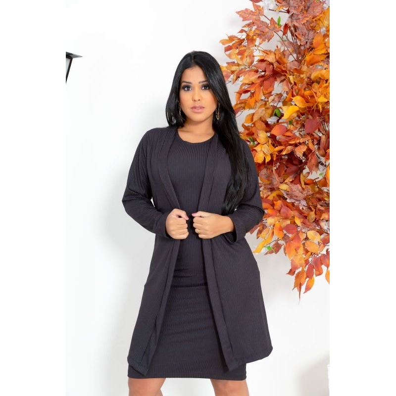 Conjunto Lãzinha Lã Cardigan ou Canelado Vestido Midi Feminino Inverno