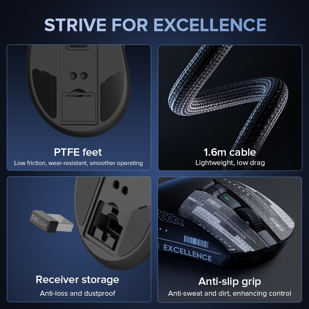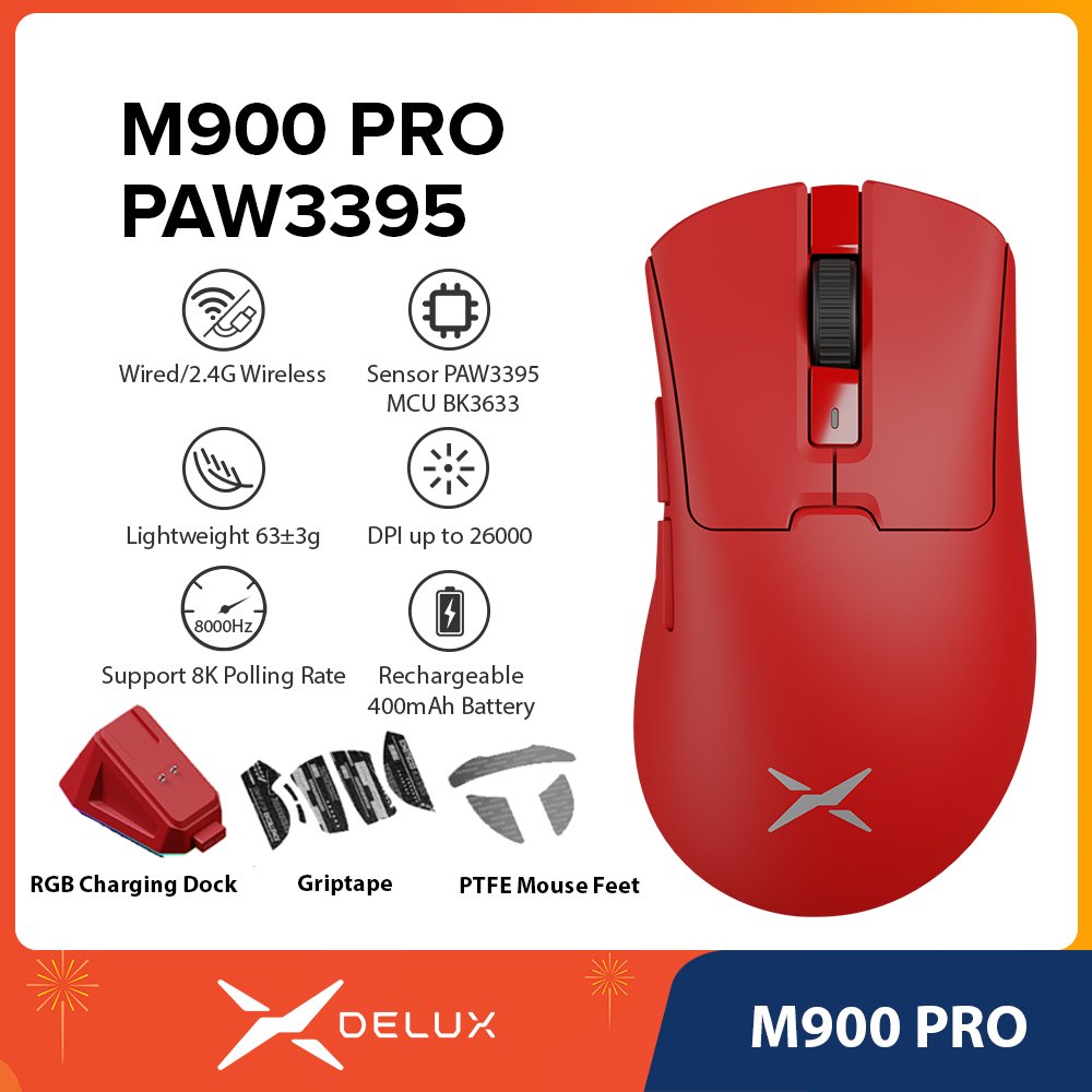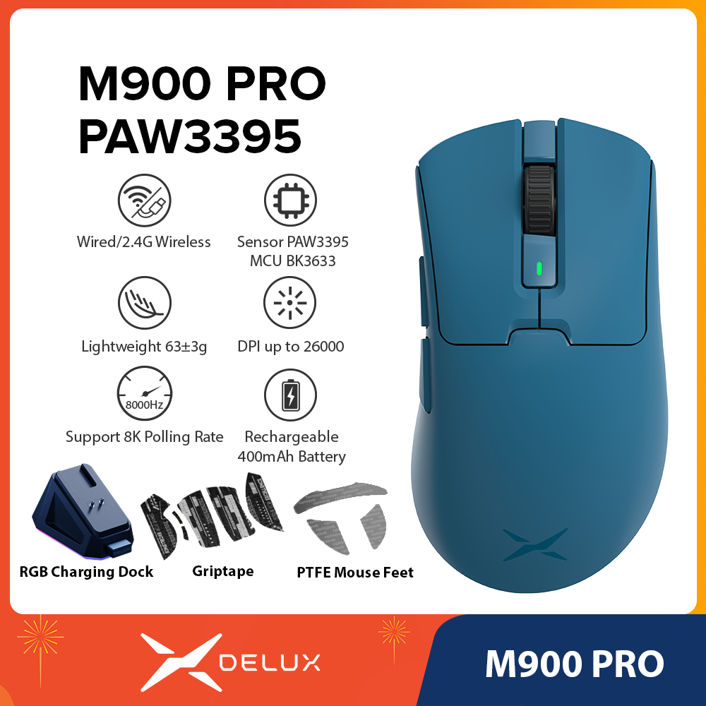 Delux M900 PRO PAW3395 Mouse Para Jogos Azul DPI MAX 26000 Com Fio 2.4G Sem Recarregável Base De Carregamento Magnética