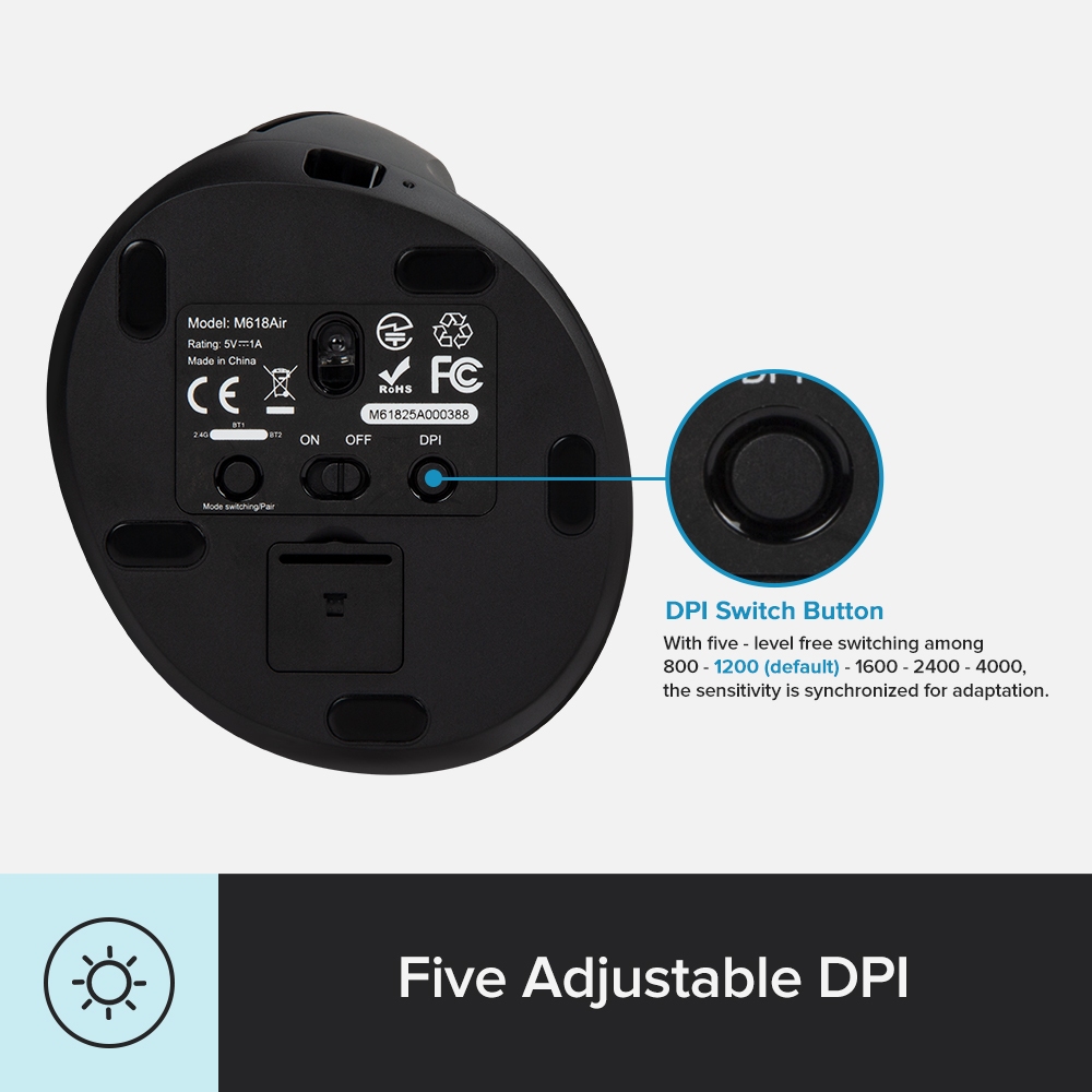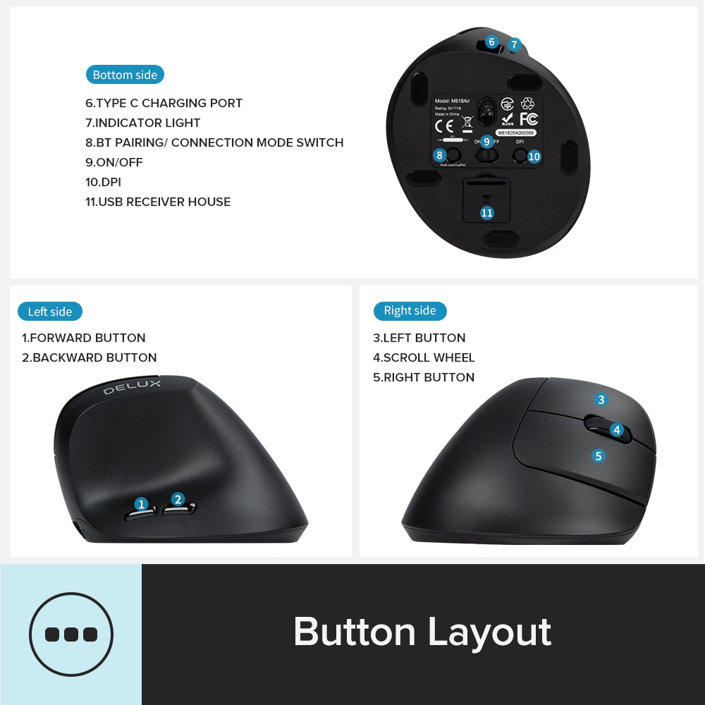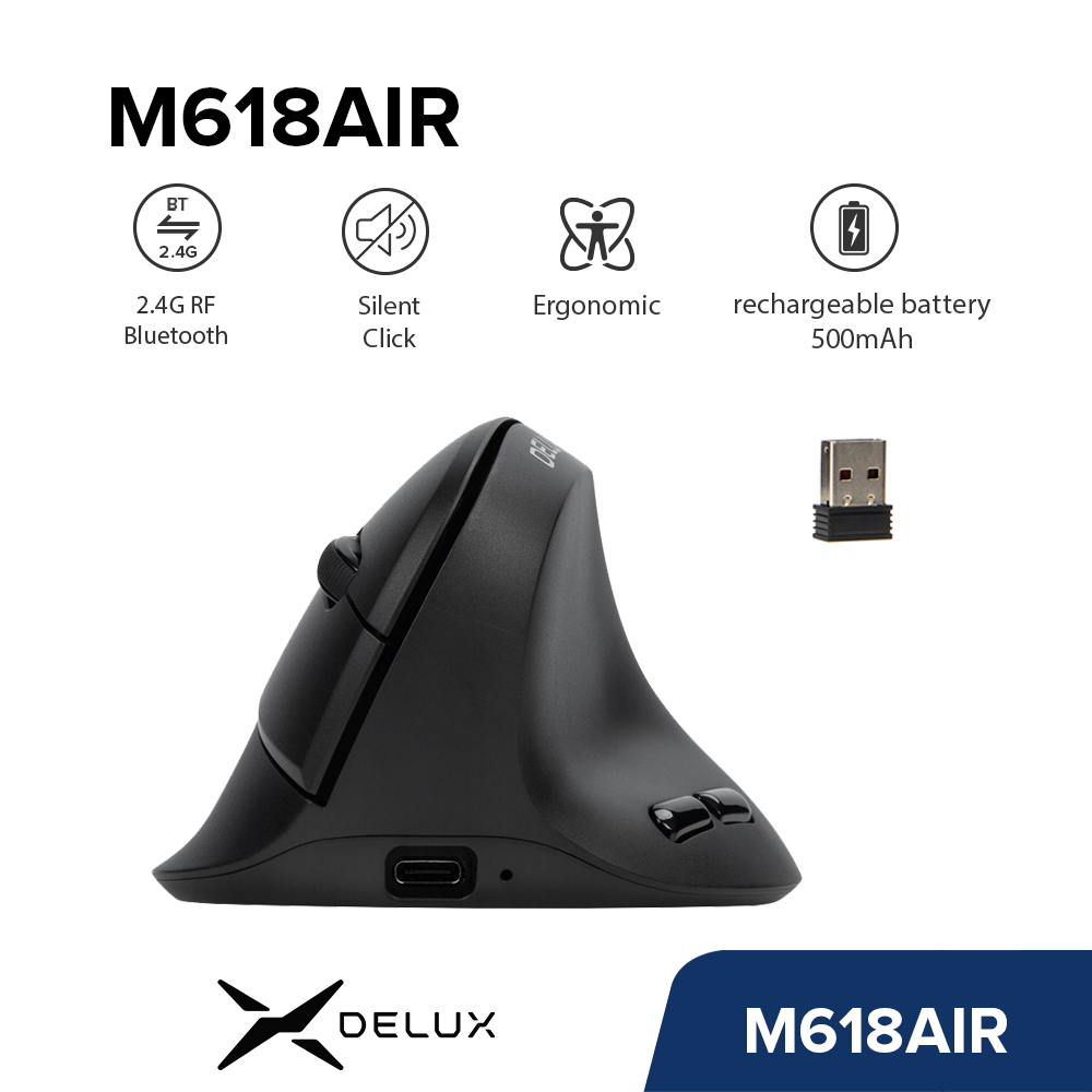 Delux M618AIR Mouse Vertical Recarregável Sem Fio Bluetooth Ergonômico MAX 4000 DPI 6 Botões Clique Silencioso Para Mãos