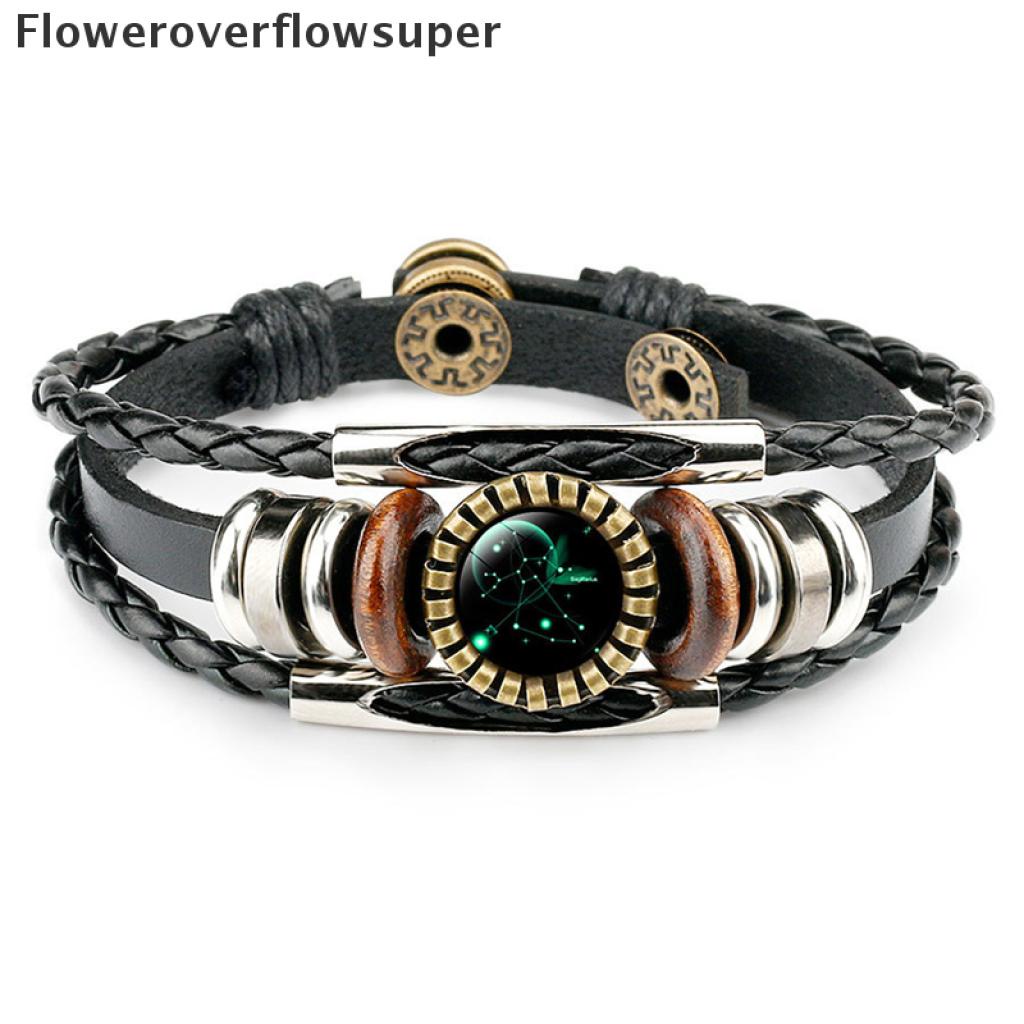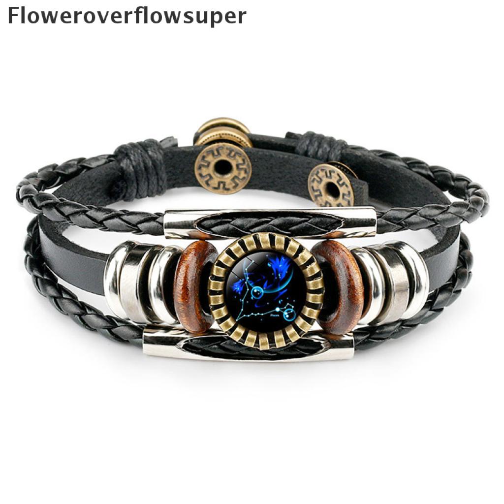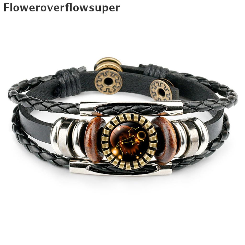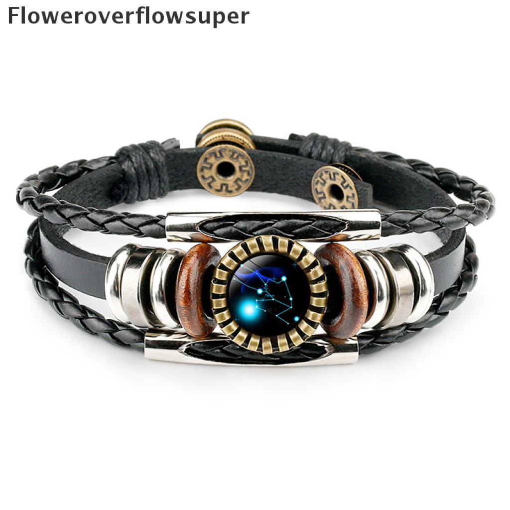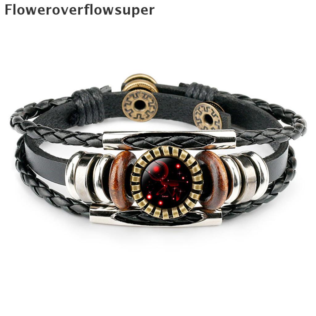 [Nobre Vida] 12 Constelação Zodíaco Sinal De Couro Trançado Preto Câncer idro Cúpula Jóias Punk Homens