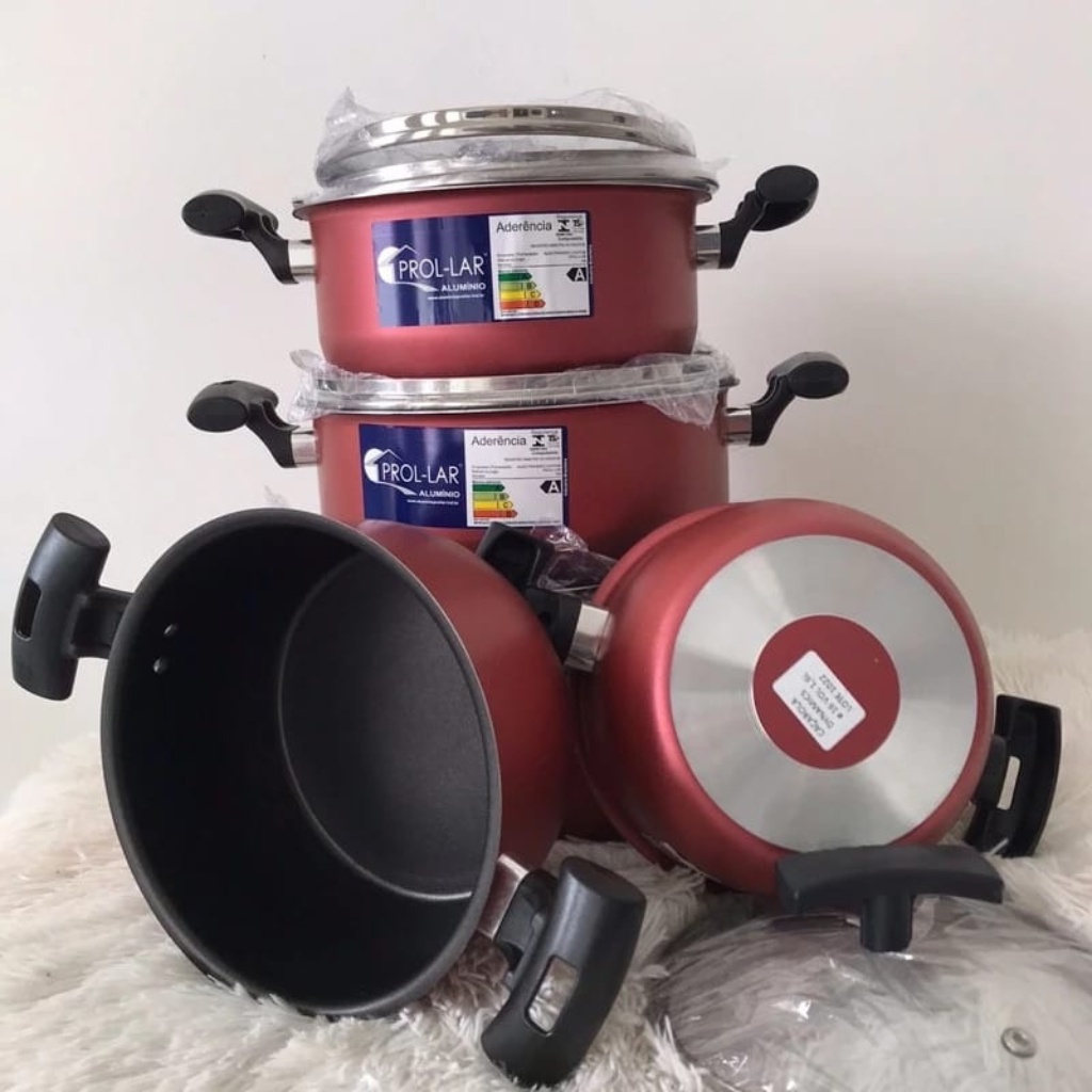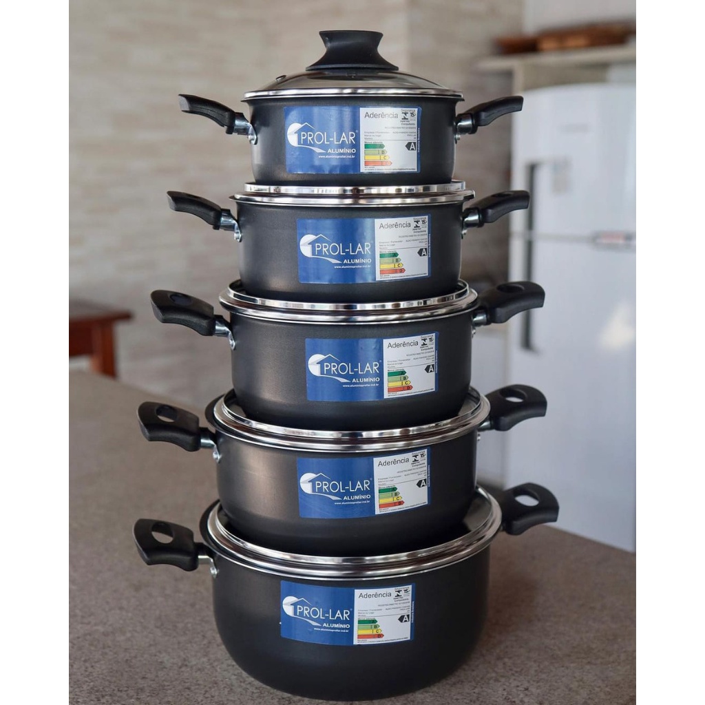Conjunto Jogo Panelas Antiaderente Teflon 5 Peças Tampa de Vidro Borda Inox Selo de Qualidade Inmetro Dynamics Prollar Alumínio