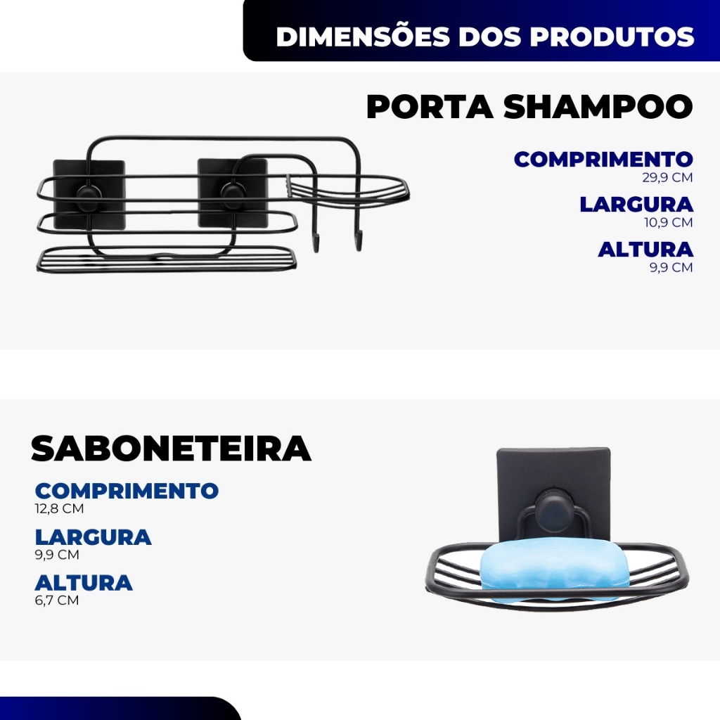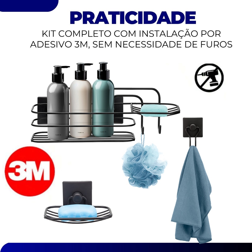Kit 3 Pecas Acessorios Banheiro Saboneteira Gancho Porta Shampoo Fixacao 3m Sem Furo Preto Arthi