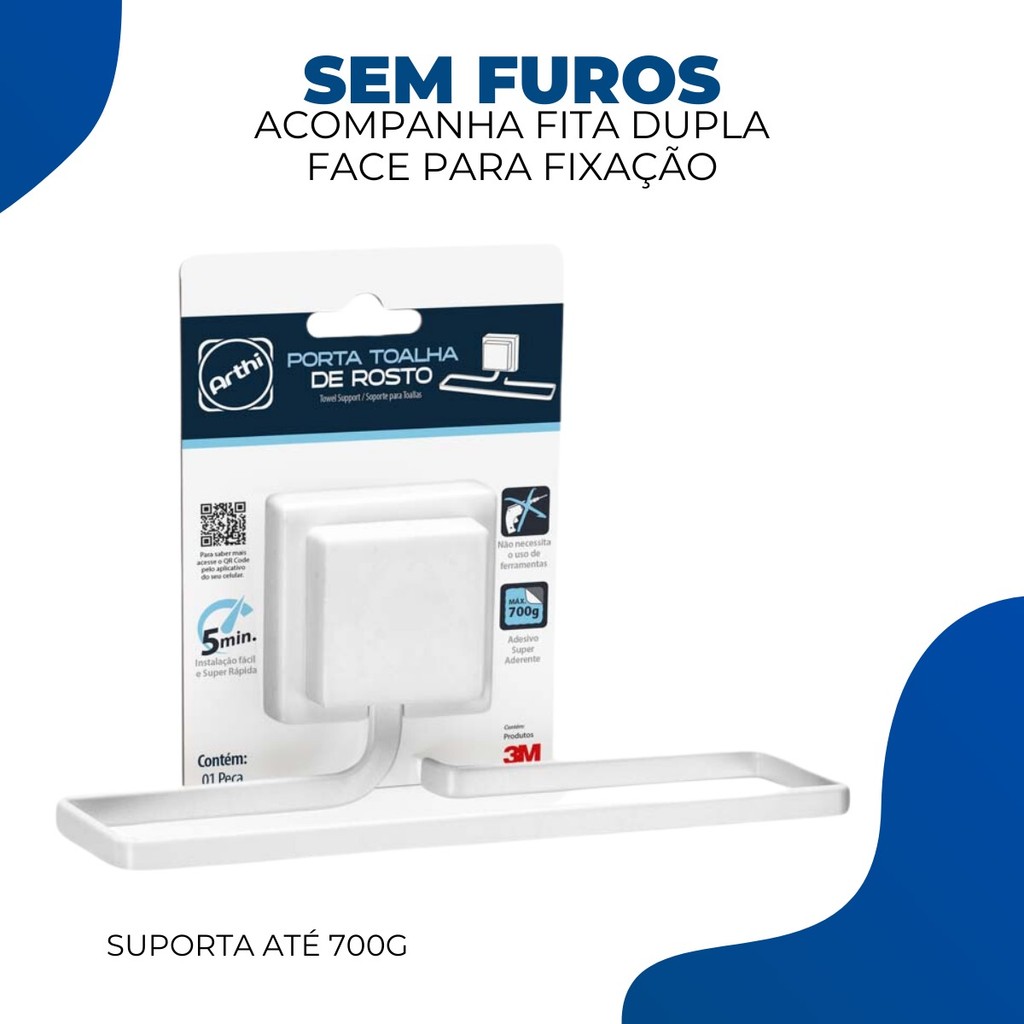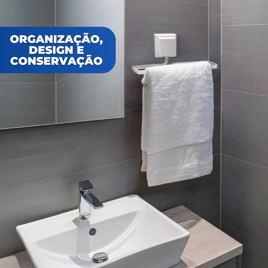 Porta Toalha de Rosto Barra Banheiro Lavabo Toalheiro Sem Furo Fixação Dupla Face Branco Arthi