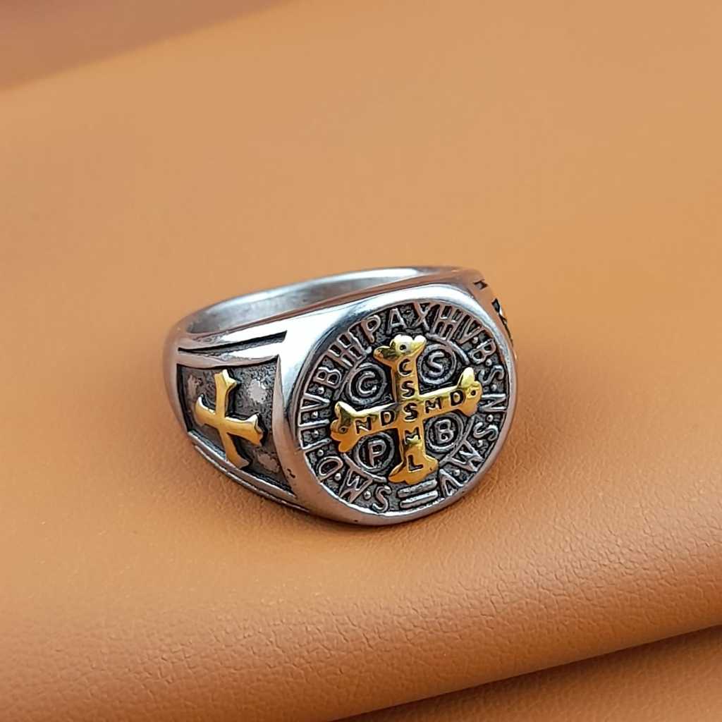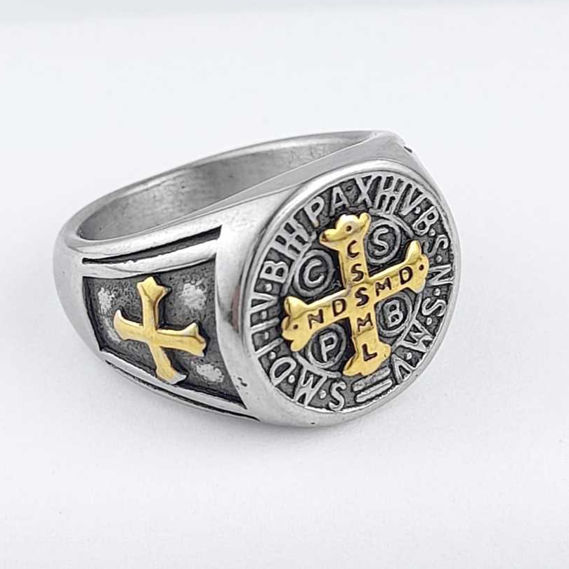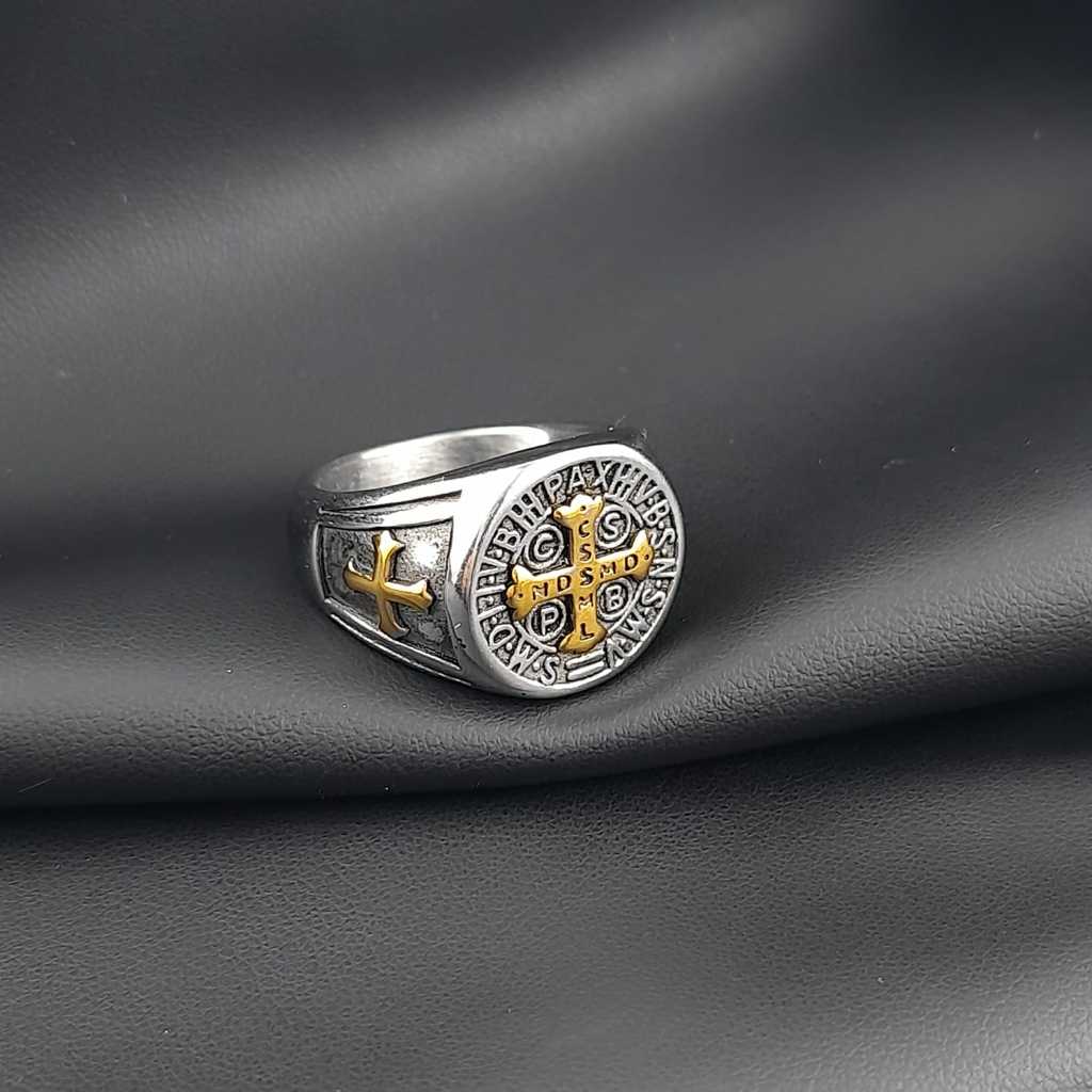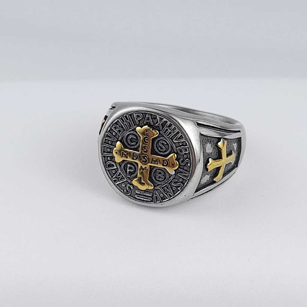 Anel Escudo São Bento Duas Cor Cruz Dourada