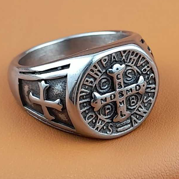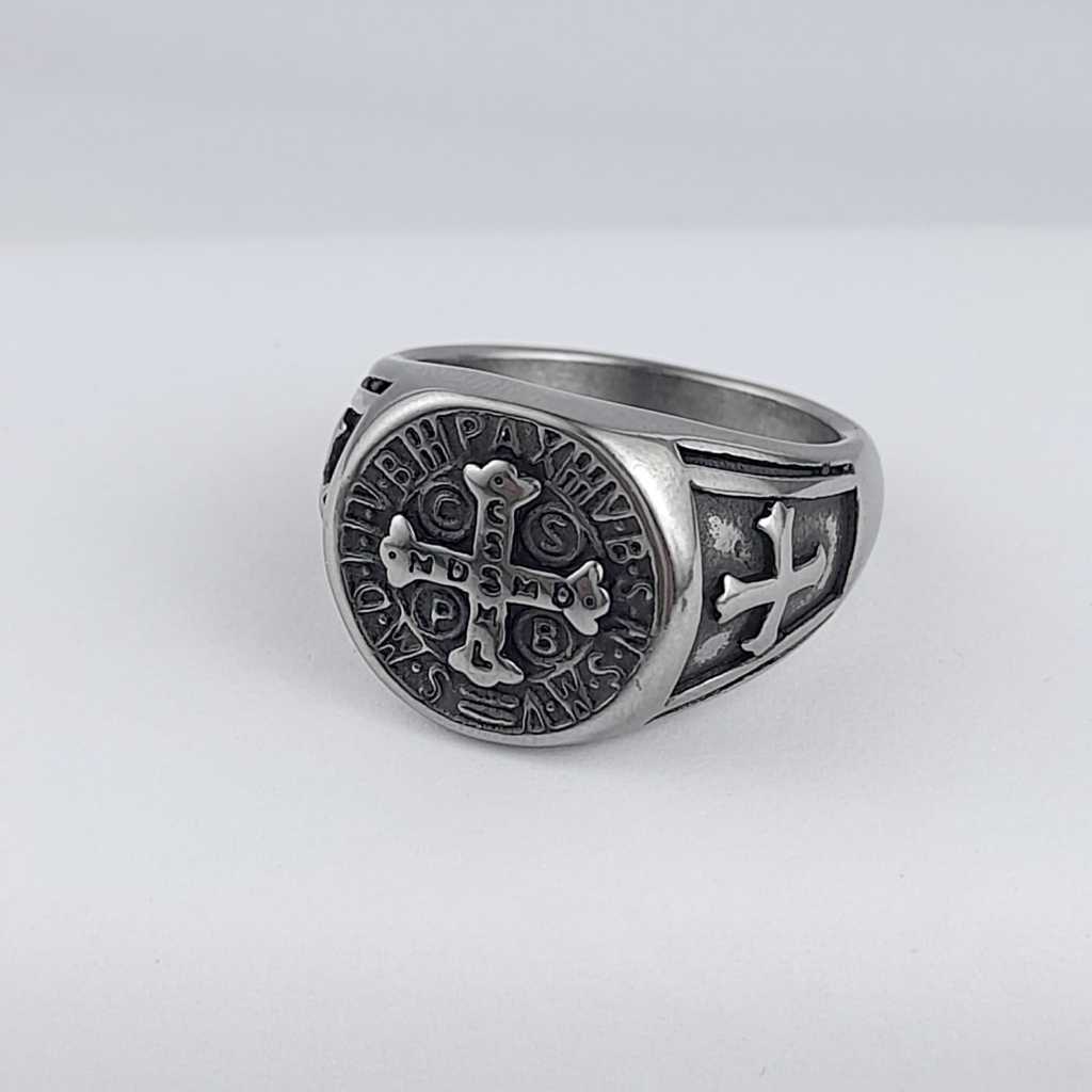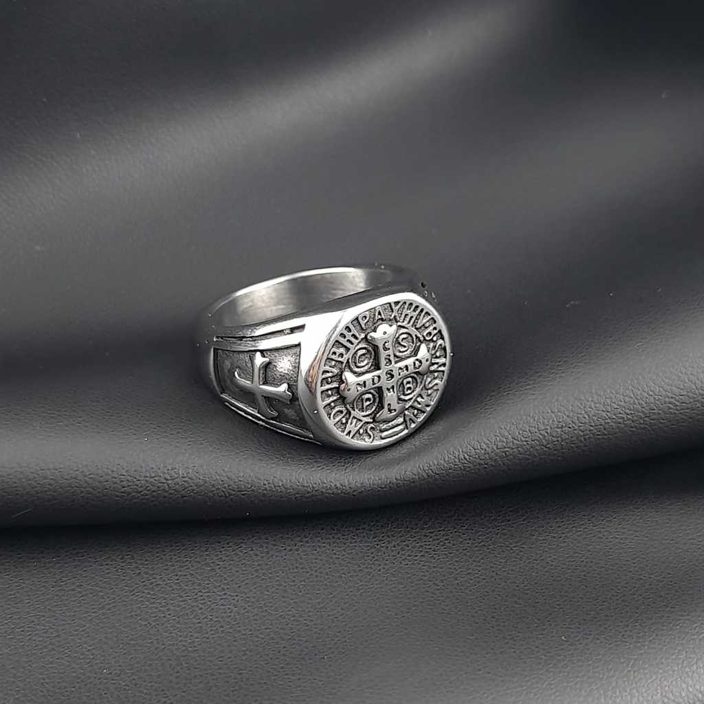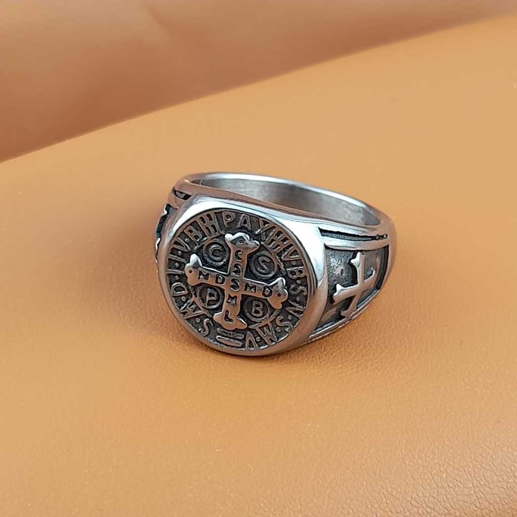 Anel Masculino São Bento Em aço escovado gravado em alto relevo maciço