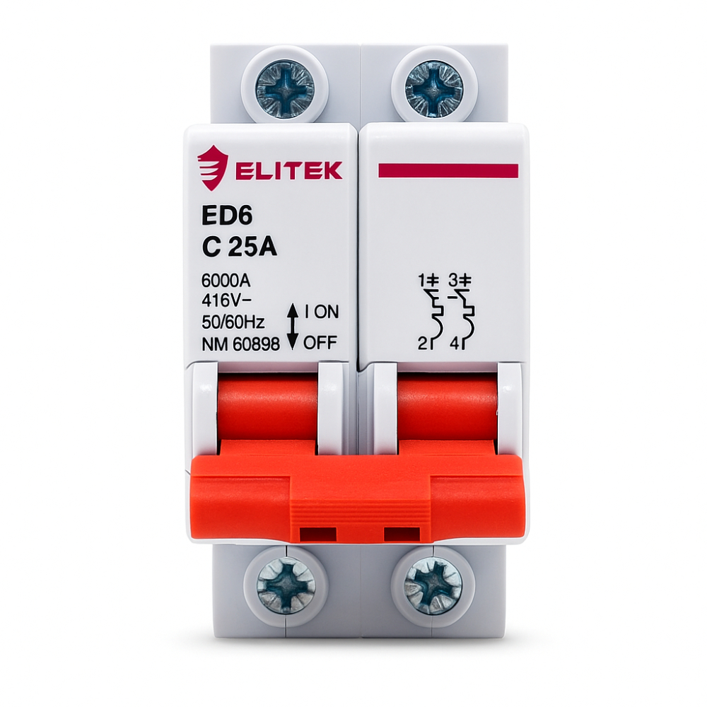 Disjuntor Bipolar Duplo Bifasico 2 Polos16a, 20a, 25a, 32a, 40a, 50a, 63a, Din ED6 Elitek