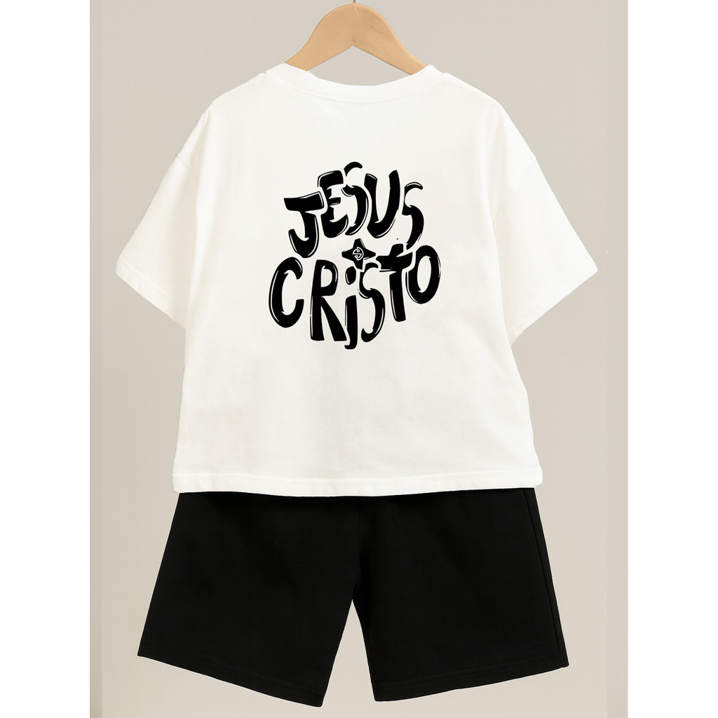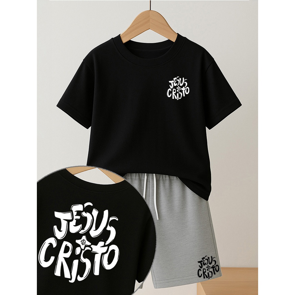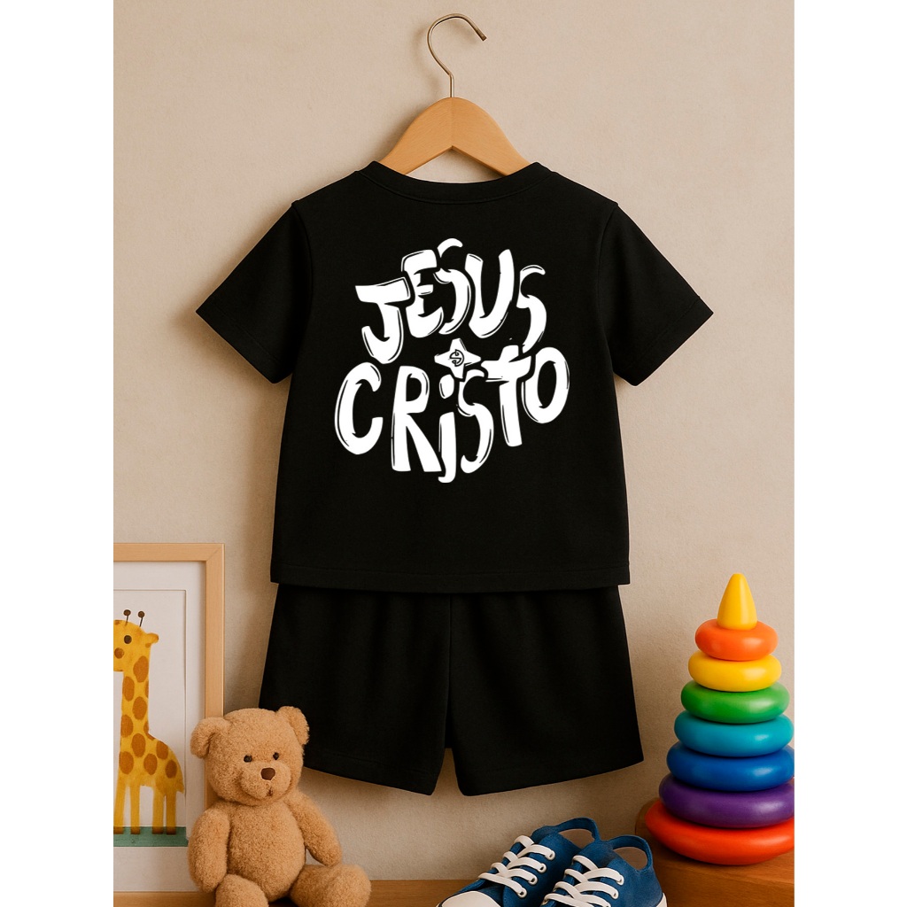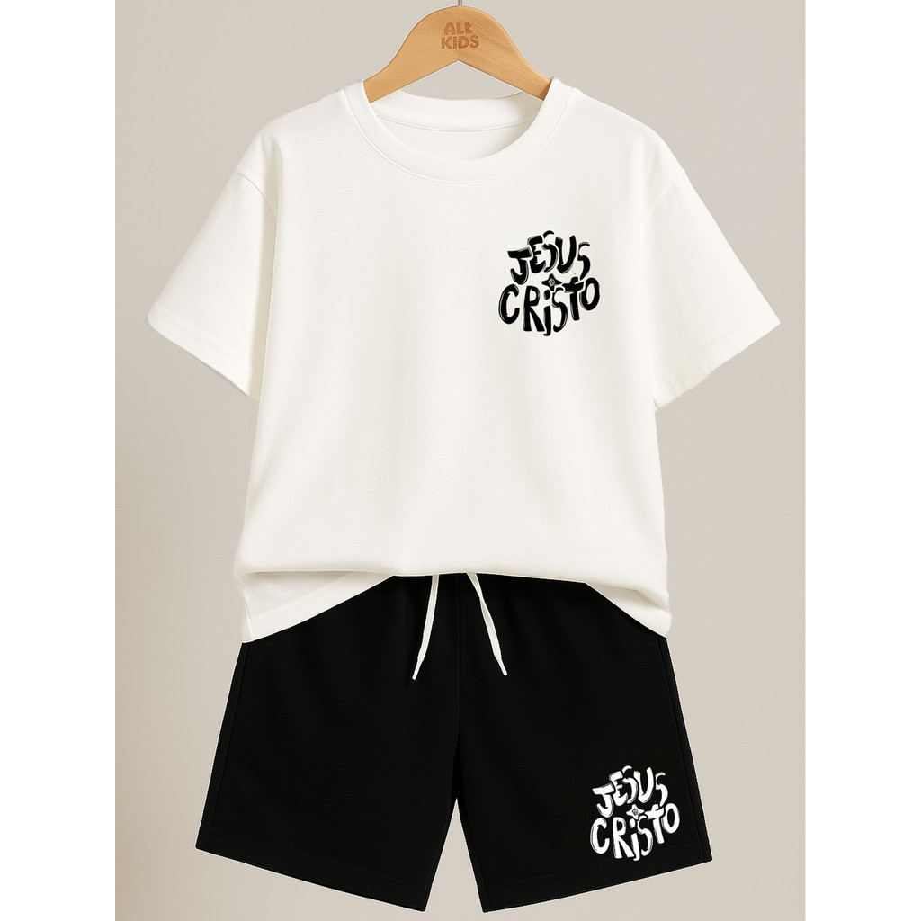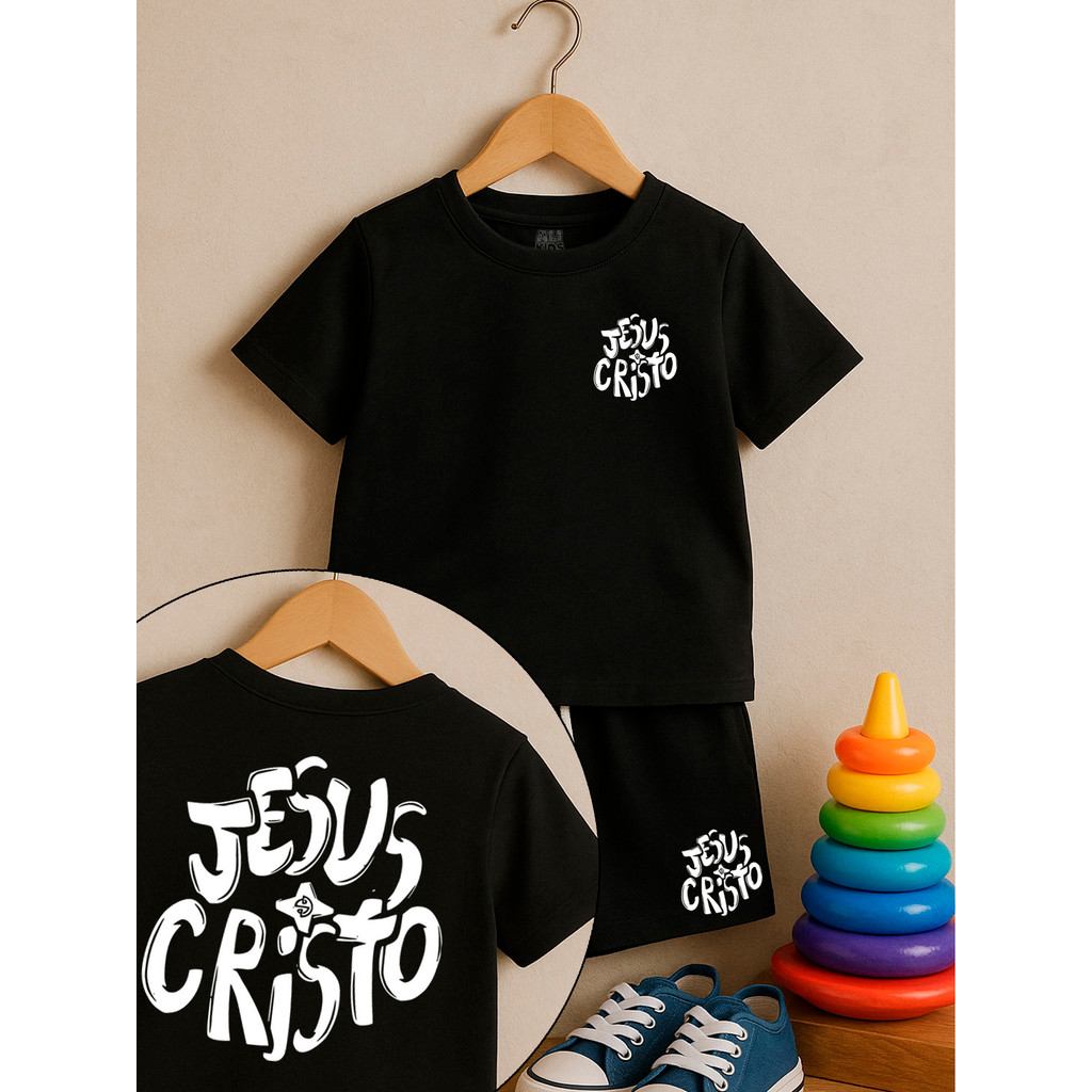 Conjunto Camisa Shorts para Crianças Gospel Roupa Infantil Juvenil Jesus Cristo 4 ao 16 abis
