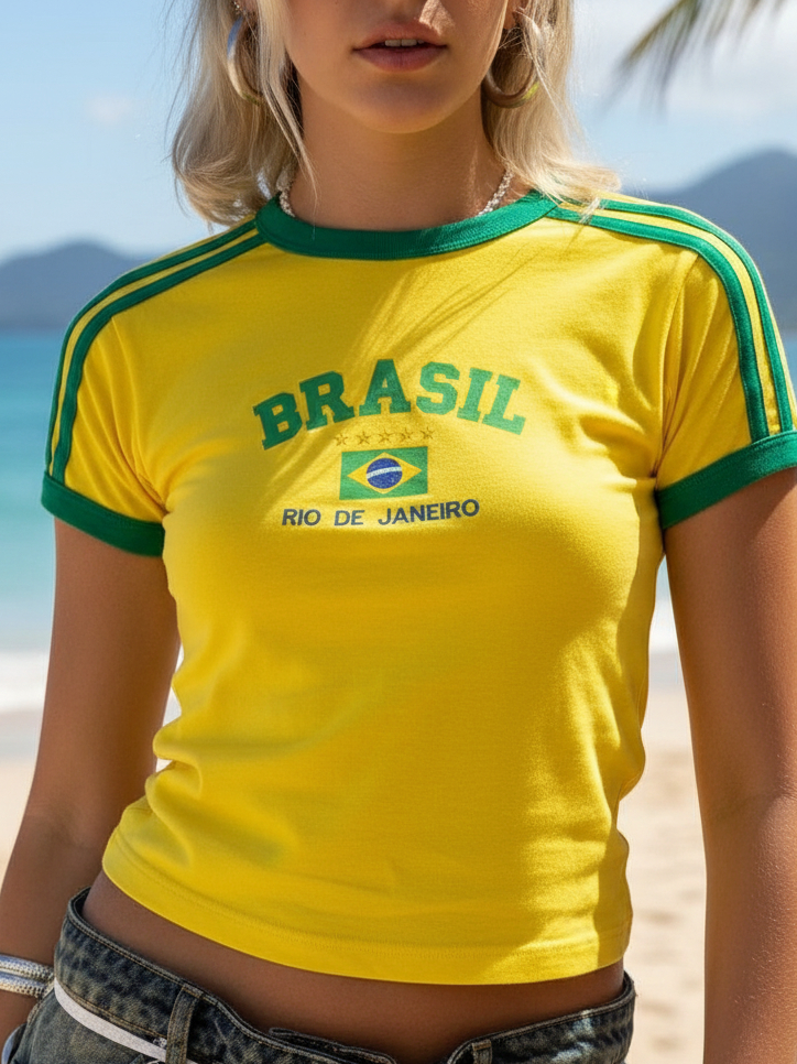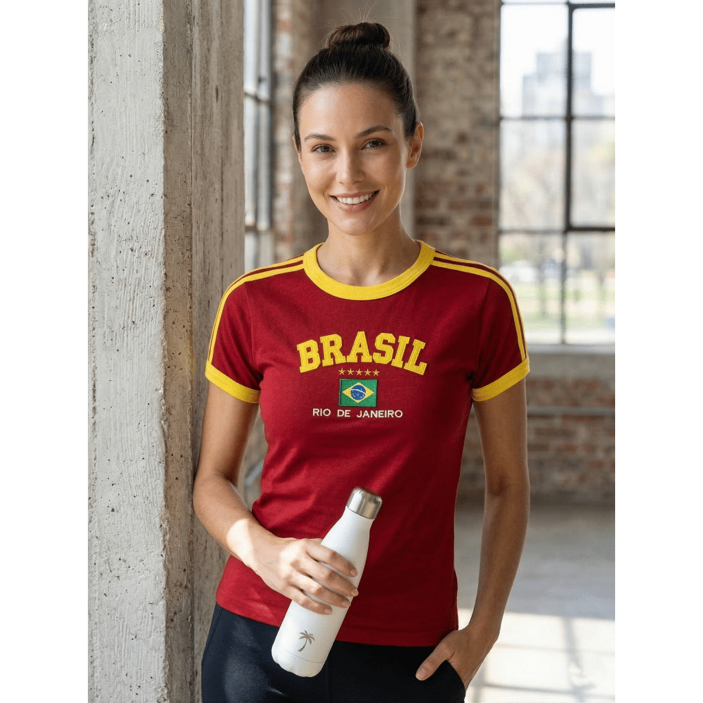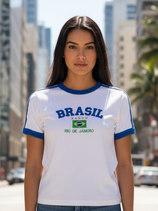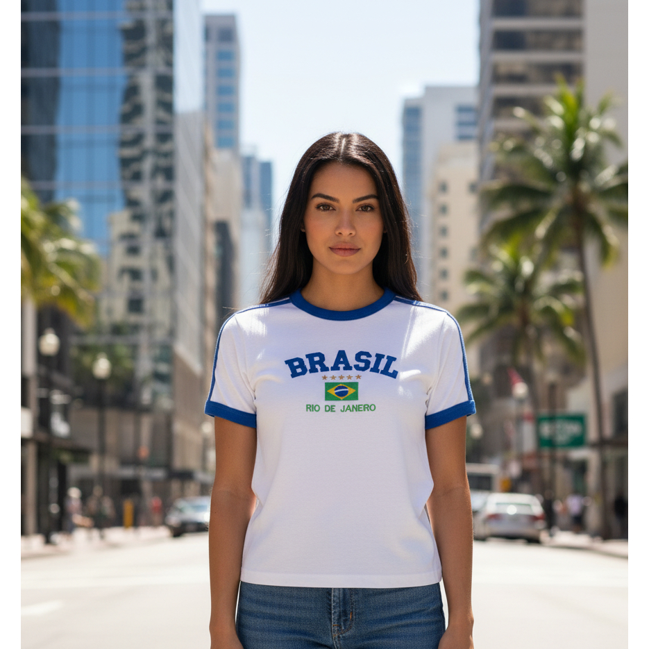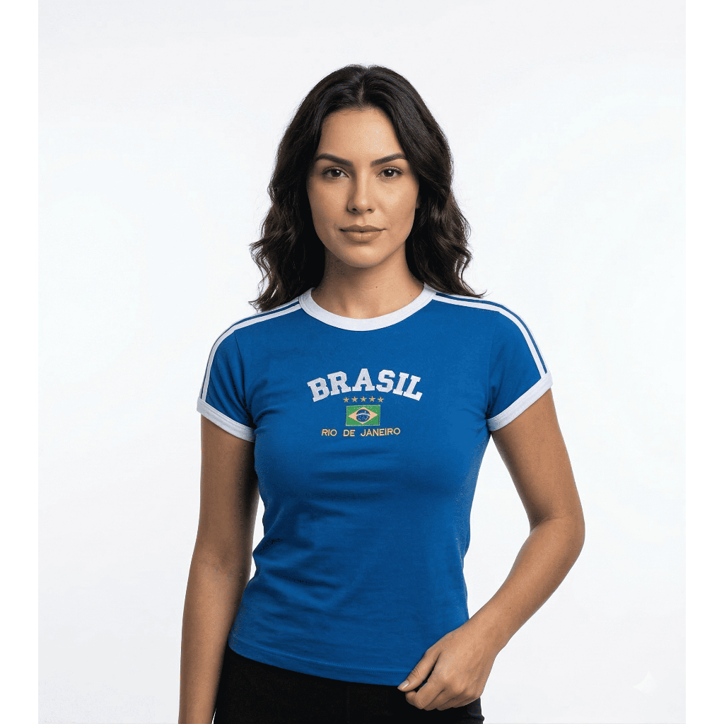 Camisa Brasil Bordada BabyLook Feminina